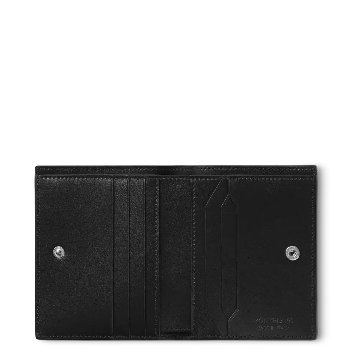La cartera Meisterstück Compact con seis ranuras para tarjetas está fabricada con una nueva piel negra de brillo intenso. Su nuevo diseño interior geométrico puro realza la esencia de la funcionalidad, con múltiples ranuras para tarjetas y bolsillos para dinero en efectivo y recibos. Esta cartera se puede llevar cómodamente con una correa para el cuello (se vende por separado) o en el bolsillo.