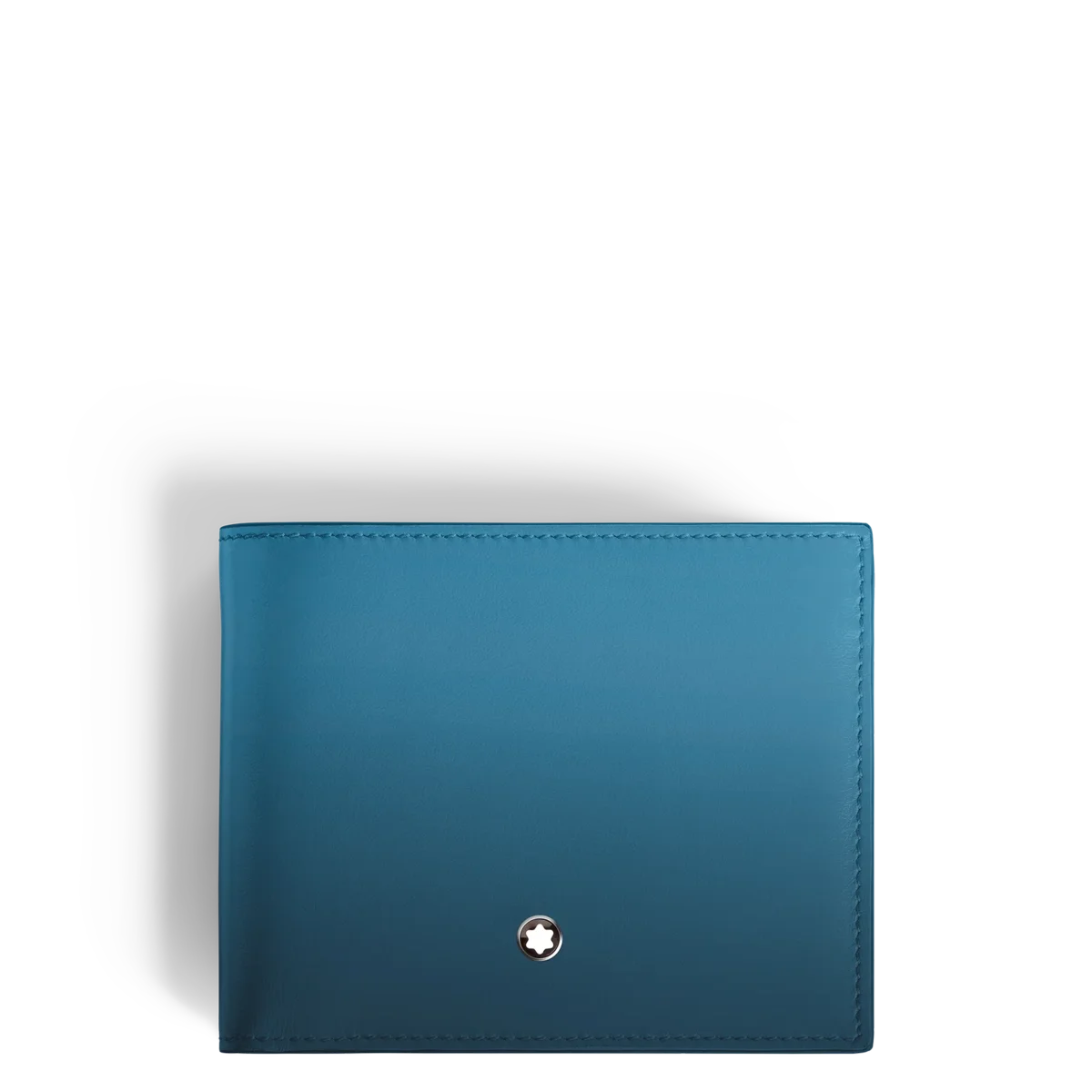 La cartera Meisterstück es un lujoso accesorio para el día a día, confeccionado en piel azul ahumado de gran brillo y realzado con un efecto sfumato aplicado a mano. Elegante y funcional, puede albergar hasta seis tarjetas de crédito en sus ranuras específicas. Dos compartimentos dedicados a billetes y recibos y dos bolsillos adicionales para billetes completan la cartera con espacio de almacenamiento adicional.