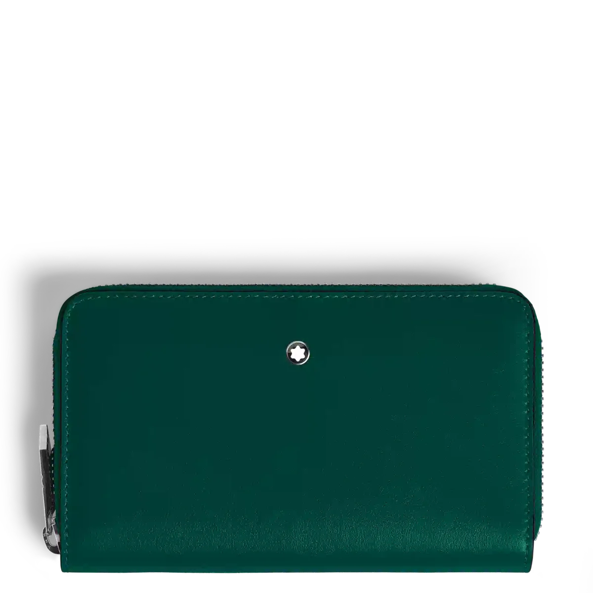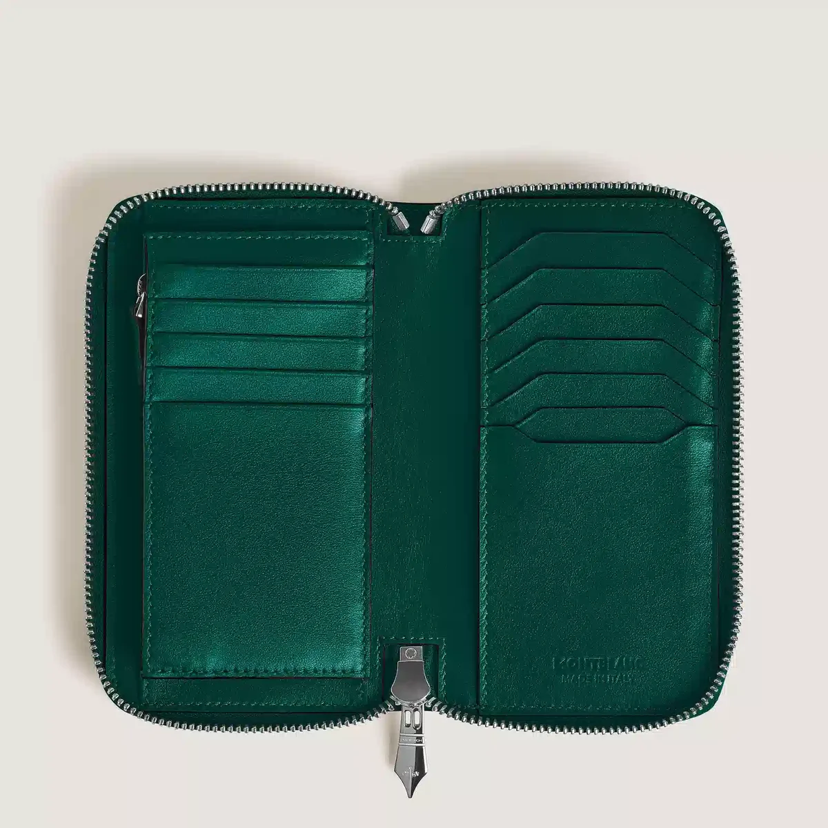 Esta cartera, que combina un diseño elegante con una funcionalidad práctica, es un complemento versátil para cualquier ocasión. Confeccionada en piel de becerro suave de primera calidad en color malaquita, su silueta rectangular de líneas limpias irradia sofisticación. Un tirador inspirado en una plumilla abre la cremallera para revelar tres compartimentos para billetes, un monedero con cremallera, tres bolsillos para objetos pequeños esenciales y ranuras con capacidad para 12 tarjetas de crédito, lo que garantiza una organización sin esfuerzo con un estilo refinado.