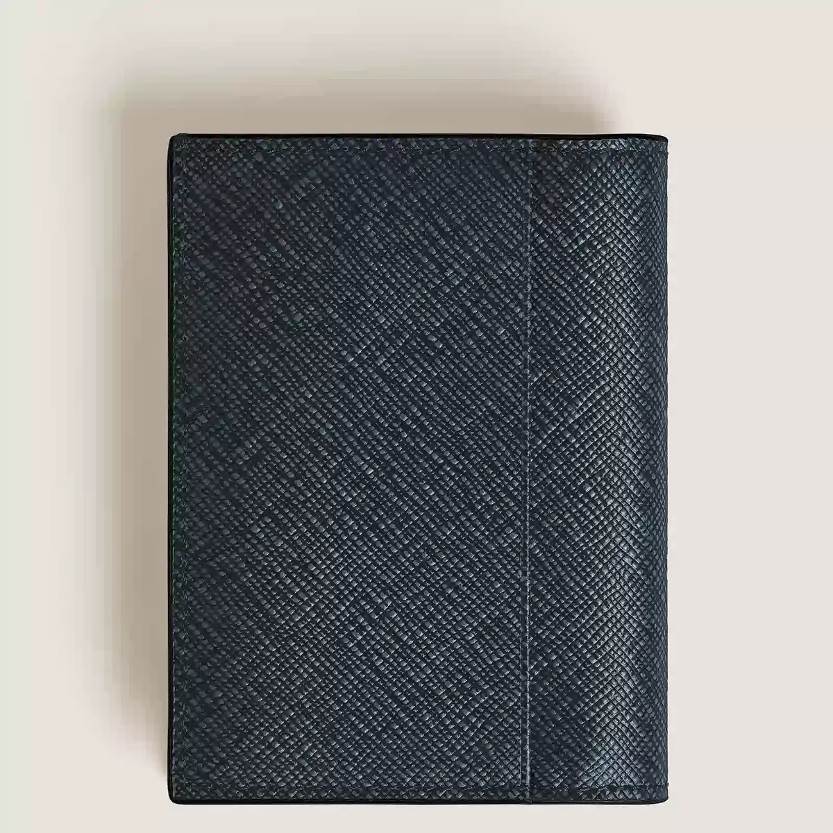 Compacta y elegante, esta mini cartera está confeccionada en piel repujada con una elegante combinación de azul y negro. Ideal para quienes prefieren viajar ligeros, su elegante silueta se abre para revelar tres ranuras para tarjetas de crédito, un compartimento para billetes y dos bolsillos adicionales, lo que garantiza que puedas llevar todo lo esencial con facilidad y sofisticación.