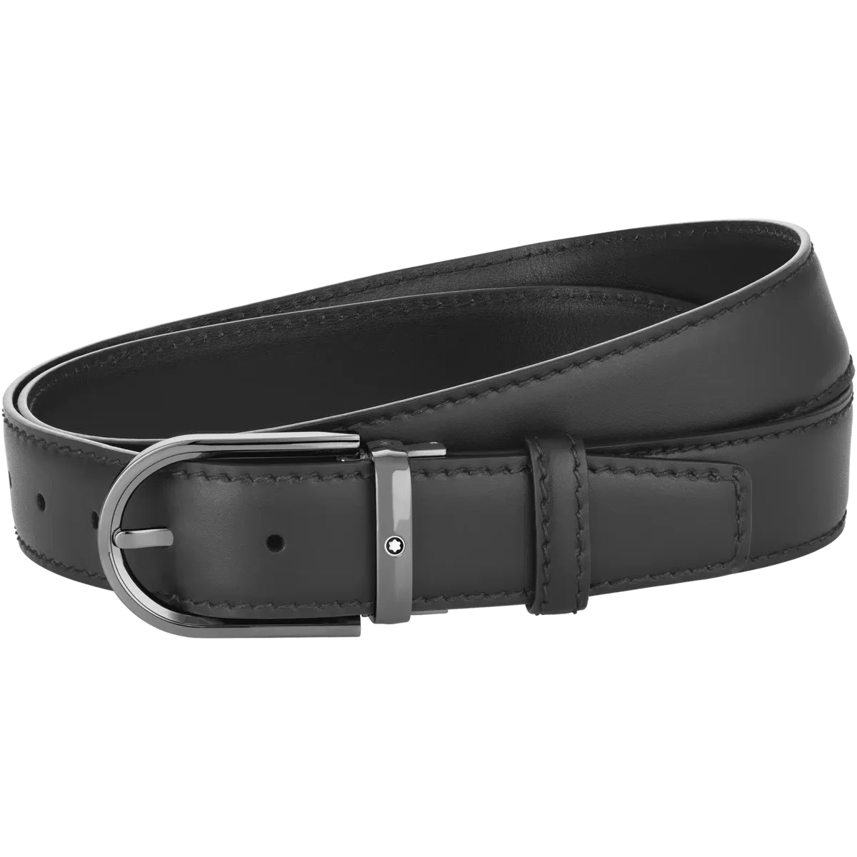 Hebilla con acabado en rutenio brillante en forma de herradura. Autoajustable, 3,5 cm x 120 cm, con correa de cuero negro y costuras pricker. Diseñado para un look clásico con un toque diferente.