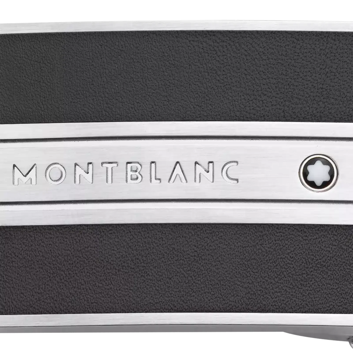 Hebilla rectangular con acabado paladio mate y diseño Meisterstück, nombre de la marca Montblanc y emblema Montblanc grabados, 3 cm x 120 cm, correa reversible de cuero negro y marrón. Diseñada para un look informal pero elegante.