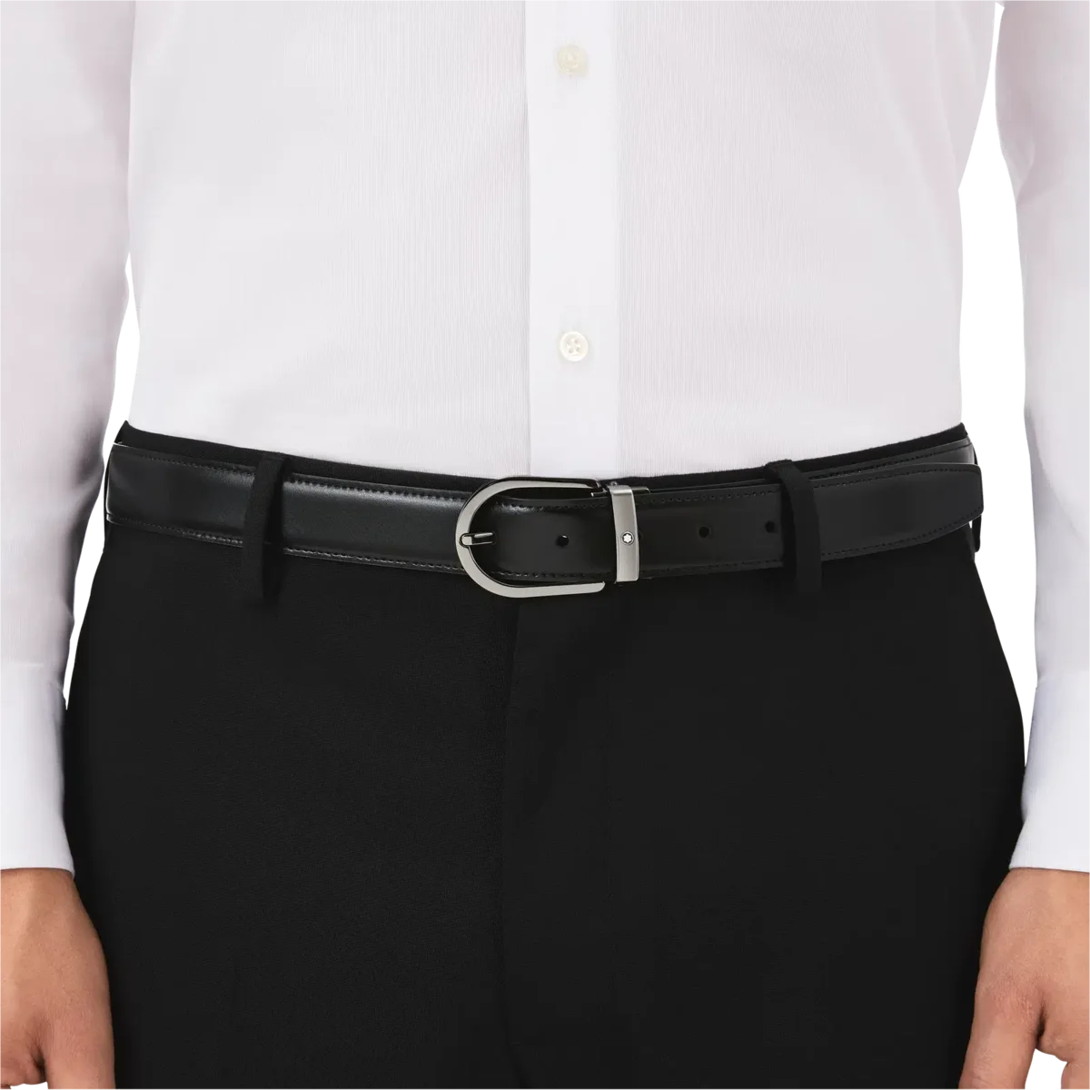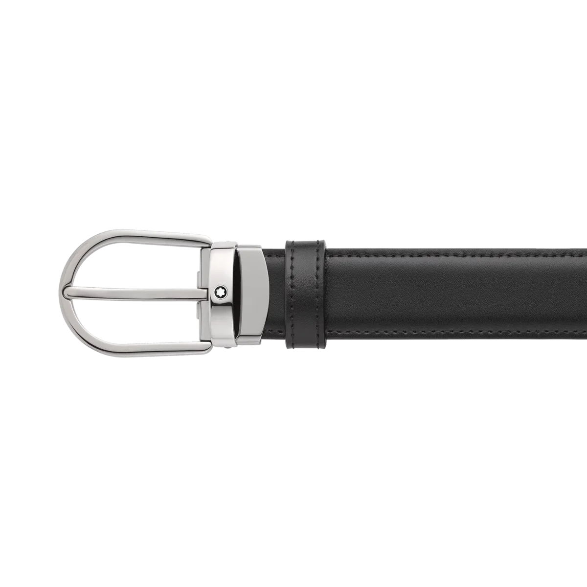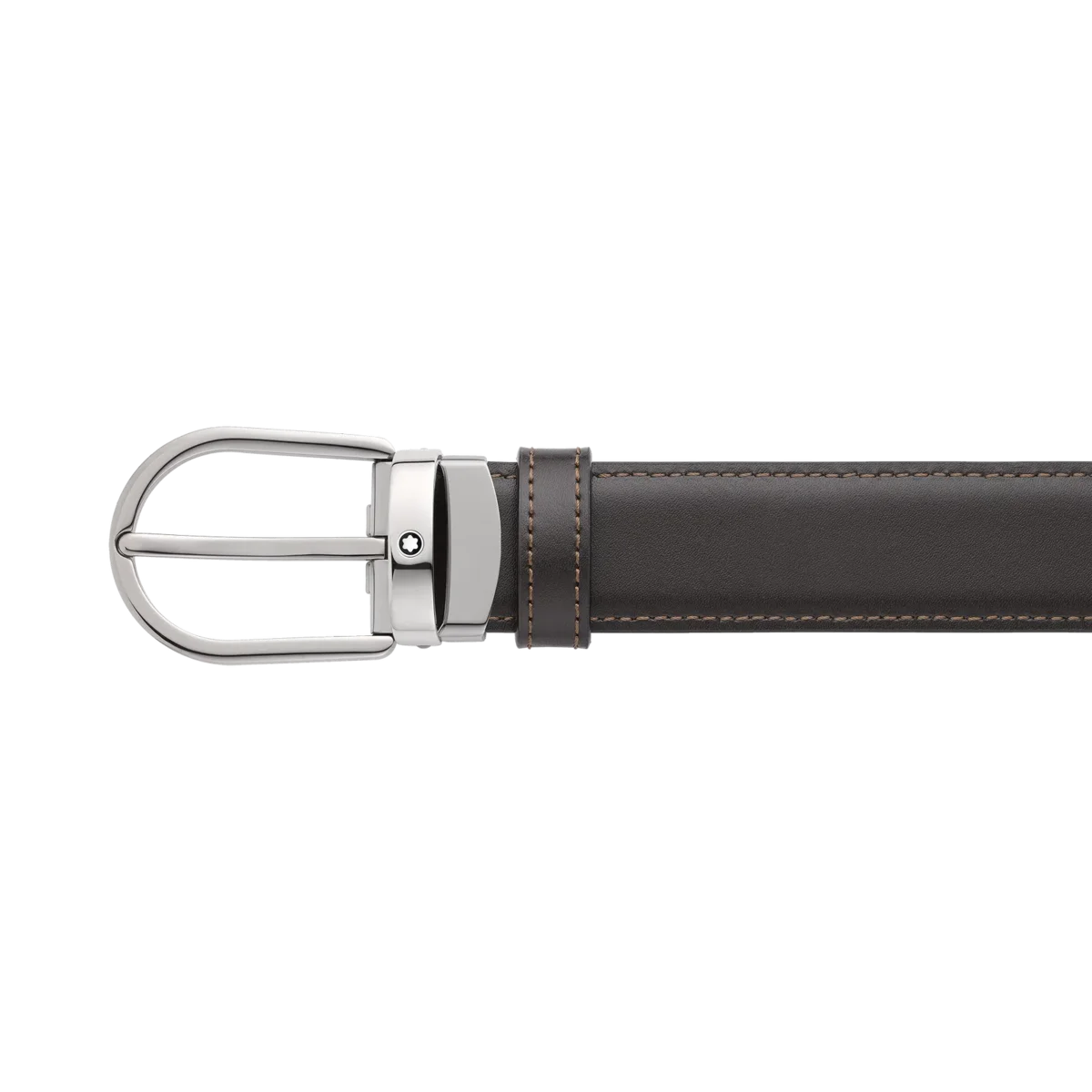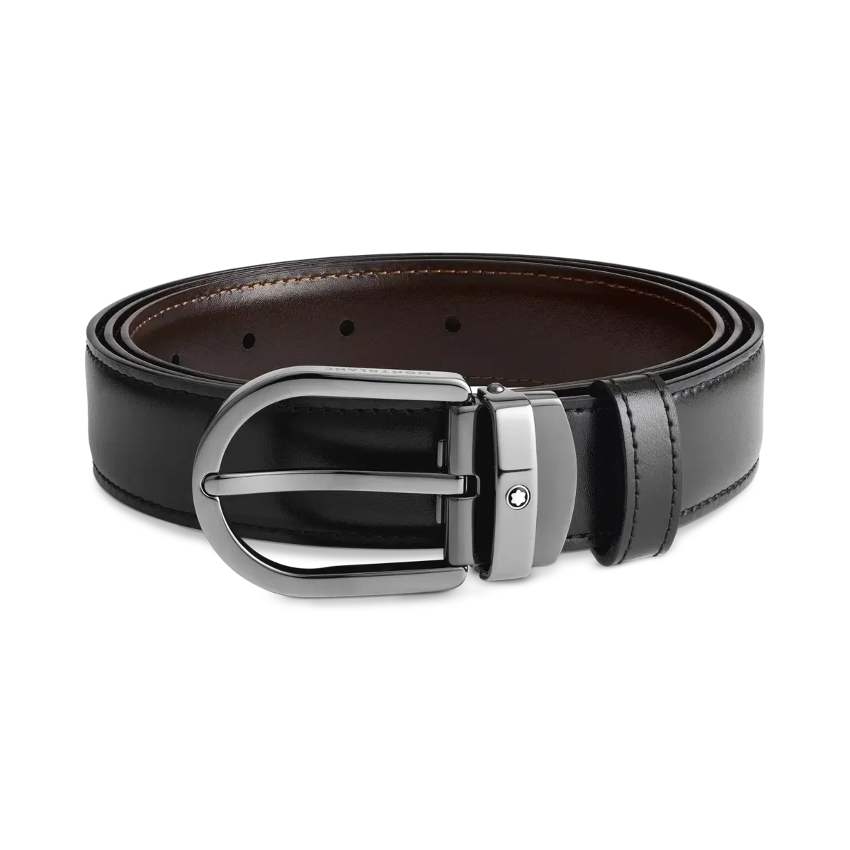 Descubra todos los detalles del cinturón de cuero reversible negro/marrón con hebilla en forma de herradura de 30 mm. Compre online en la tienda oficial de Montblanc.