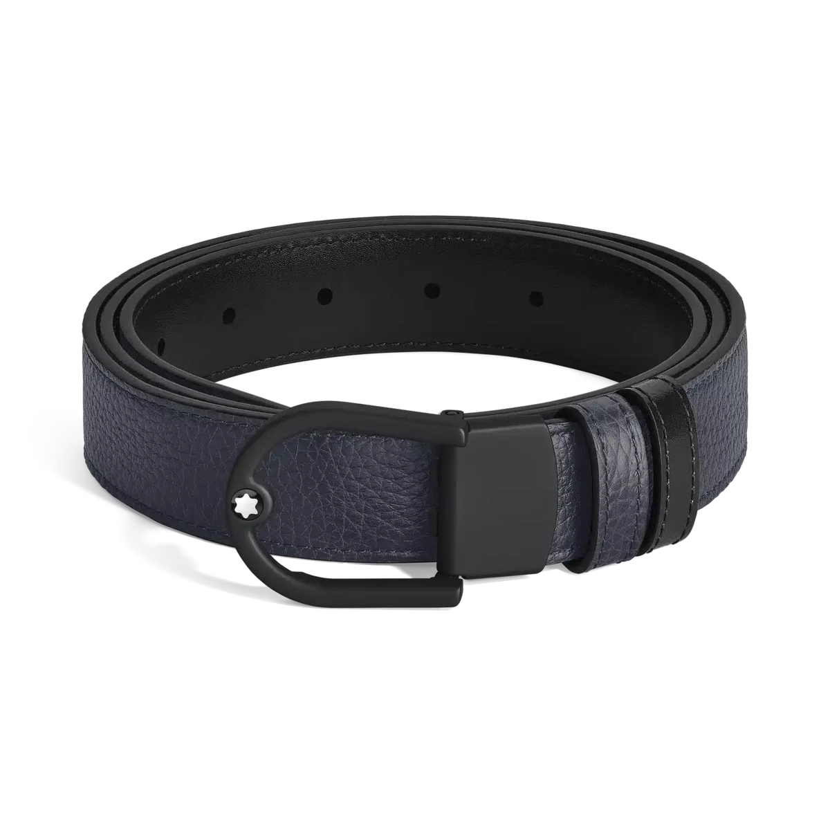 Este cinturón reversible de 30 mm combina la elegante silueta de una hebilla con acabado PVD engomado con la versatilidad de dos correas de piel distintas. Con líneas limpias y curvas, la hebilla en forma de herradura añade un toque de sofisticación moderna a su estilo. La correa del cinturón ofrece versatilidad y un estilo refinado, con dos looks distintos en un solo accesorio: mientras que un lado presenta cuero granulado en un intenso tono azul medianoche, el reverso cuenta con elegante cuero Meisterstück negro para un acabado atemporal y pulido.