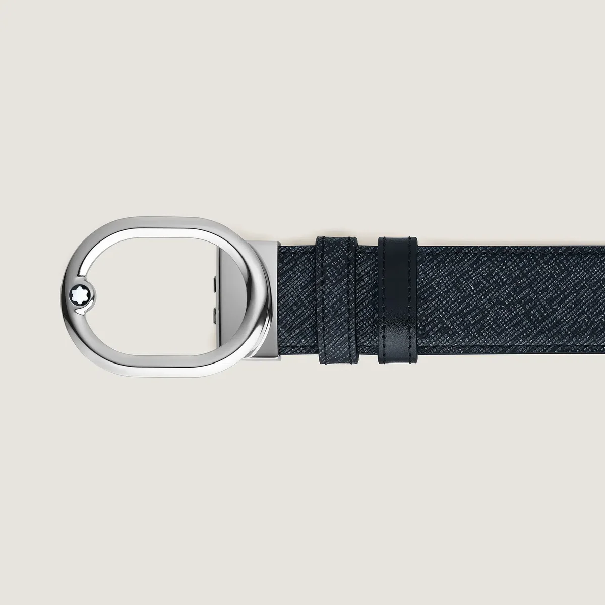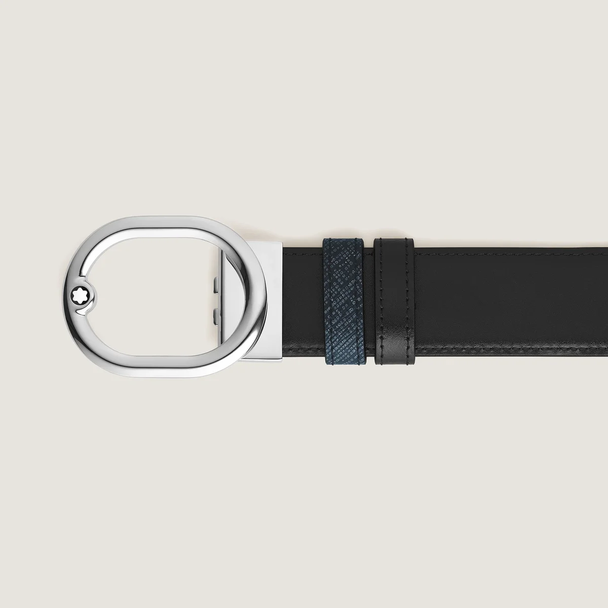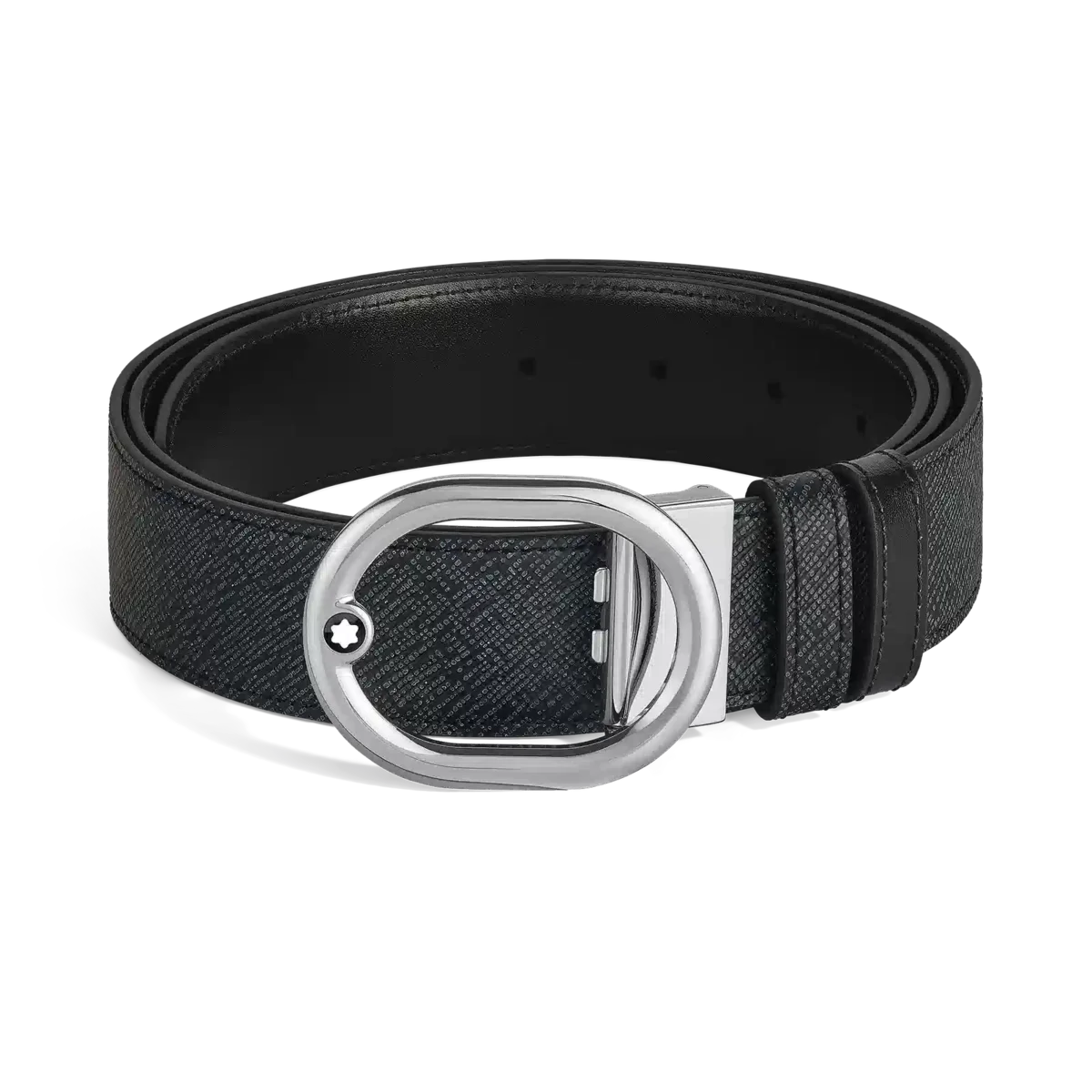El cinturón reversible L’Ovale de 35 mm combina la elegancia de una hebilla ovalada con acabado de paladio con la versatilidad de dos correas de piel distintas. La hebilla, que se aleja de los diseños cuadrados tradicionales, añade un toque de frescura a su estilo. La correa del cinturón ofrece dos opciones: un lado presenta piel de becerro estampada Sartorial azul tweed para un aspecto cálido y con textura, mientras que el reverso presenta piel Meisterstück negra, lo que proporciona una opción clásica y sofisticada para cualquier ocasión.