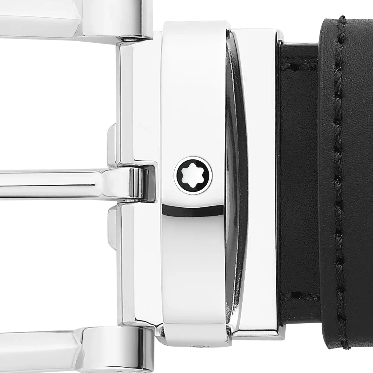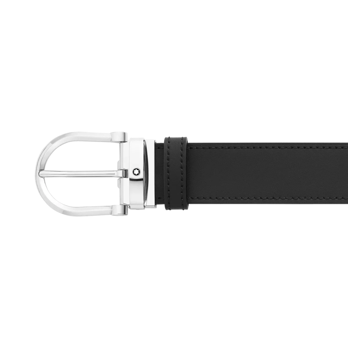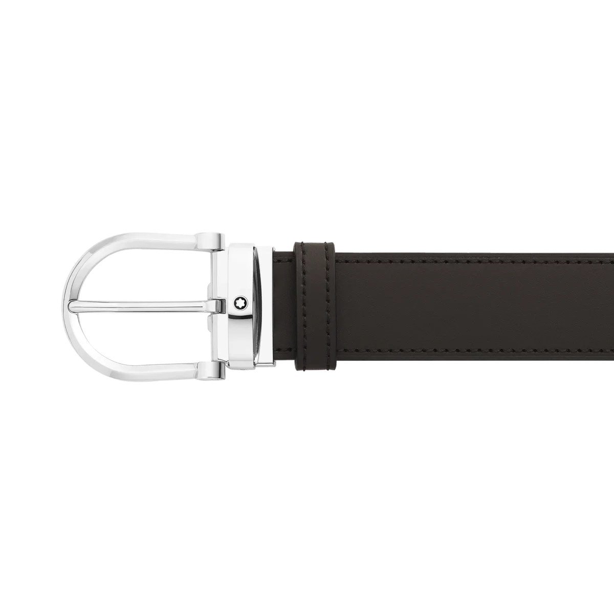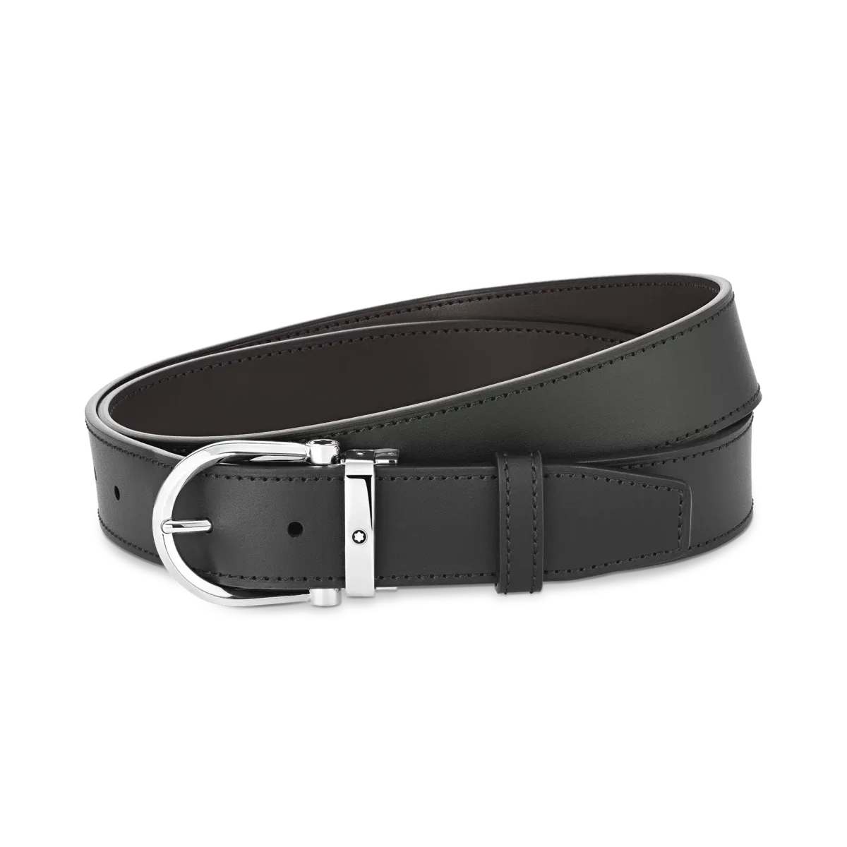 Hebilla de acero inoxidable brillante con forma de herradura. Correa de cuero reversible, autoajustable, de 3,5 cm x 120 cm, en negro y marrón. Informal y sofisticada. Identificación n.º MB128783. Dimensiones 1200 mm * 35 mm * 5 mm