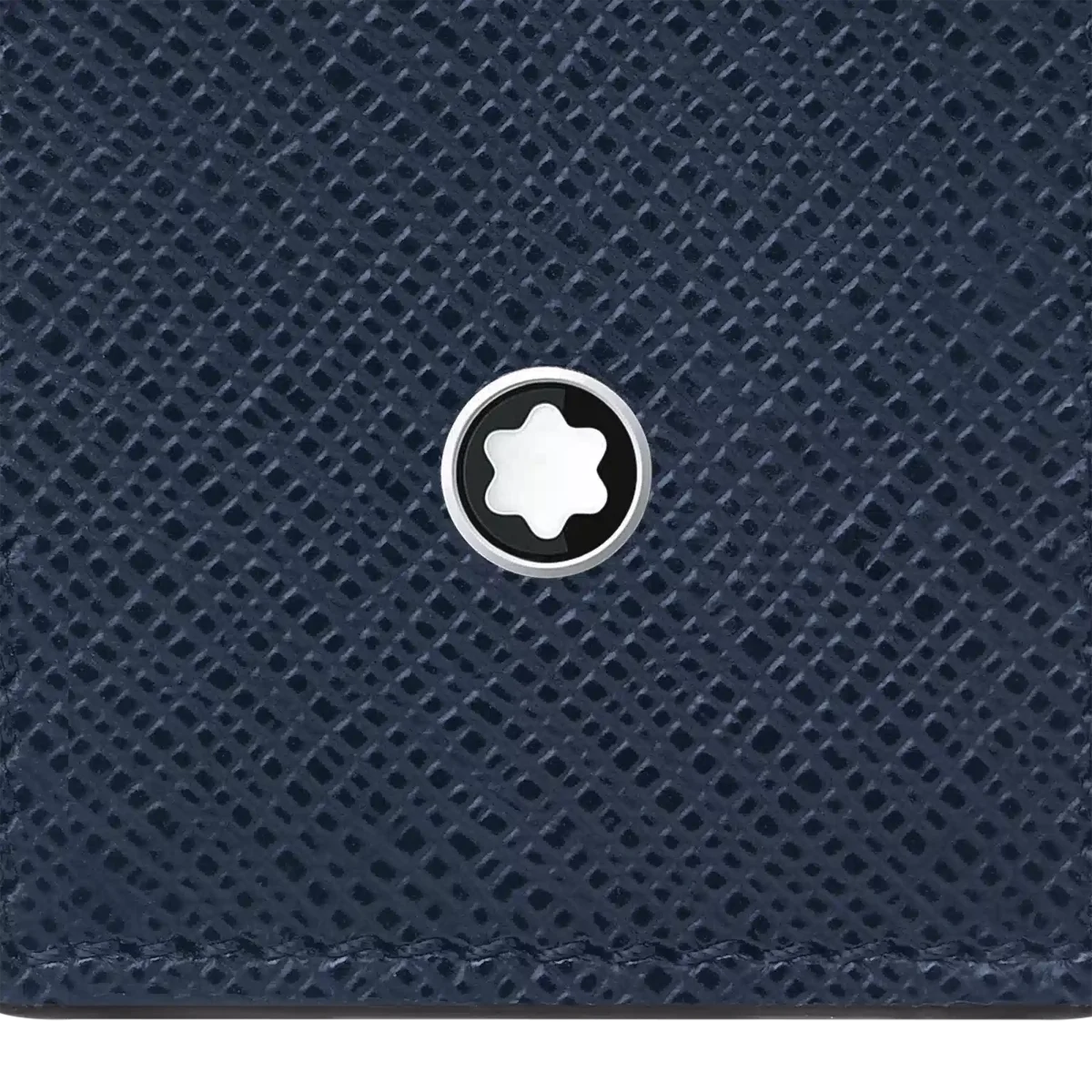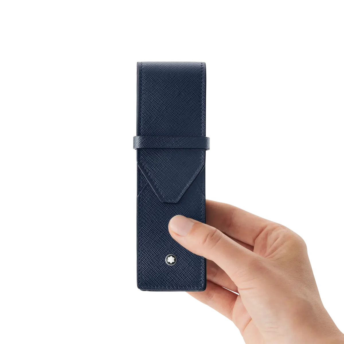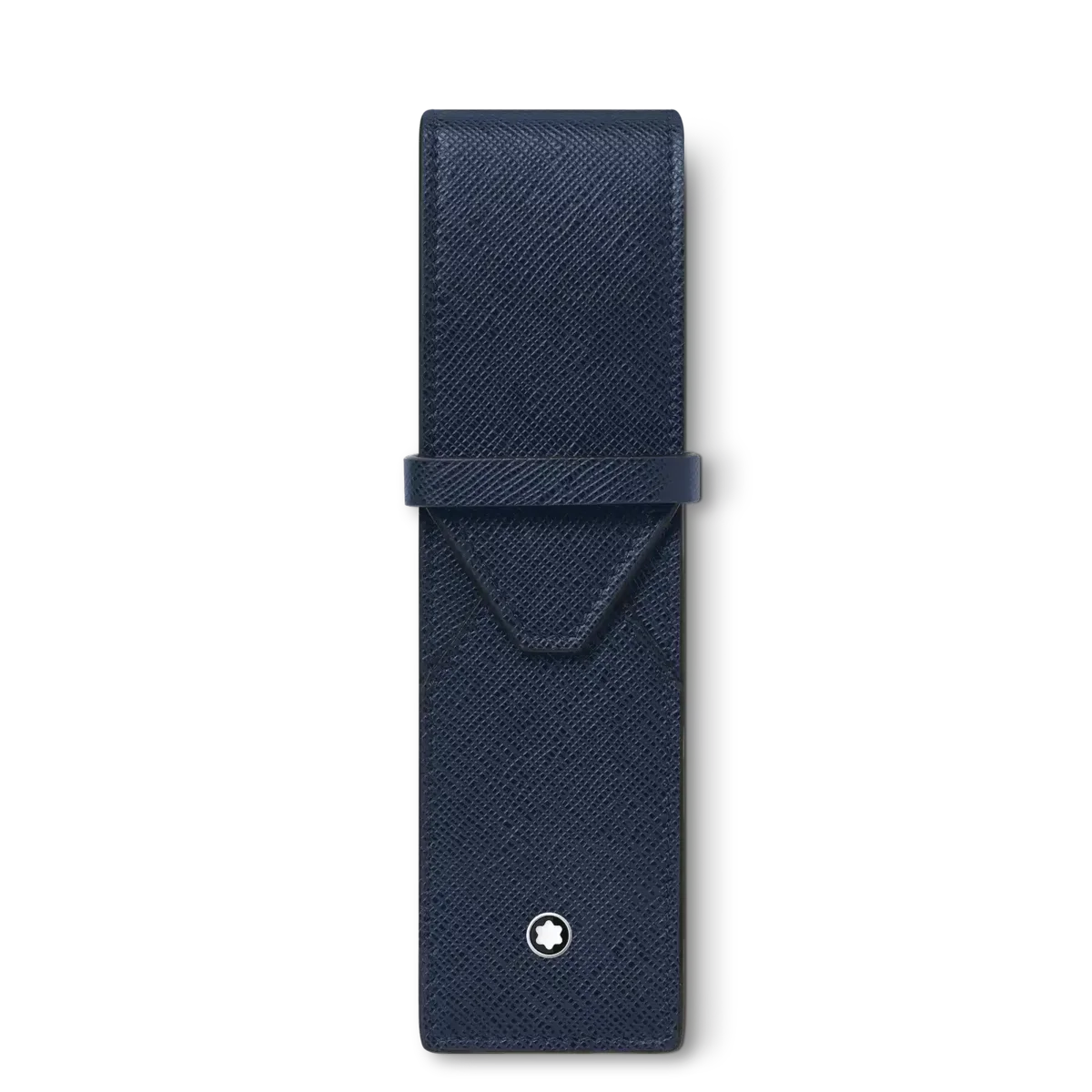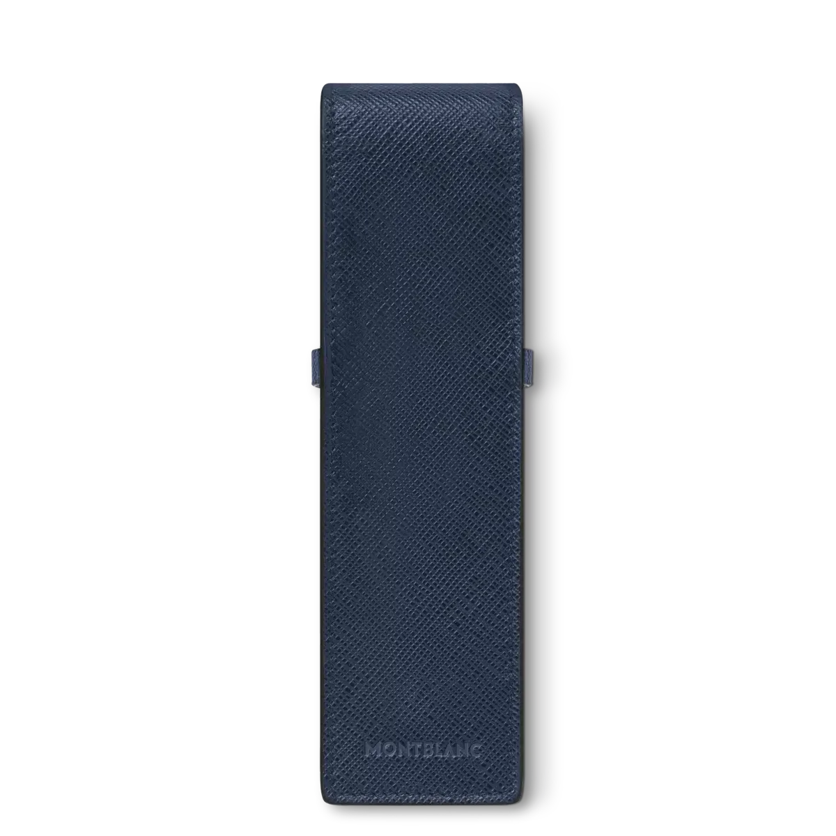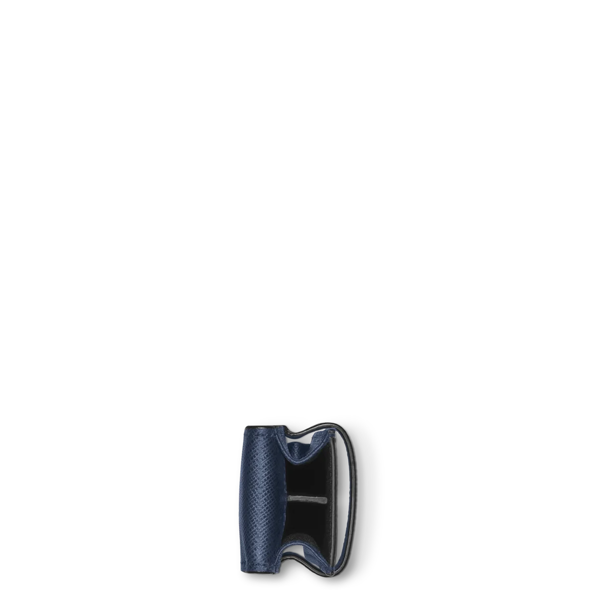 Esta elegante funda para bolígrafos, compañera inseparable de los profesionales de los negocios y los amantes de la palabra escrita, tiene espacio para dos instrumentos de escritura. Su silueta de cuero azul tinta de grano completo ha sido diseñada con formas superpuestas, inspiradas en la forma de un sobre.