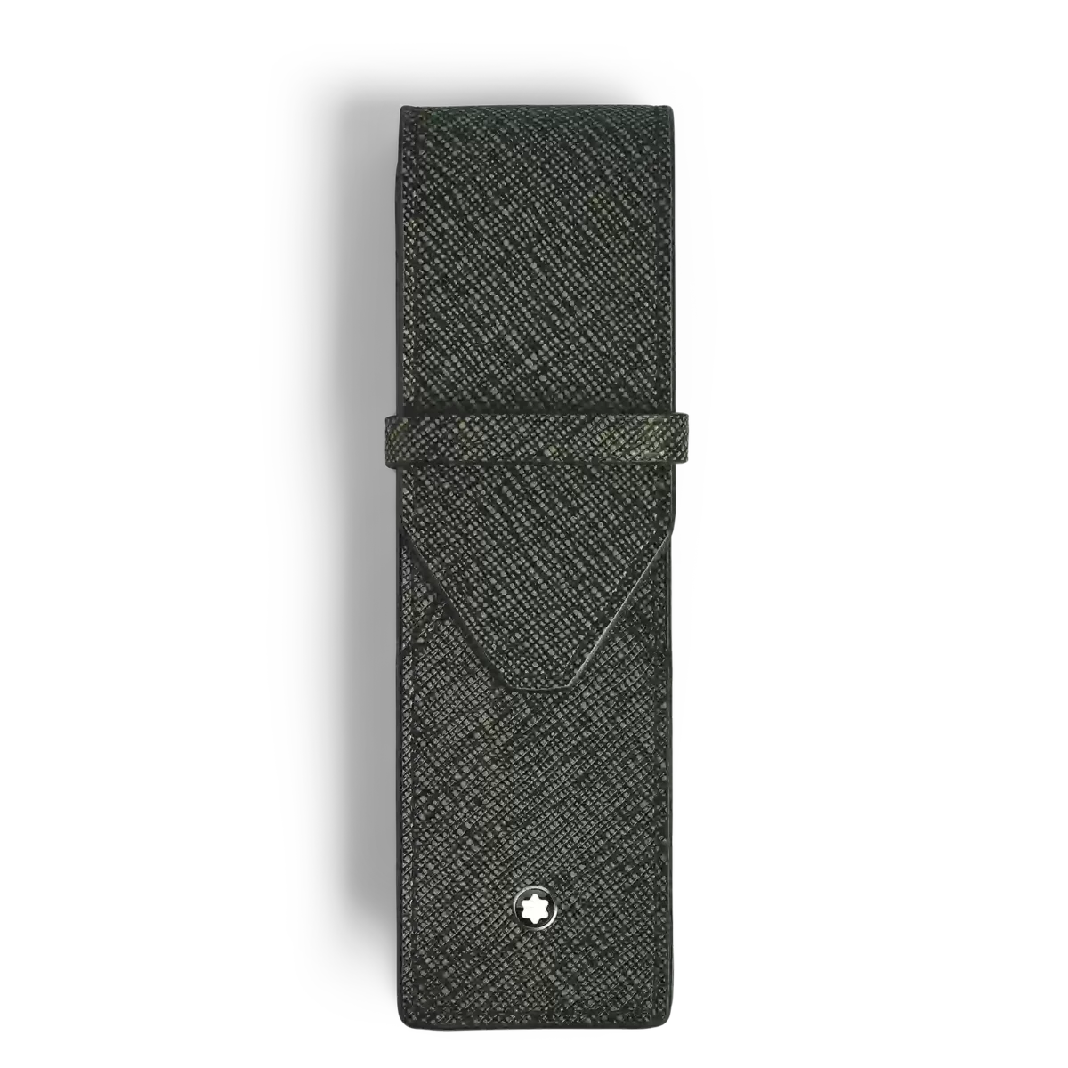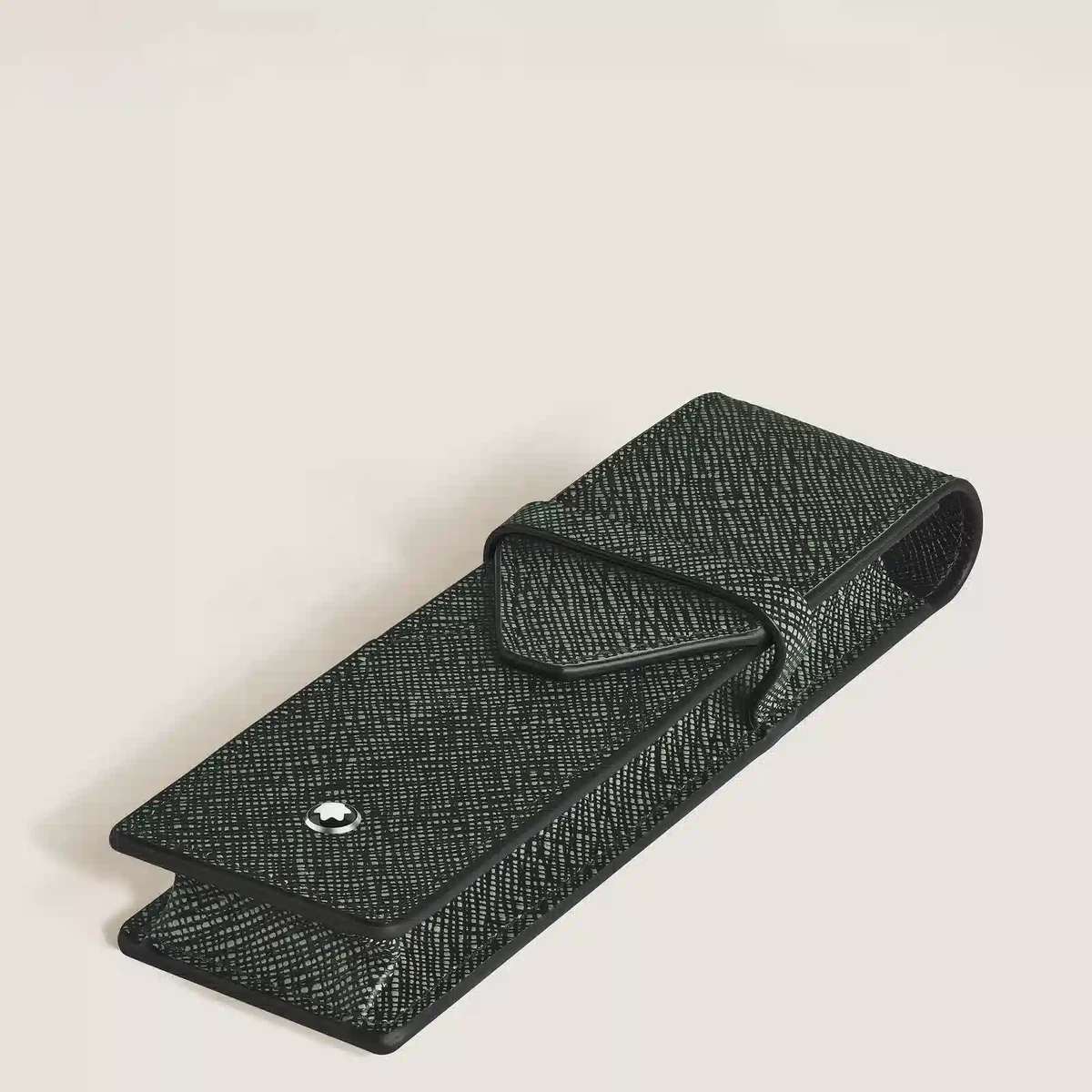 Este estuche para bolígrafos, un accesorio elegante y refinado, está diseñado para guardar hasta dos instrumentos de escritura. Fabricado en piel sartorial repujada en una elegante combinación de dos tonos, caqui y negro, su silueta superpuesta se inspira en la forma de un sobre, rindiendo homenaje a la cultura de la escritura.