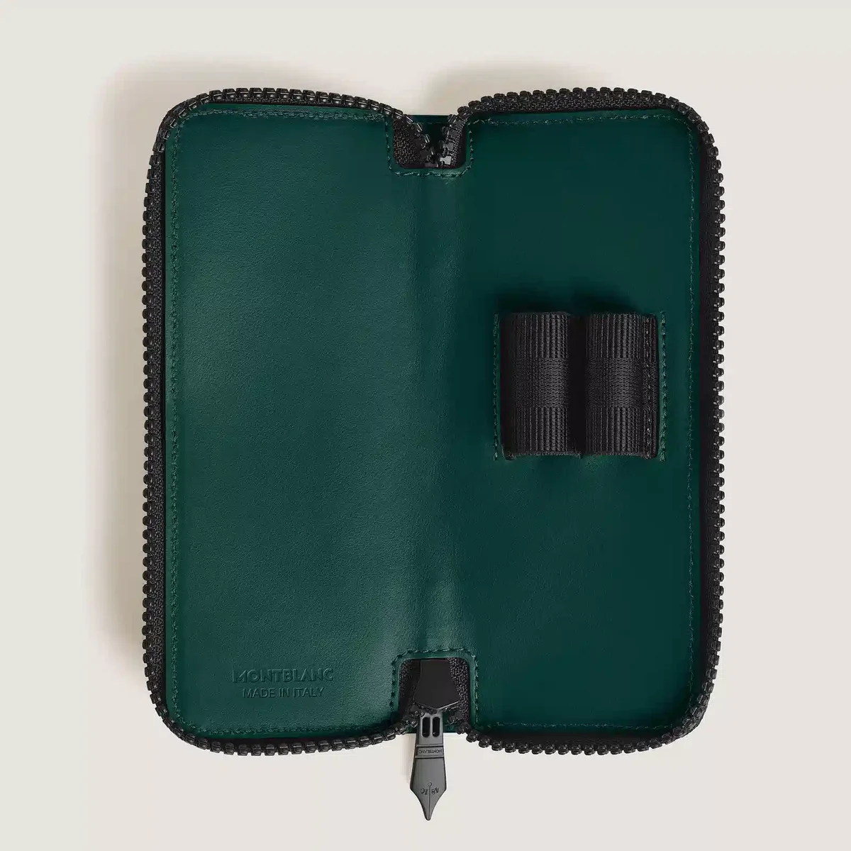 Fabricado en piel plena flor de color verde británico y con el emblemático motivo Extreme 3.0 grabado en relieve, este estuche para bolígrafos es una forma elegante de transportar o guardar de forma segura sus instrumentos de escritura favoritos. Diseñado para guardar dos bolígrafos del tamaño del Meisterstück Classique o Le Grand, cuenta con un cierre de cremallera seguro, un tirador de cremallera con forma de plumín y está rematado con el emblema de Montblanc para darle un toque refinado.