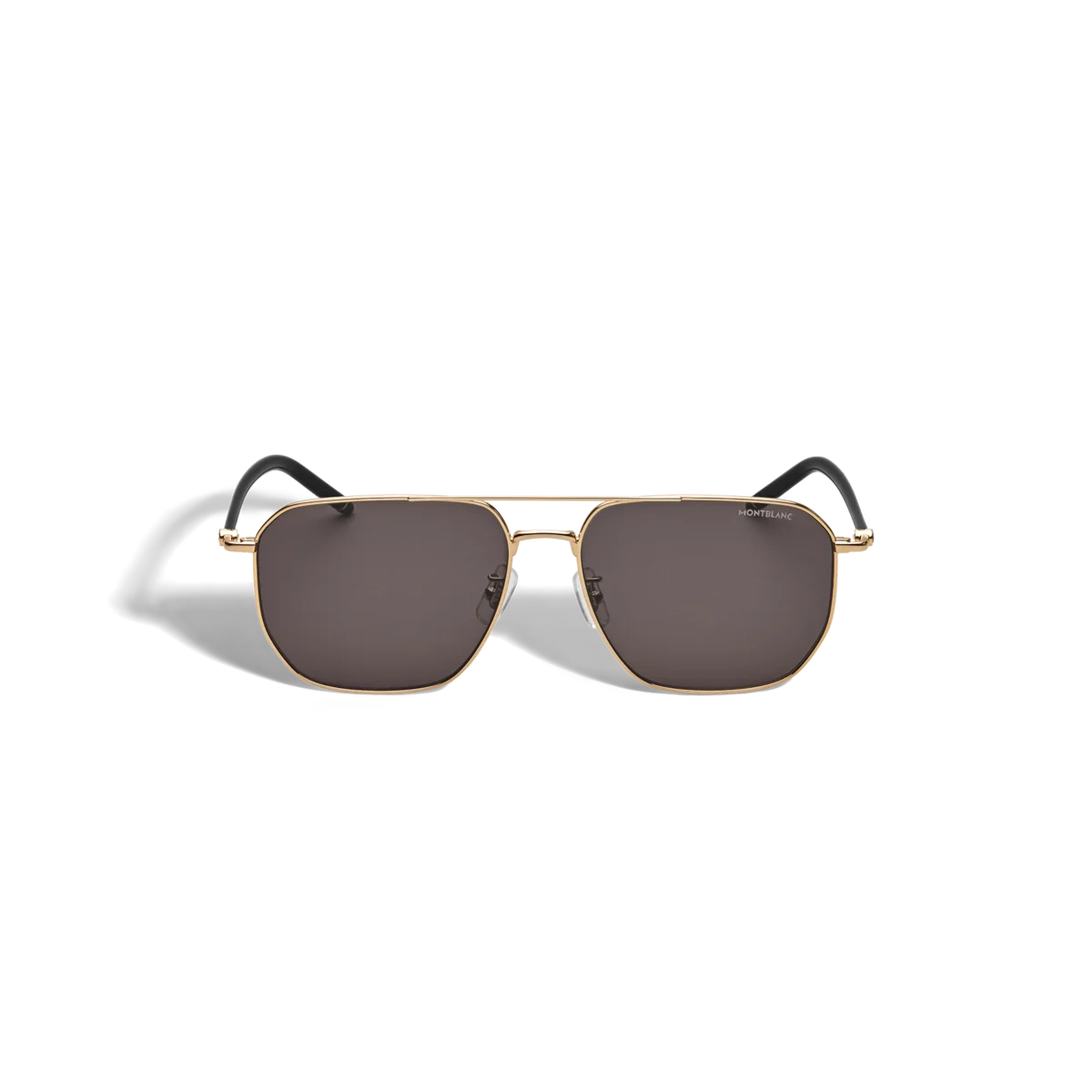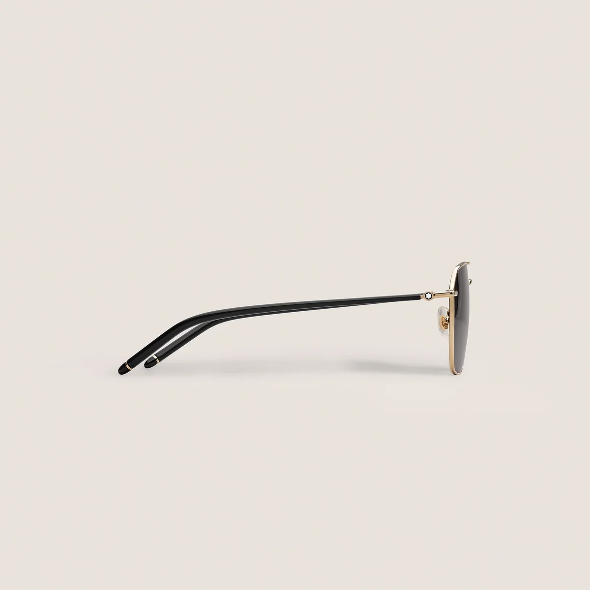 Estas gafas de sol de estilo cuadrado tienen una montura metálica dorada y lentes grises. Cuentan con un puente metálico doble en la parte delantera. La patilla tubular, inspirada en los instrumentos de escritura Meisterstück, está adornada con un detalle de tres anillos. El logotipo de Montblanc está grabado con láser en la lente izquierda y las puntas de las patillas están encapsuladas con un detalle de esmalte negro.