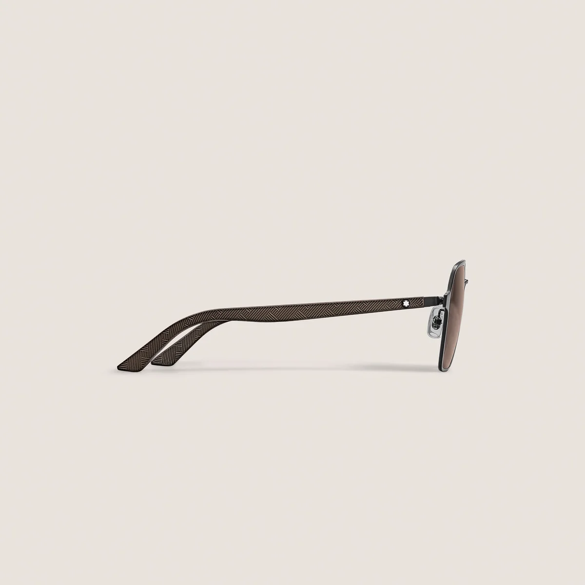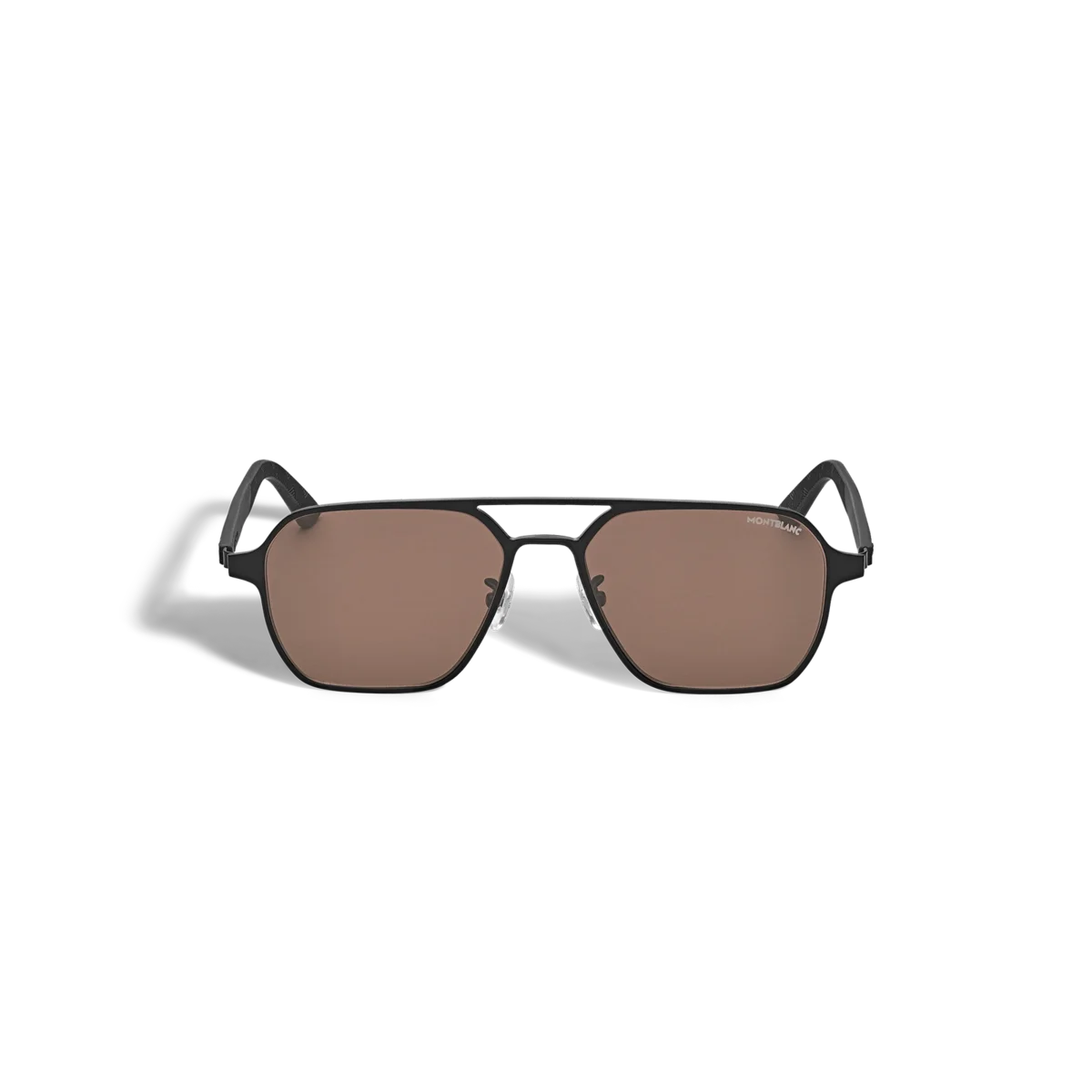 Estas gafas de sol de estilo cuadrado tienen una montura de metal negro y lentes marrones. Cuentan con un puente doble de metal en la parte delantera. El emblema de Montblanc está encapsulado en el diseño de las patillas y los extremos de estas cuentan con puntas de goma con el patrón Montblanc Extreme 3.0 para transmitir un aspecto deportivo. El logotipo de Montblanc está grabado con láser en la lente izquierda de las gafas de sol.