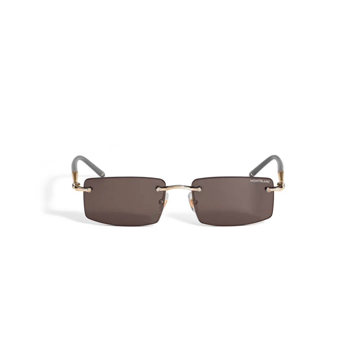 Estas gafas de sol sin montura de estilo cuadrado tienen una montura metálica dorada y lentes marrones. Las patillas tubulares, inspiradas en los instrumentos de escritura Meisterstück, están adornadas con un detalle de tres anillos. El logotipo de Montblanc está grabado con láser en la lente izquierda y las puntas de las patillas están decoradas con un detalle de esmalte negro.
