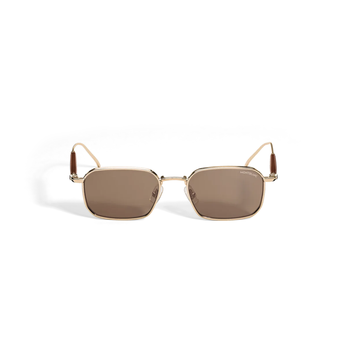Estas gafas de sol de estilo rectangular tienen una montura metálica dorada y lentes marrones. Las patillas tubulares presentan el emblema de Montblanc y están adornadas con un elemento de madera. El logotipo de Montblanc está grabado con láser en la lente izquierda de las gafas de sol.