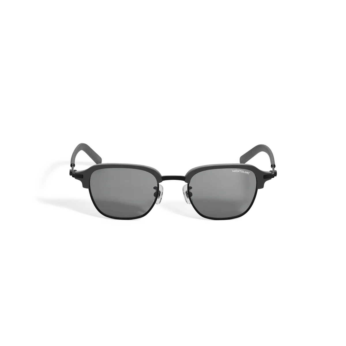 Estas gafas de sol de estilo cuadrado tienen una montura metálica de color negro y lentes grises. El emblema de Montblanc está encapsulado en el diseño de las patillas. El logotipo de Montblanc está grabado con láser en la lente izquierda de las gafas de sol y el patrón antideslizante está grabado con láser en el lado interno de las puntas de las patillas para aumentar la comodidad.