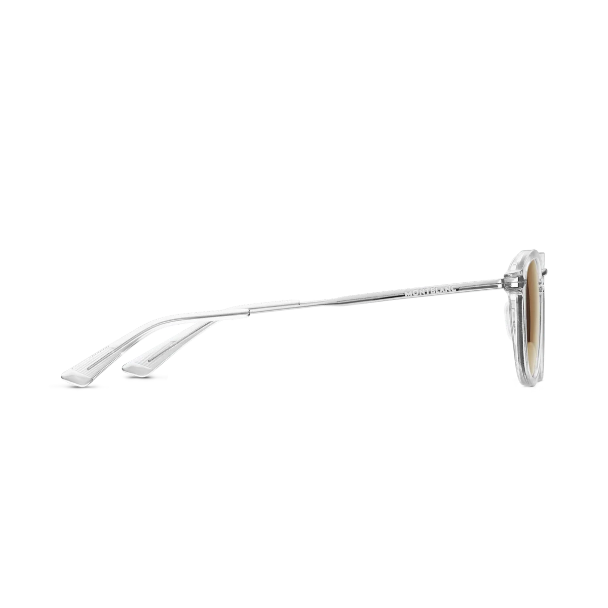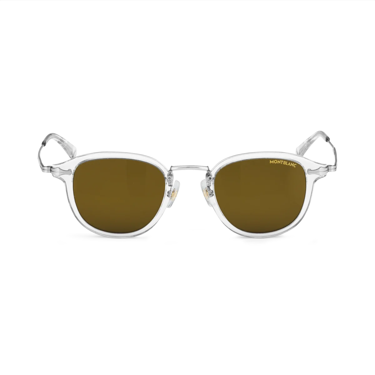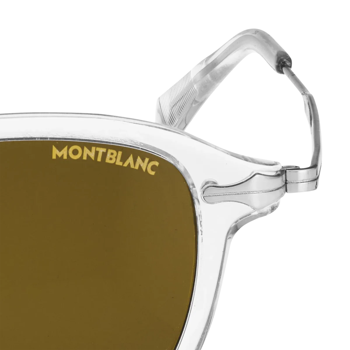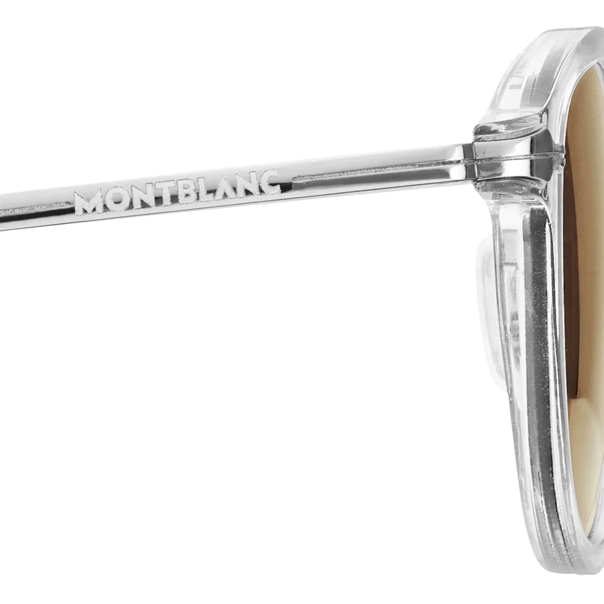 Estas gafas de sol redondas presentan una montura inyectada de color gris y lentes marrones. Inspiradas en el diseño de la plumilla de los instrumentos de escritura, las patillas metálicas cuentan con un detalle decorativo en forma de plumilla. El logotipo de Montblanc está grabado con láser en la lente izquierda y el patrón antideslizante está grabado con láser en el interior de las puntas de las patillas para aumentar la comodidad.
