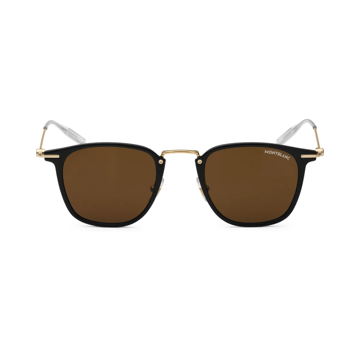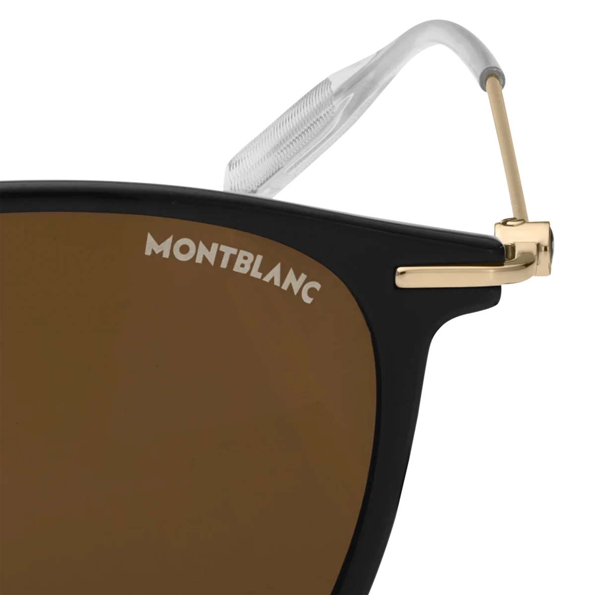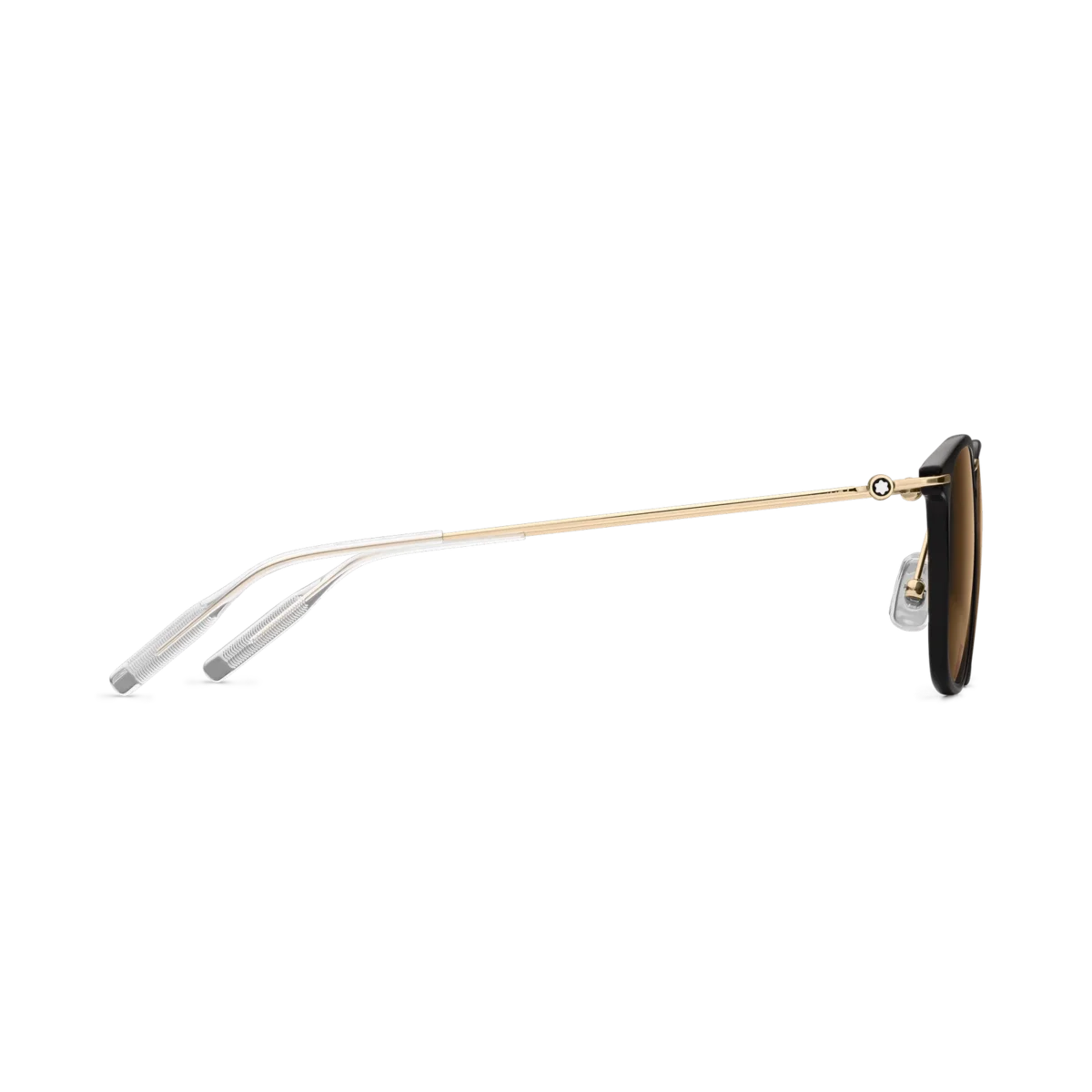 Estas ligeras gafas de sol negras con montura moldeada por inyección en color dorado se caracterizan por su forma redonda. Las lentes marrones aportan un aspecto y un estilo contemporáneos. El logotipo de Montblanc está grabado con láser en la lente izquierda y el patrón antideslizante está grabado con láser en el interior de las puntas de las patillas para aumentar la comodidad.
