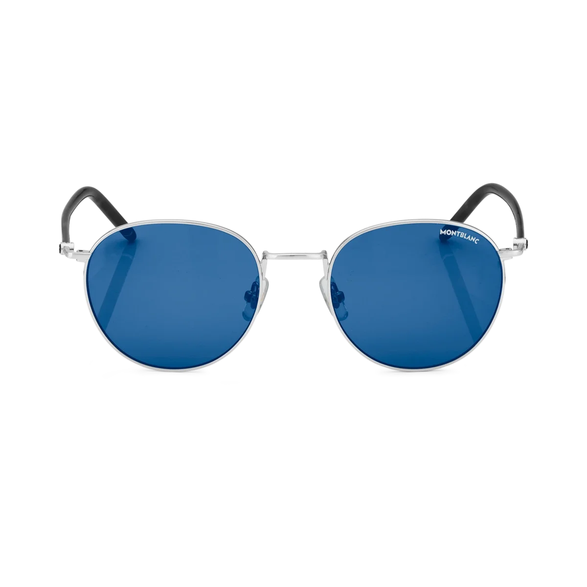 Estas gafas de sol redondas cuentan con una montura metálica color rutenio y lentes azules. Las patillas tubulares están inspiradas en los instrumentos de escritura Meisterstück y enriquecidas con un detalle de esmalte negro en las puntas. El logotipo de Montblanc está grabado con láser en la lente izquierda y el logotipo de la montaña nevada está encapsulado en la patilla.