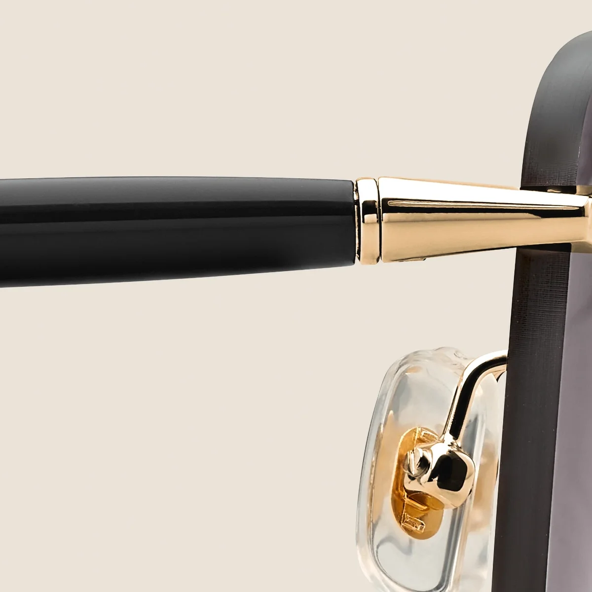 Estas gafas de sol sin montura de estilo redondo tienen una montura metálica dorada y lentes grises. Las patillas tubulares, inspiradas en los instrumentos de escritura Meisterstück, están adornadas con las letras Montblanc. El logotipo de Montblanc está grabado con láser en la lente izquierda.
