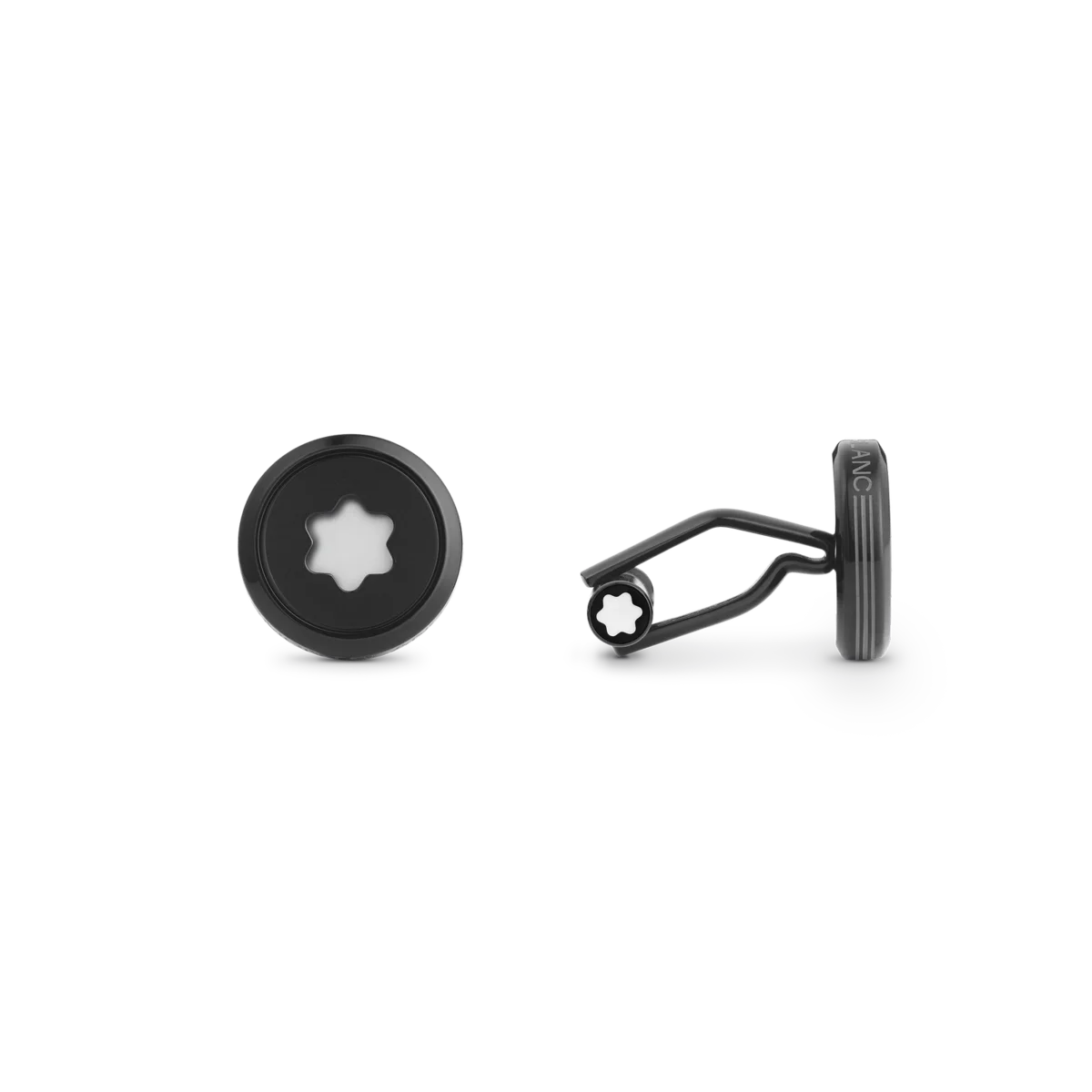 Gemelos de acero inoxidable con revestimiento de PVD negro. El emblema Montblanc está recubierto con laca fotoluminiscente.