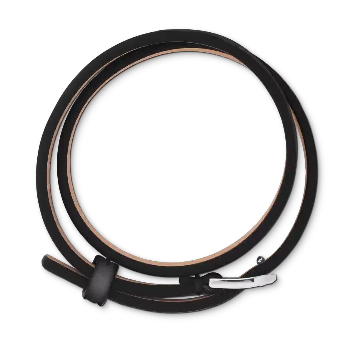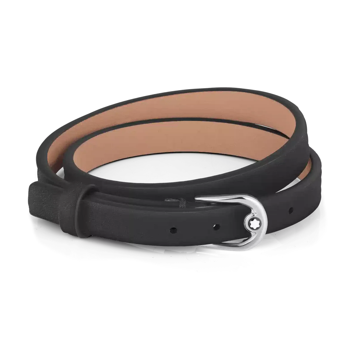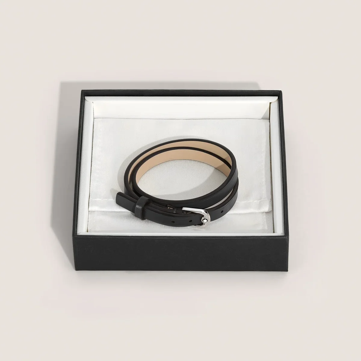 Esta exquisita pieza de joyería se inspira en la elegancia de un cinturón de fina factura, combinando a la perfección funcionalidad y belleza para adornarte con un toque de sofisticación atemporal. La pulsera tiene una correa de cuero en color negro y cierre de acero inoxidable. El tamaño es ajustable.