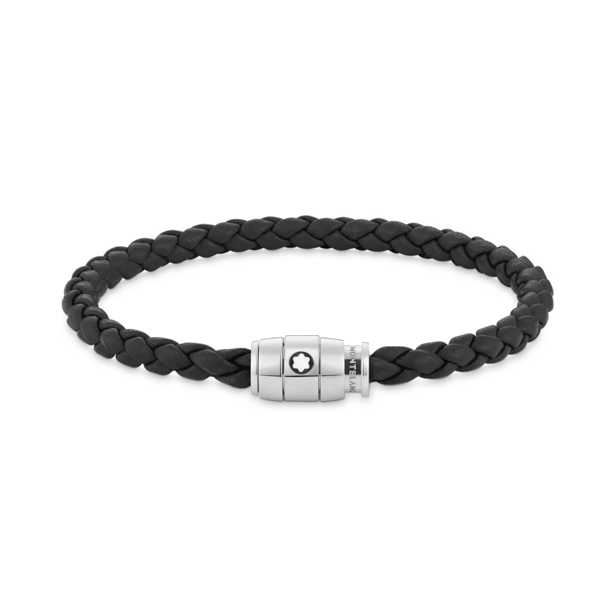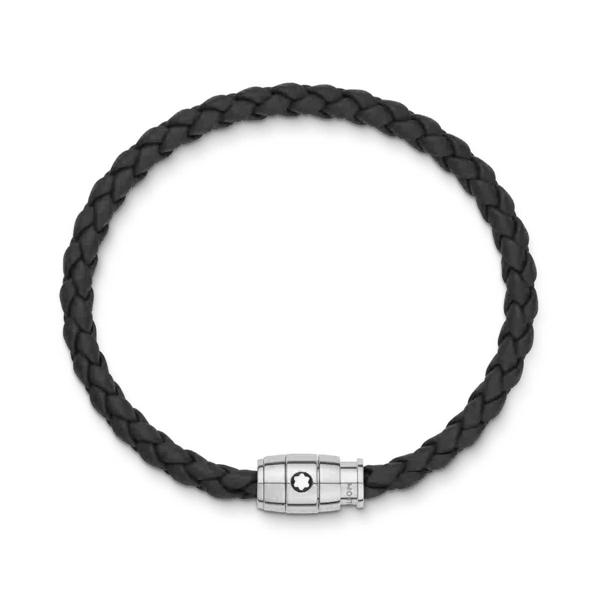 La pieza de joyería, tejida en cuero negro, tiene un cierre de acero inoxidable pulido con un anillo de acero con el emblema de Montblanc.