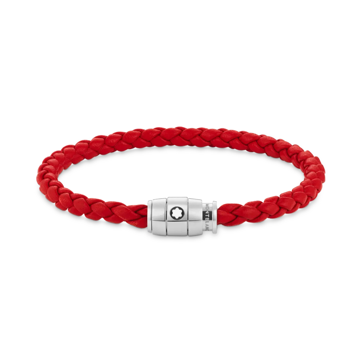 La pieza de joyería, tejida en cuero rojo, tiene un cierre de acero inoxidable pulido con un anillo de acero con el emblema de Montblanc.