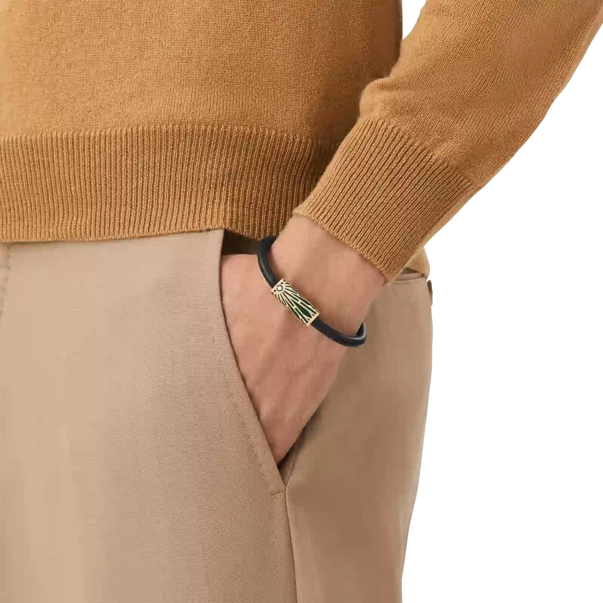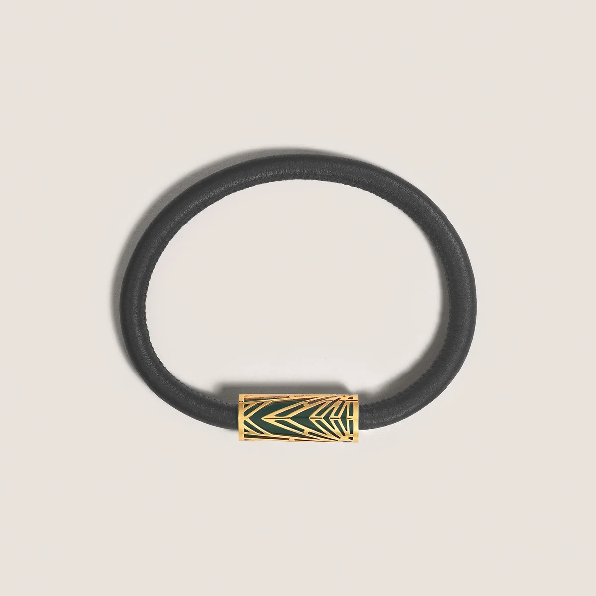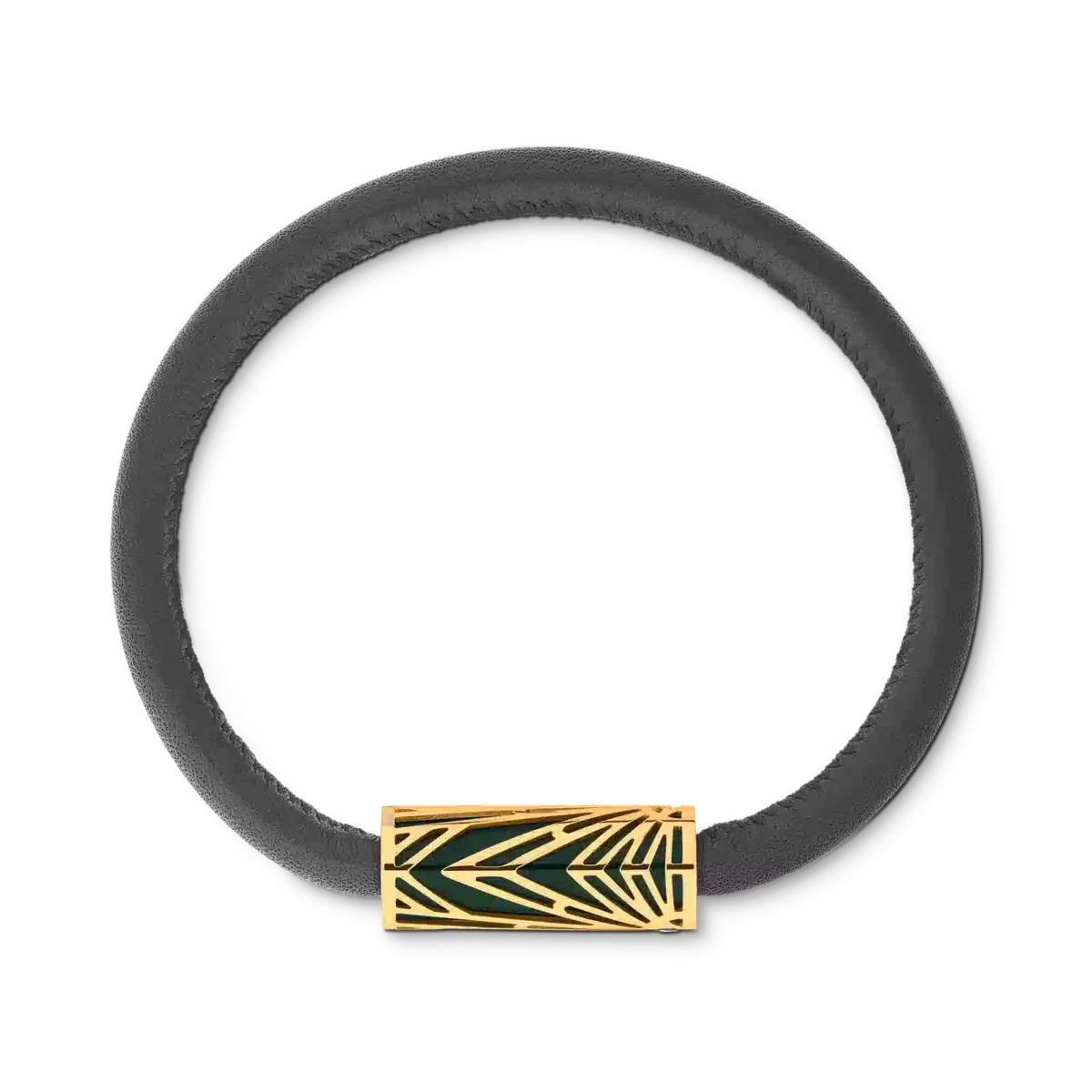 La joya tiene una pulsera de cuero negro y un tubo de acero inoxidable con revestimiento de PVD y laca verde (talla 60). Está inspirada en el patrón Solitaire del archivo.