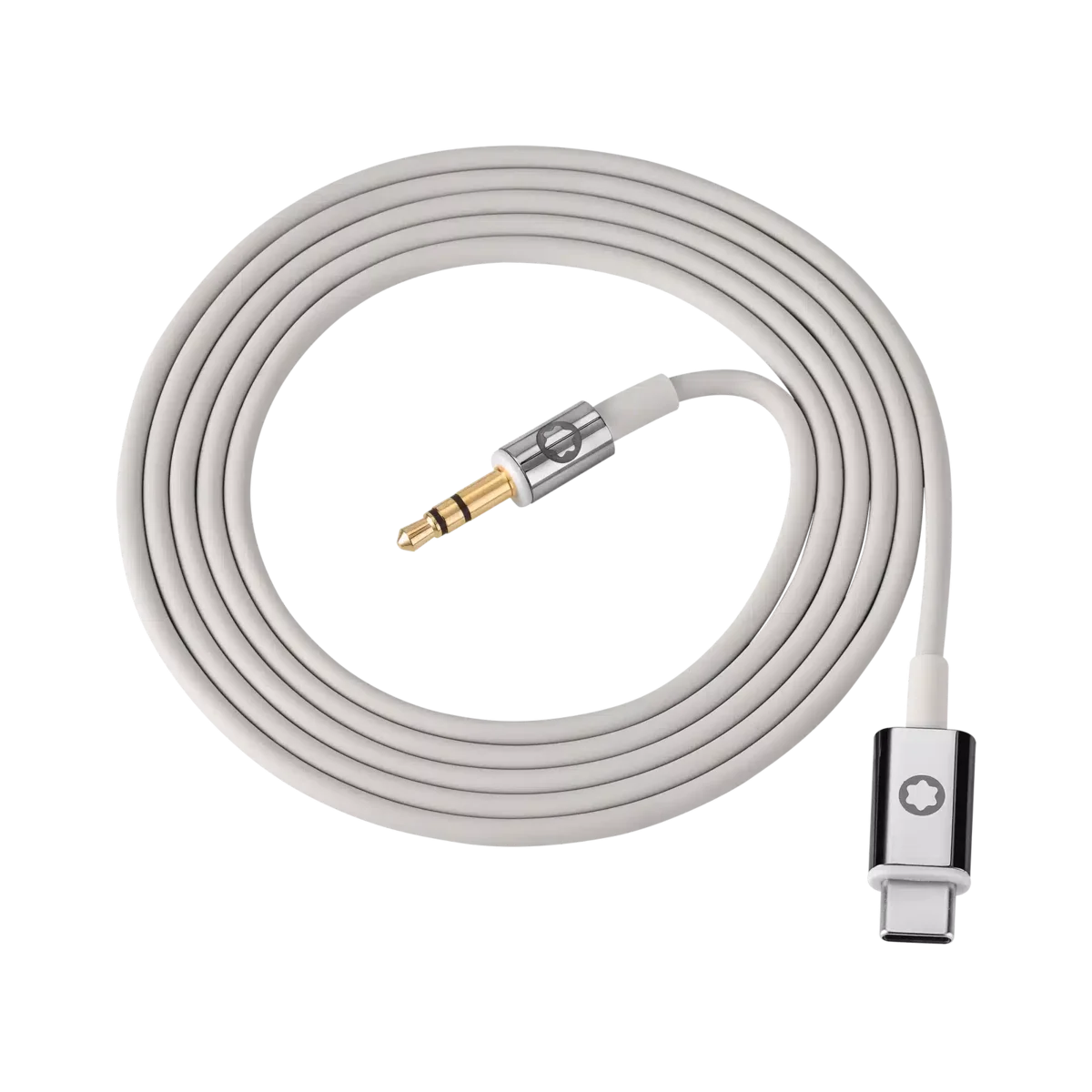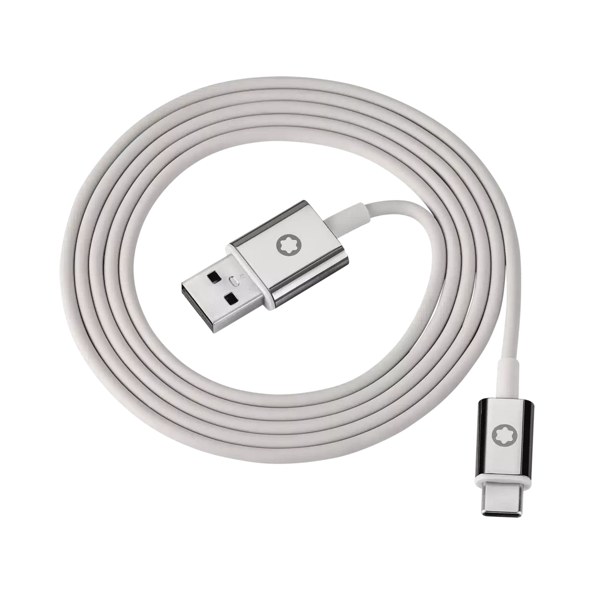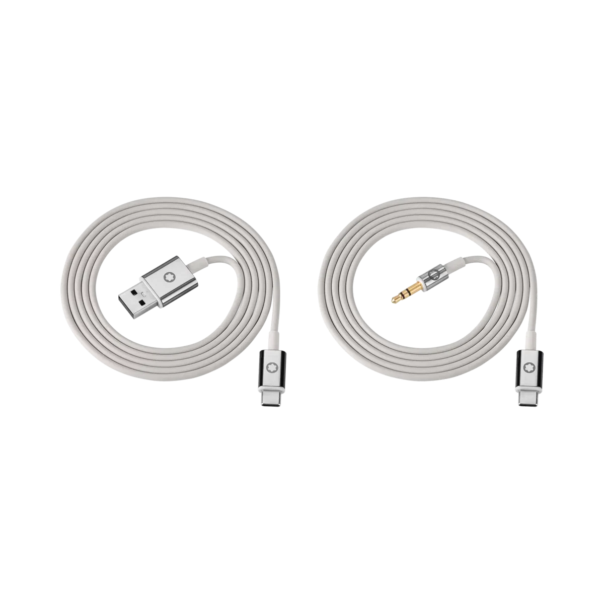 Juego de cables adicional para sus auriculares Montblanc MB 01 que contiene un cable de carga USB-C gris y un cable de audio gris.