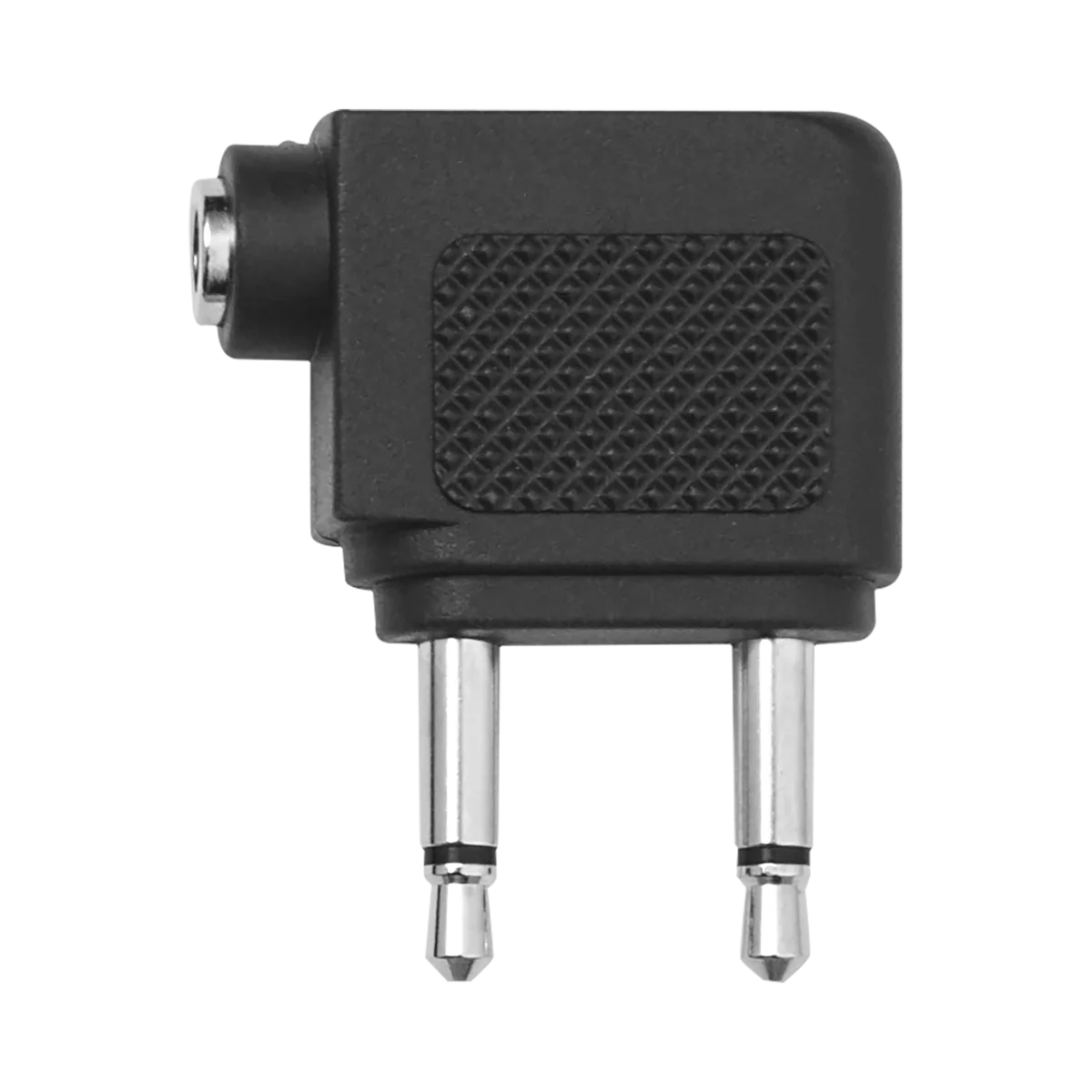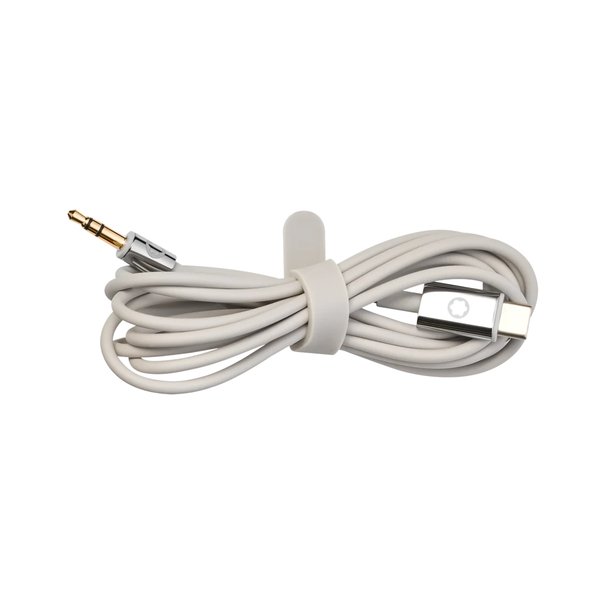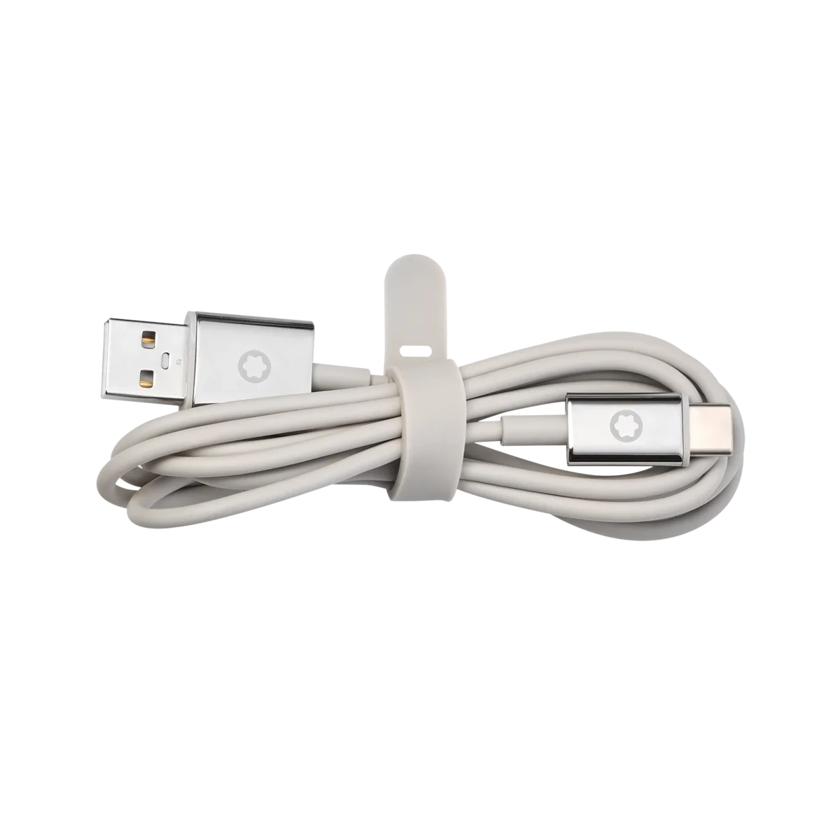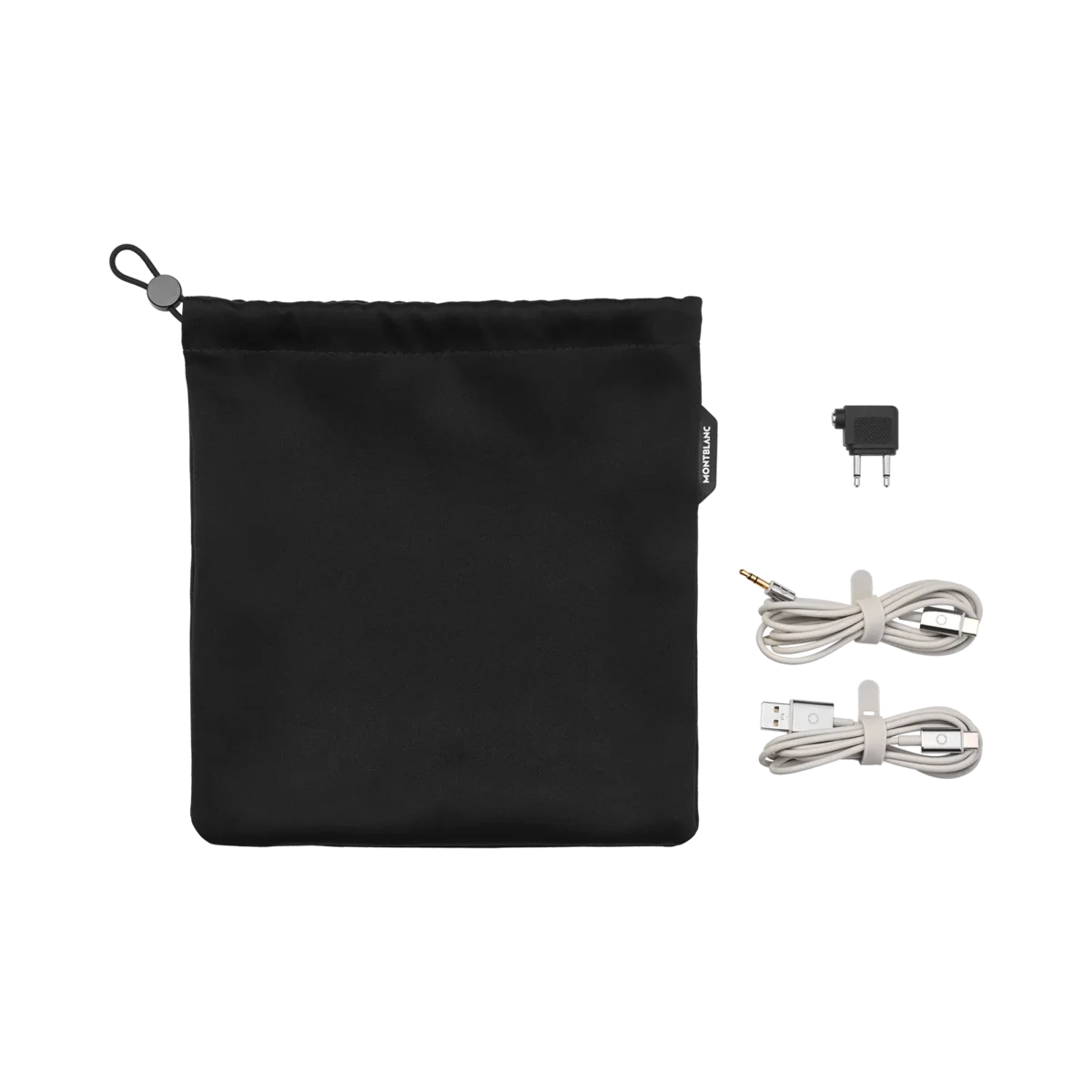 Juego de viaje adicional para tus auriculares Montblanc MB 01 que contiene una bolsa negra, un cable de carga USB-C gris, un cable de audio gris y un adaptador de viaje negro.