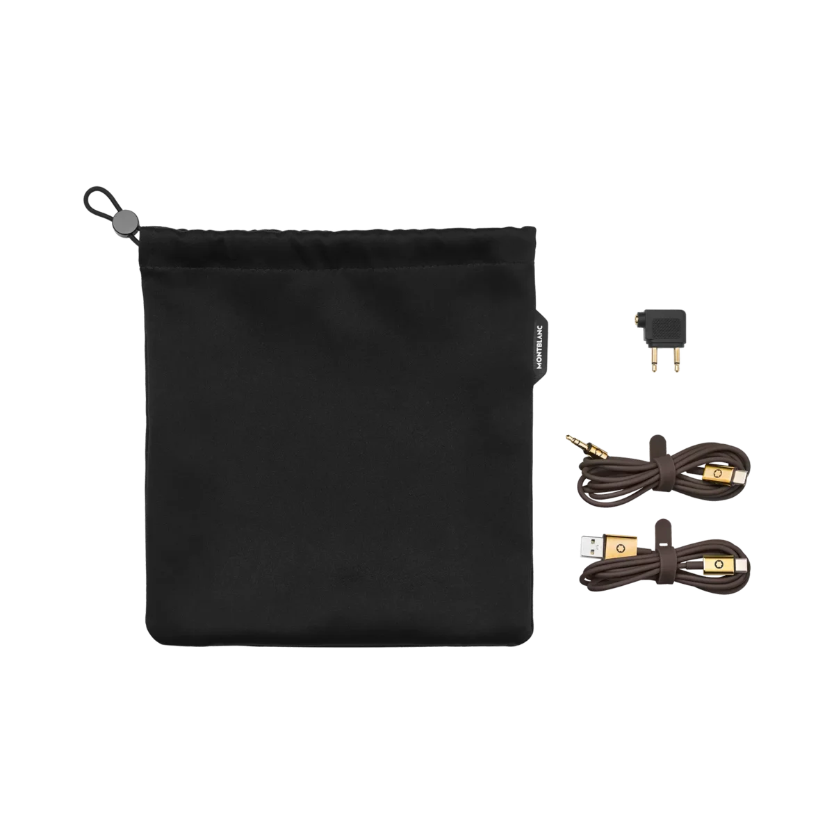 Set de viaje adicional para sus auriculares Montblanc MB 01 que contiene una bolsa negra, un cable de carga USB-C marrón, un cable de audio marrón y un adaptador de viaje negro.