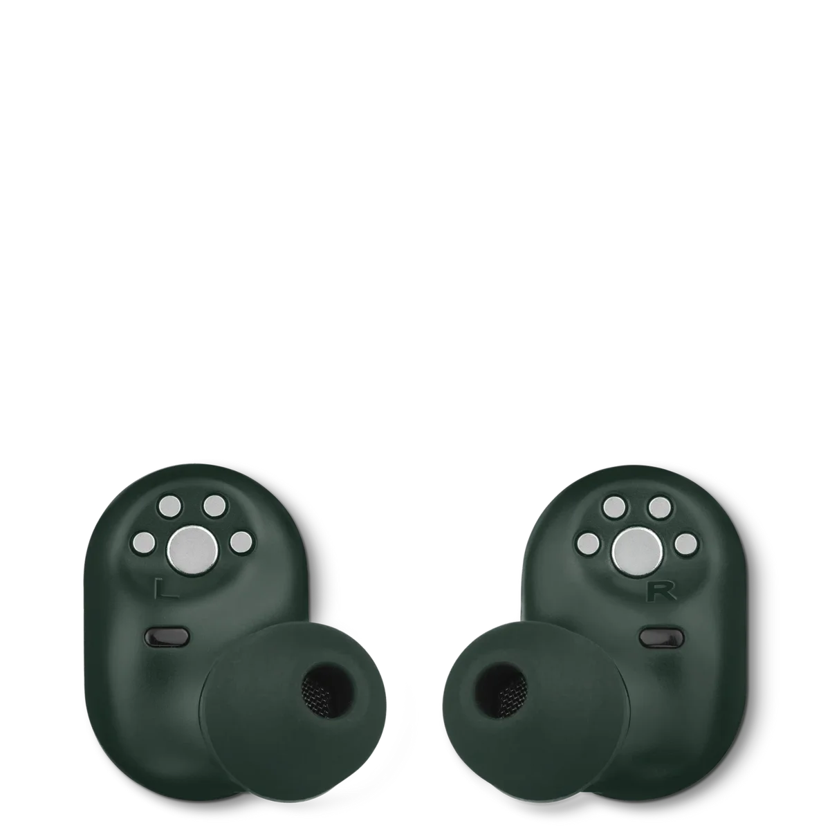 Estuche de carga con auriculares intrauditivos, cable de carga USB-C, juego de almohadillas de silicona (XS, S, M, L), manual de seguridad y guía de inicio rápido