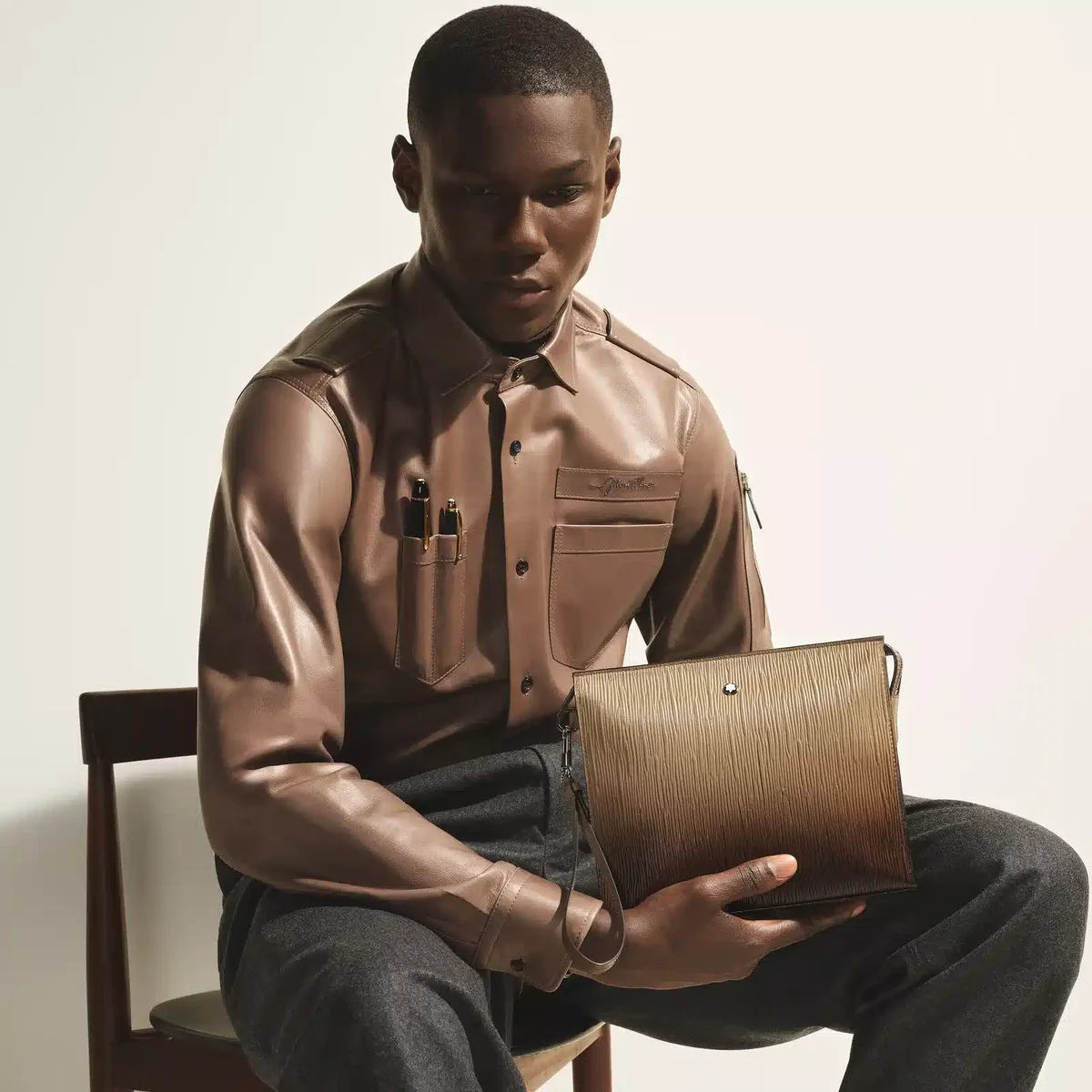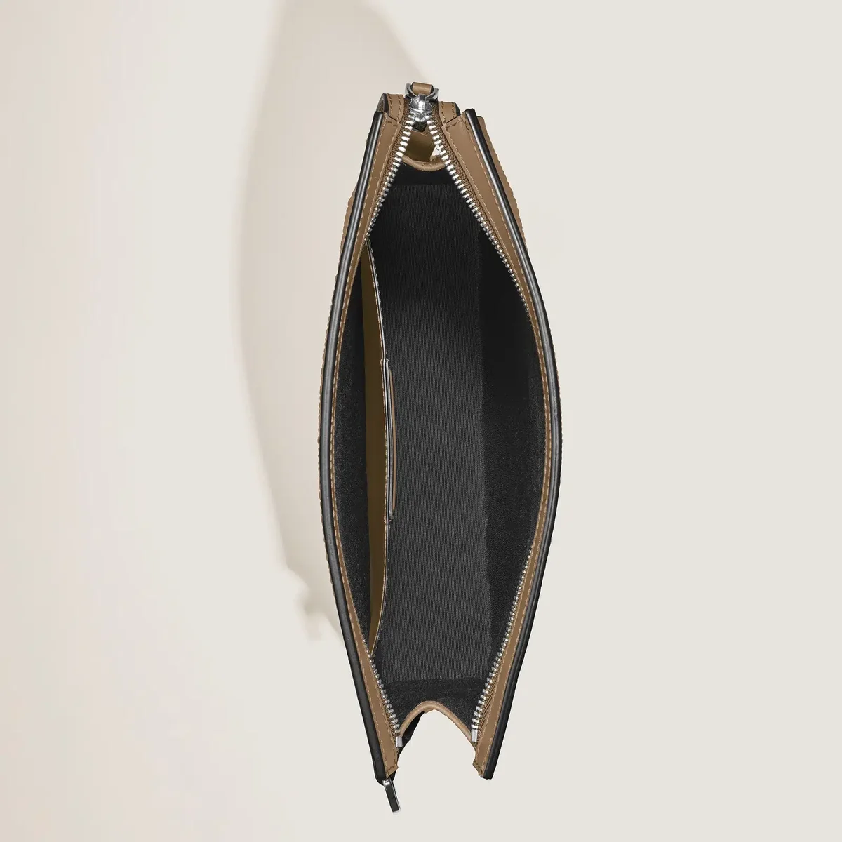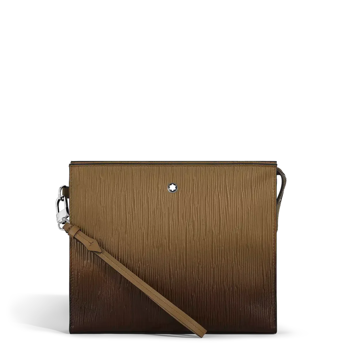 Lleve sus objetos esenciales diarios con estilo con esta sofisticada bolsa inspirada en la forma de un sobre para honrar la tradición de Montblanc en el mundo de la escritura. Confeccionada en piel Corteccia color arena, su motivo inspirado en la corteza se realza con un sombreado aplicado a mano. Su espacioso compartimento principal cuenta con un bolsillo abierto adicional para mayor comodidad y dos presillas para instrumentos de escritura. Versátil y refinado, se puede llevar en la mano, bajo el brazo o en la muñeca gracias a su asa desmontable.