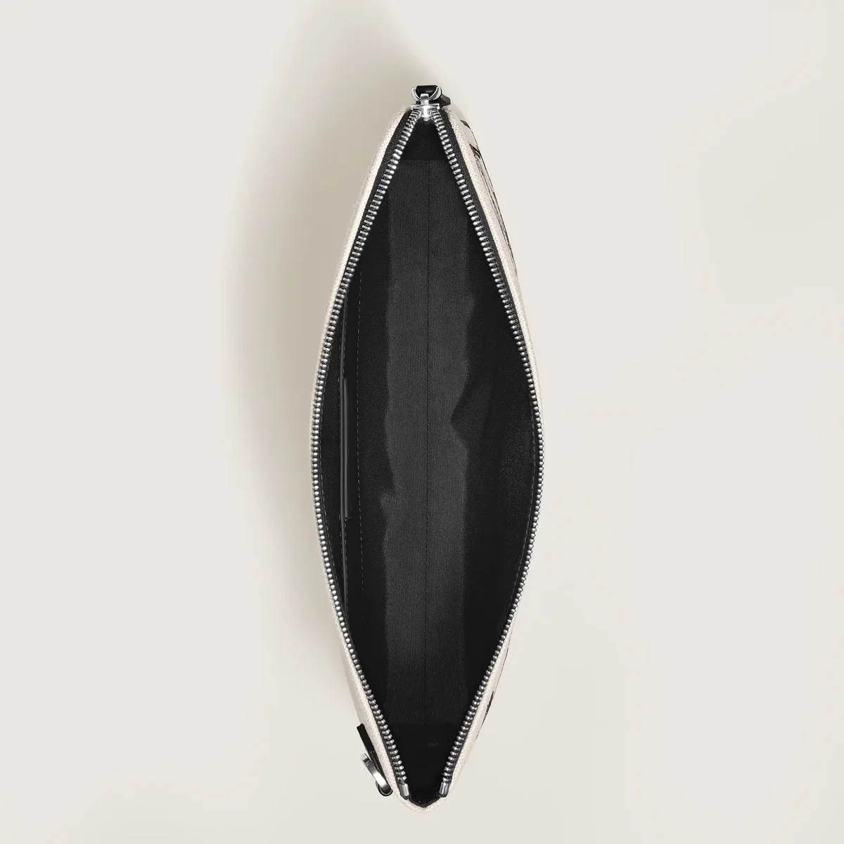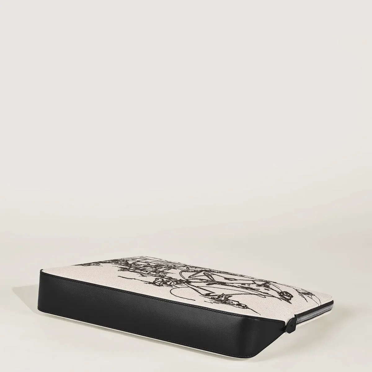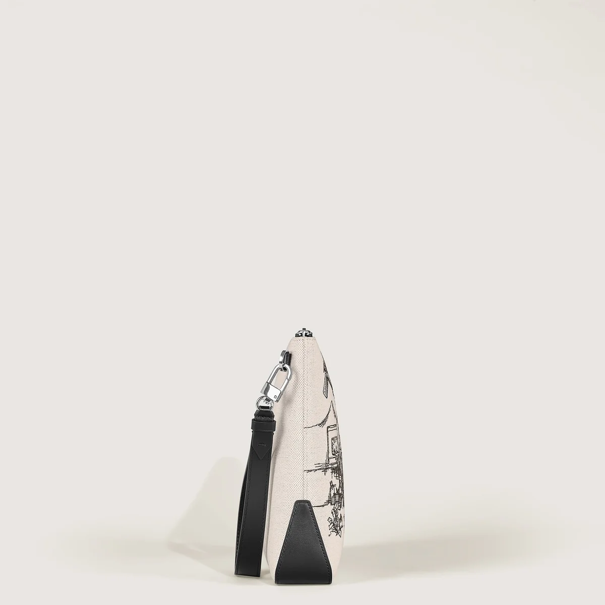 Este elegante y festivo accesorio, el bolso Happy Holidays de este año, rinde homenaje a la tradición de Montblanc en el mundo de los viajes y el arte de la escritura. Confeccionado en lona bordada y adornado con una correa para la muñeca desmontable en elegante piel negra, el bolso presenta un estampado que representa una escena invernal a los pies del Mont Blanc. Papeles arremolinados, instrumentos de escritura, bolsas de viaje y elementos de archivo se entrelazan, mezclando armoniosamente la tradición con el diseño contemporáneo. Llévelo con la correa de cuero desmontable o utilícelo para organizar fácilmente sus objetos esenciales dentro de un bolso más grande.