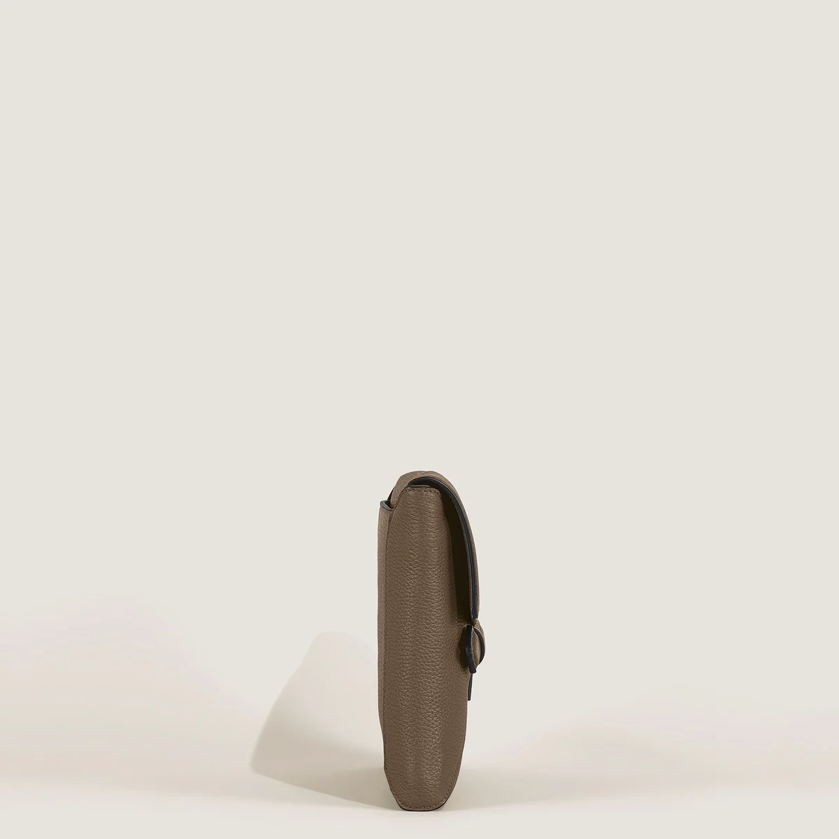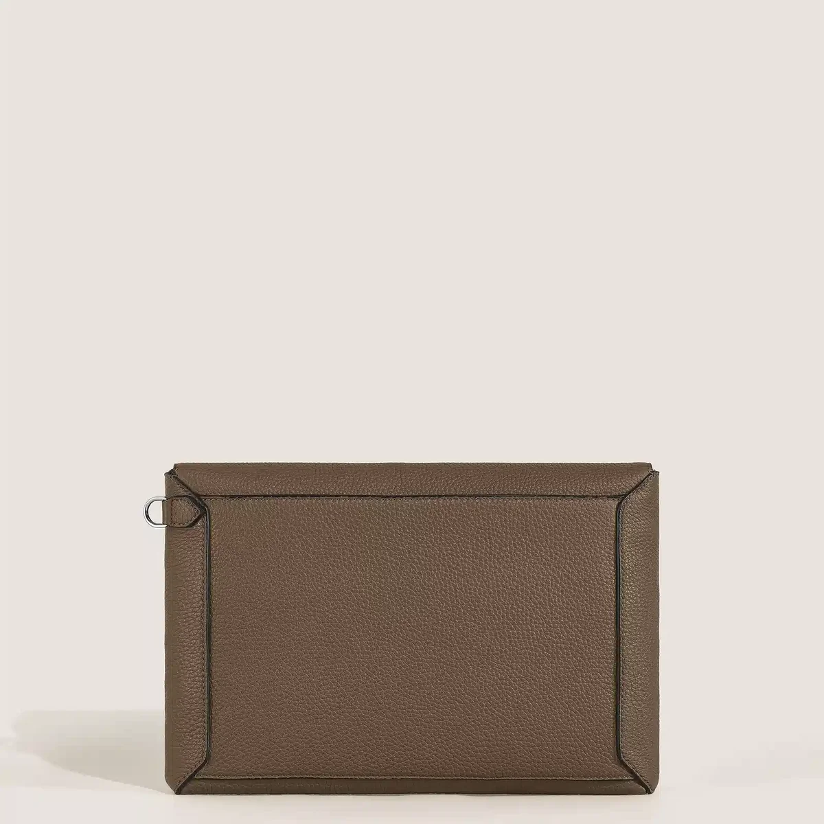 El bolso clutch combina la escritura de Montblanc con una funcionalidad refinada. Su diseño inspirado en un sobre está elaborado en piel granulada negra flexible de color noisette, con costuras de silla de montar que recuerdan el trazo de un bolígrafo sobre una línea punteada. El exclusivo asa delantera en forma de plumilla permite sujetar cómodamente el bolso con una sola mano, mientras que el asa de muñeca desmontable añade versatilidad. En el interior, incluye un compartimento principal, un bolsillo abierto y dos presillas para instrumentos de escritura, complementados con un bolsillo trasero para mayor practicidad.