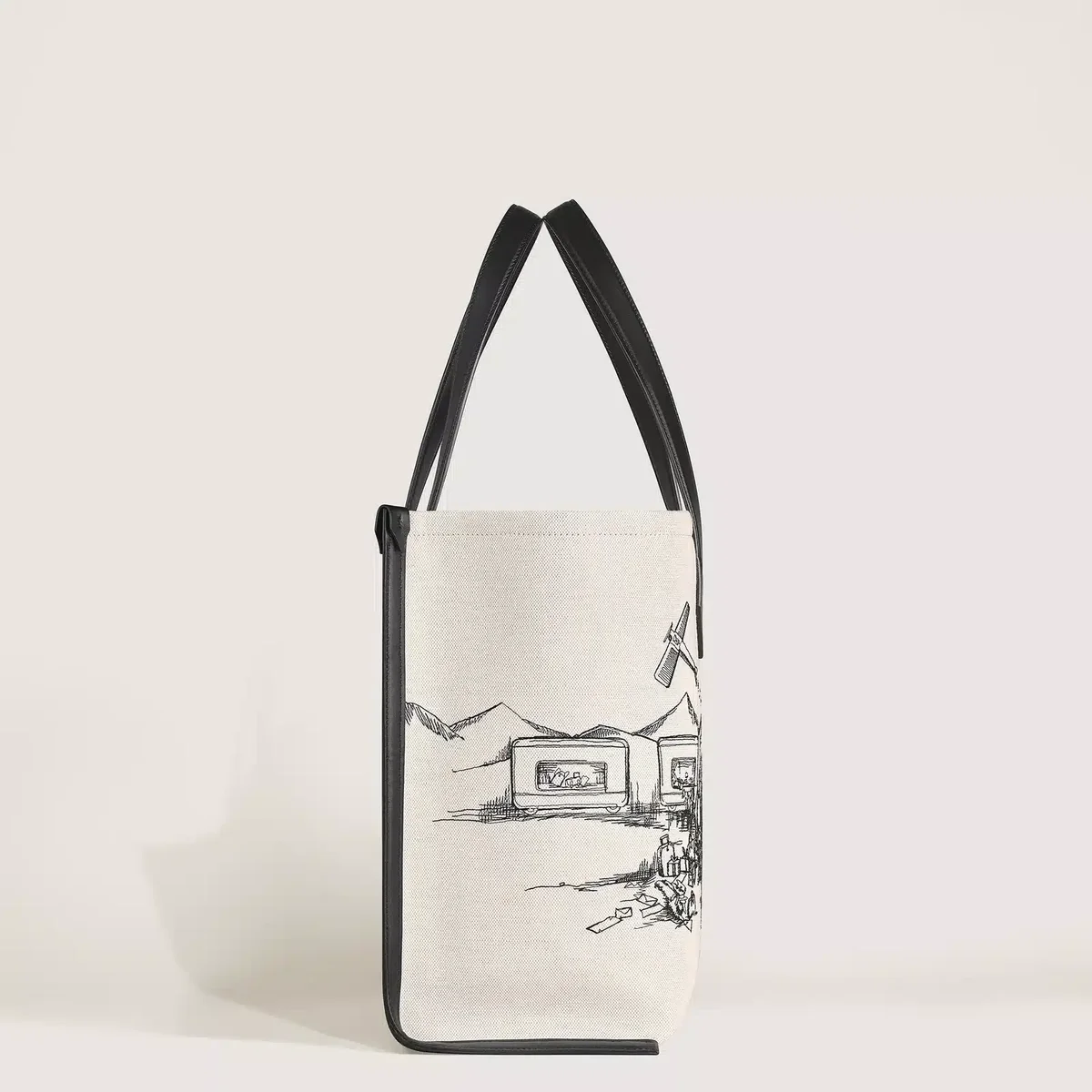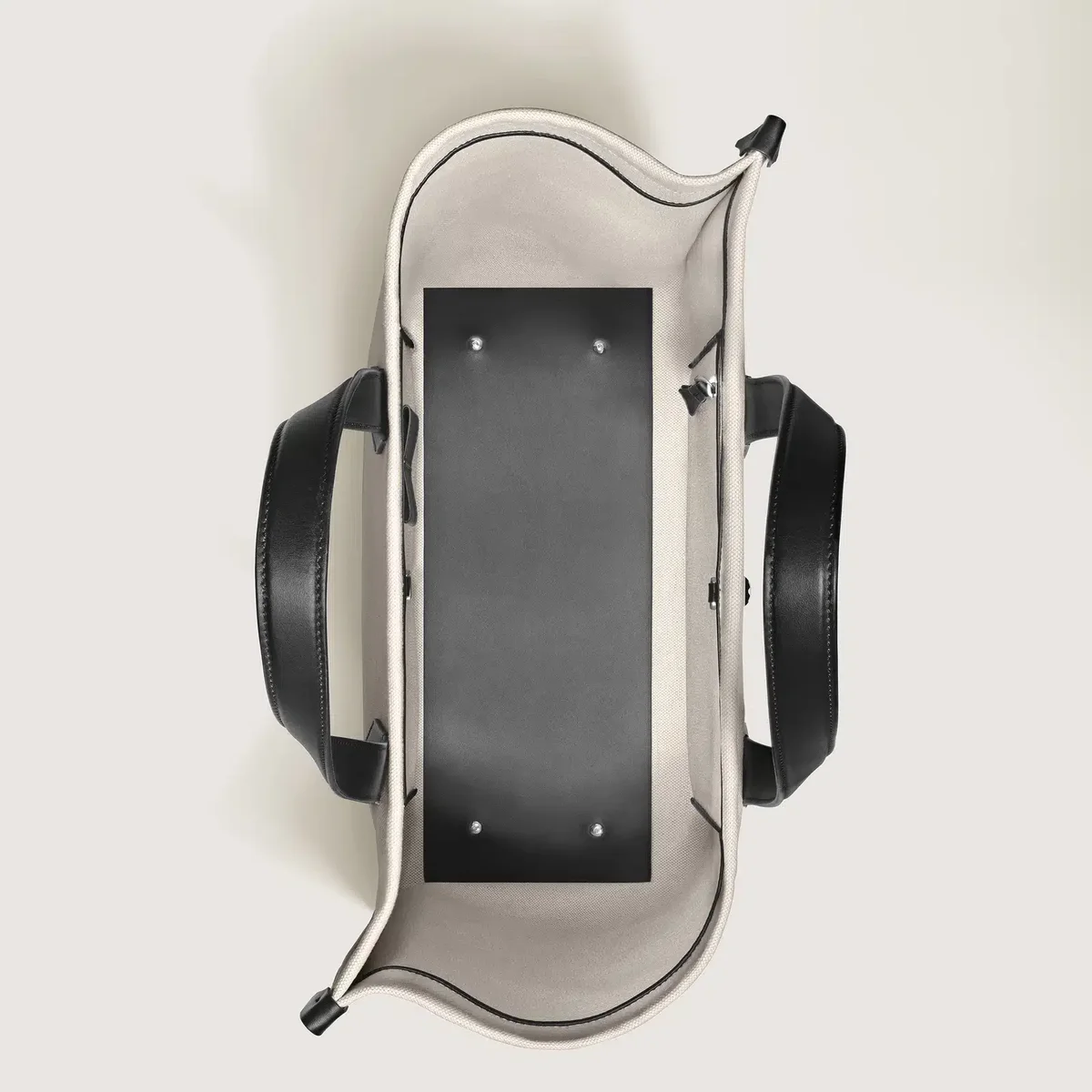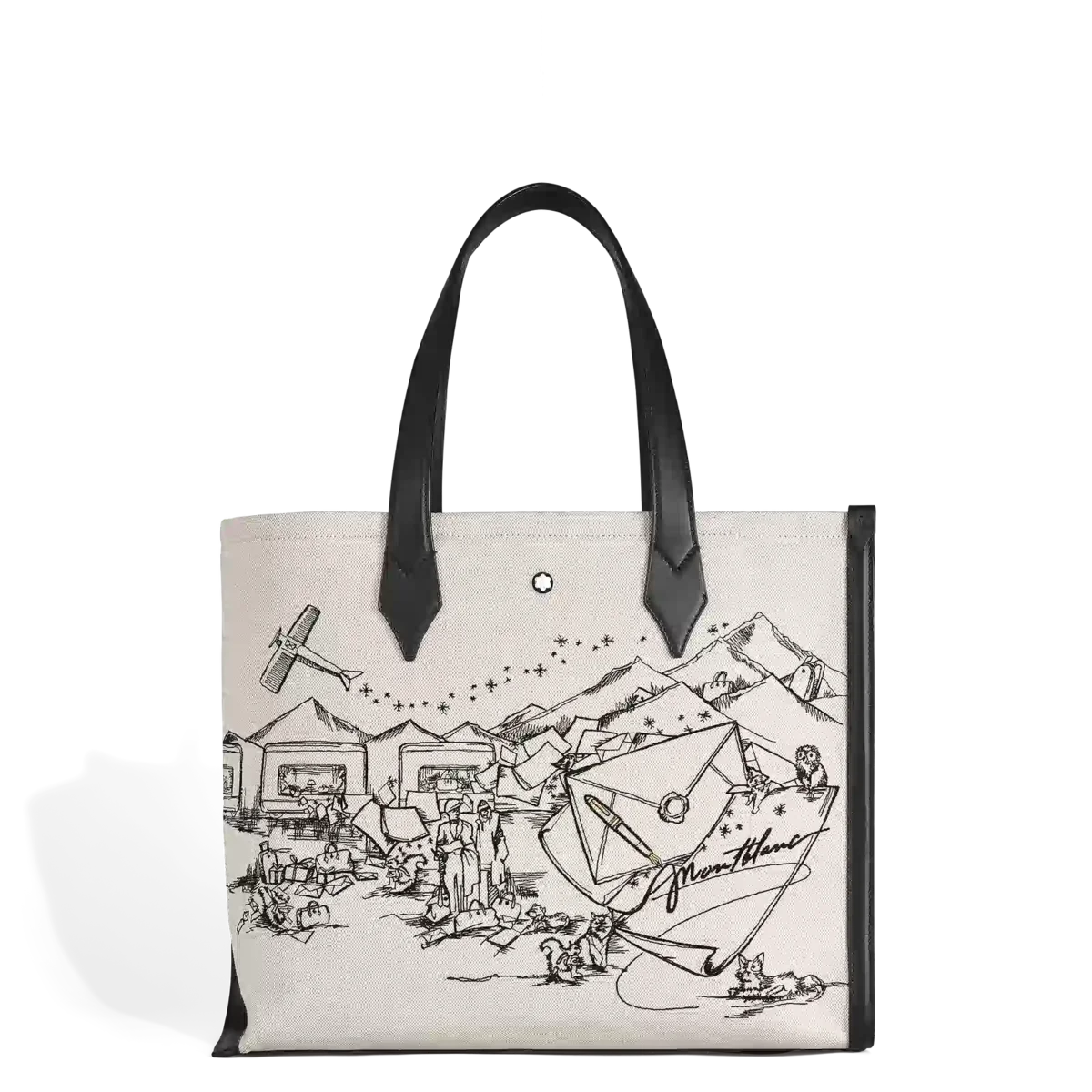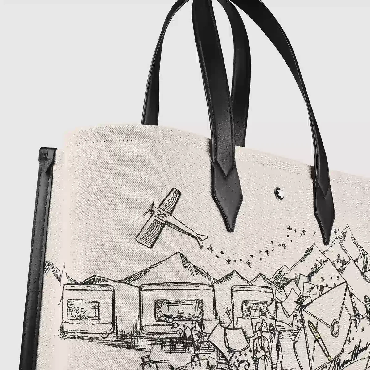 El exclusivo bolso tote Happy Holidays es una celebración de los viajes festivos, una verdadera oda al viaje de la escritura. Con lujosas asas de piel de becerro en forma de plumilla, el cuerpo del bolso está confeccionado en lona, con un patrón bordado a mano que recubre toda la parte delantera del bolso. Sobre el Mont Blanc, el patrón representa elementos de los archivos de Montblanc, el icónico Meisterstück, papeles y sobres arremolinados. Espacioso y funcional, el bolso cuenta con un bolsillo con cremallera, dos bolsillos abiertos y dos presillas para bolígrafos que permiten organizarlo fácilmente.
