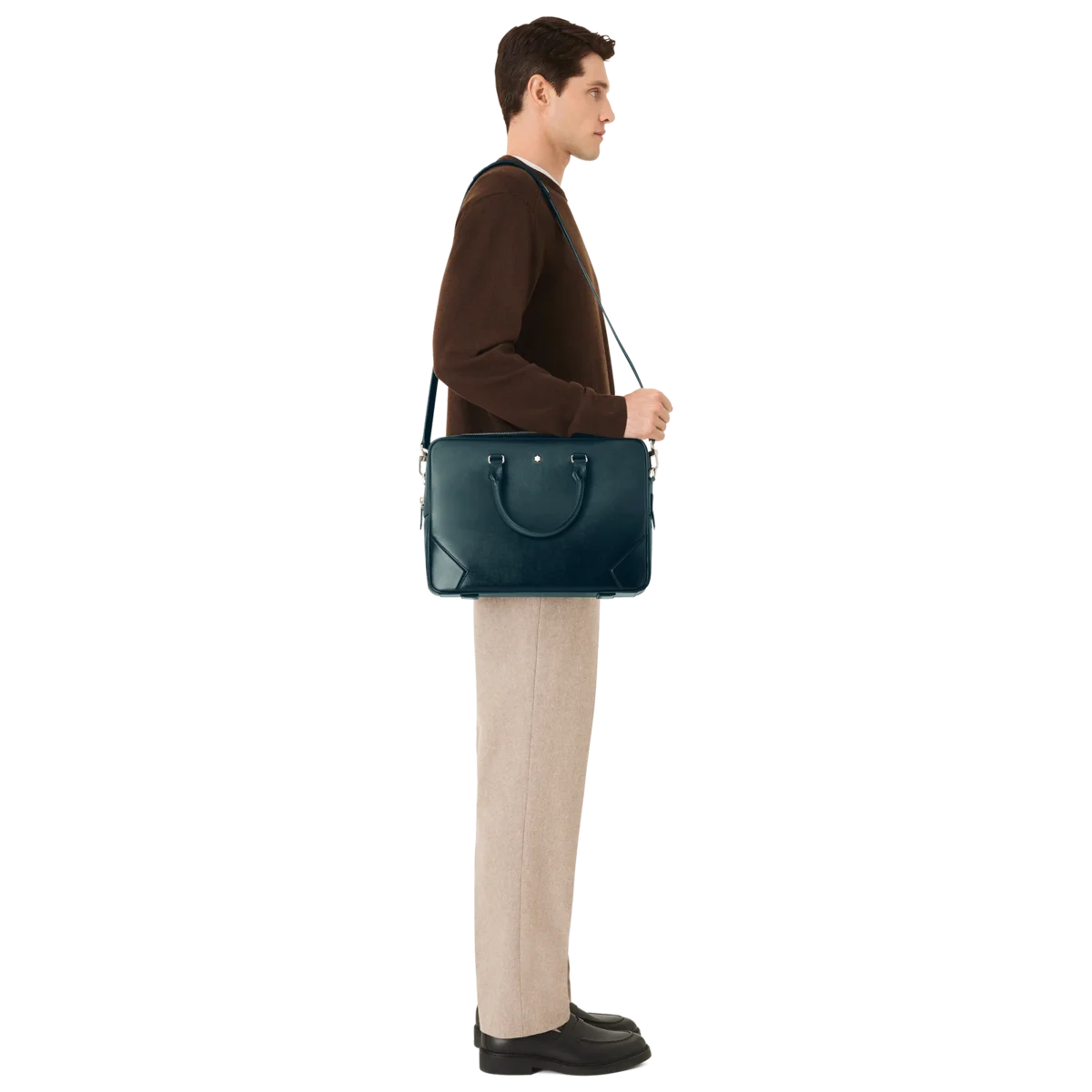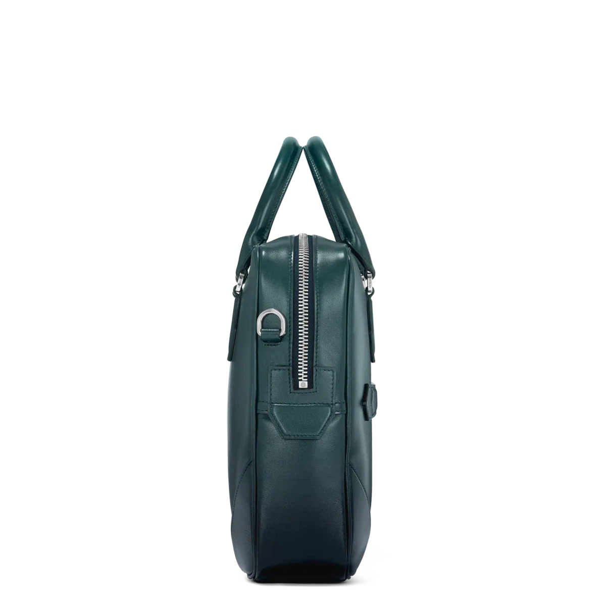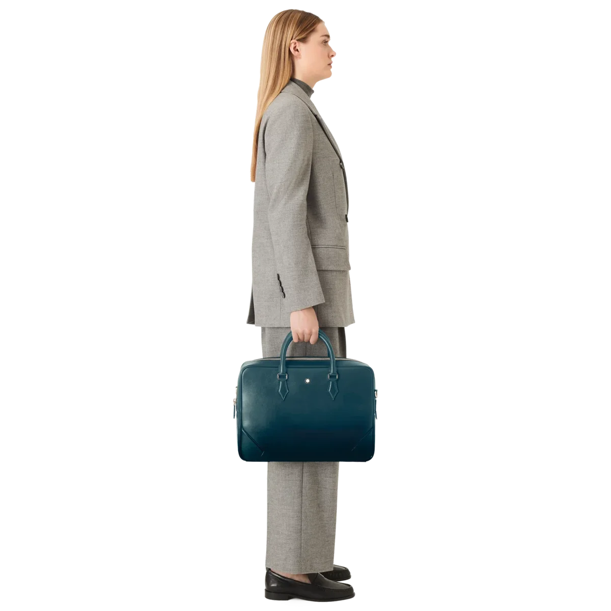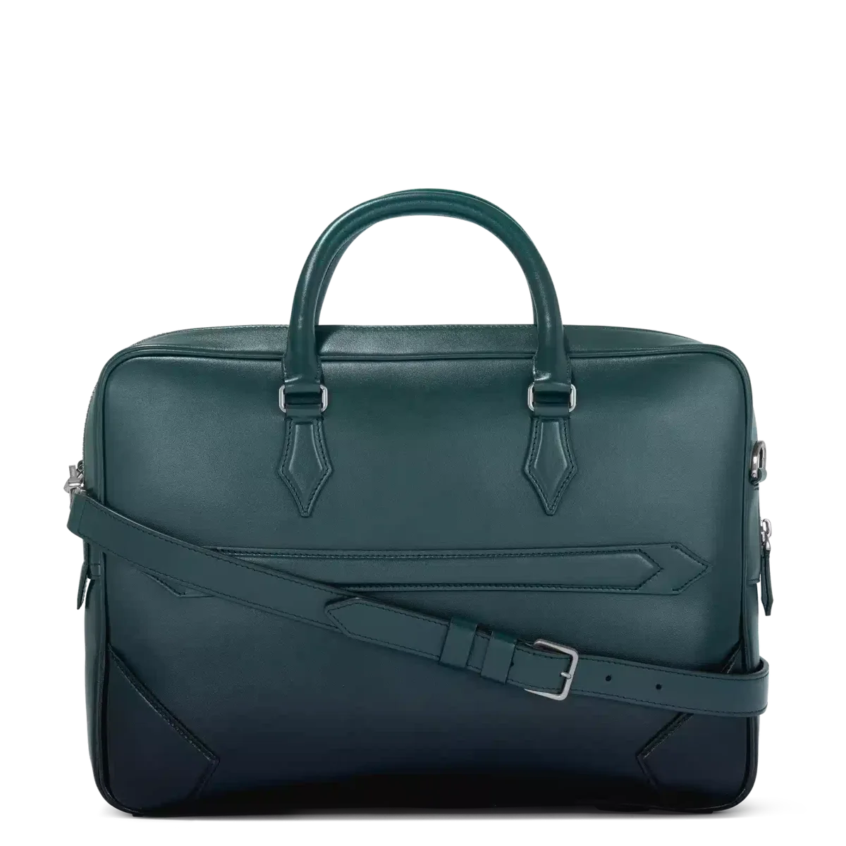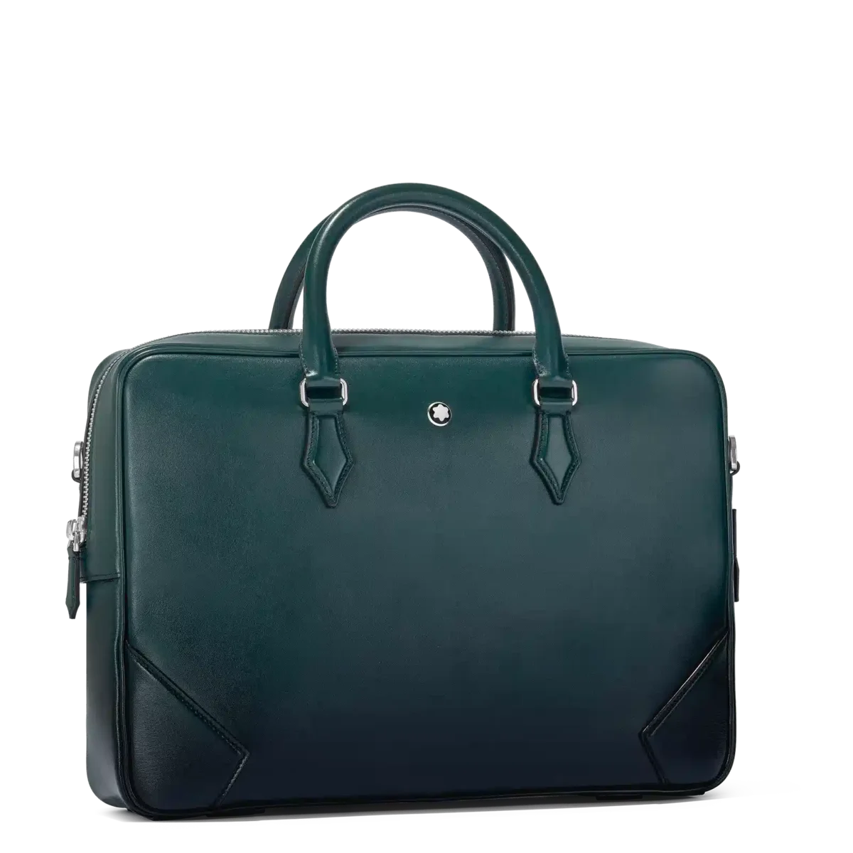 Experimente la esencia de la artesanía refinada con nuestro maletín Meisterstück, parte de nuestra exclusiva cápsula que celebra un siglo de artesanía Meisterstück. Fabricado en piel verde británica con efecto sfumato, este elegante compañero muestra la esencia de Montblanc. Inspirado en el plumín, las costuras, los tiradores de la cremallera y las asas rezuman elegancia. Con asas superiores de cuero, una correa para el hombro extraíble y un sistema satélite, ofrece múltiples opciones de transporte. En el interior encontrará un gran bolsillo abierto, un bolsillo con cremallera, dos bolsillos abiertos y dos presillas para instrumentos de escritura, lo que garantiza una organización perfecta. Mejore sus viajes de negocios con este sofisticado maletín para documentos, con capacidad para un ordenador portátil de hasta 13 pulgadas.
