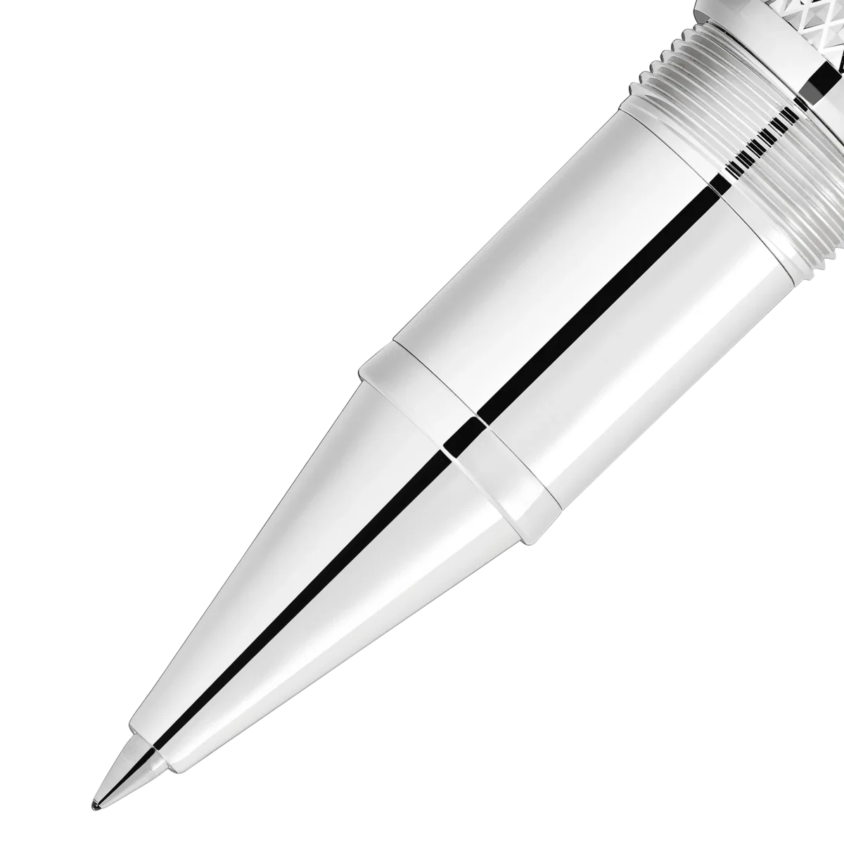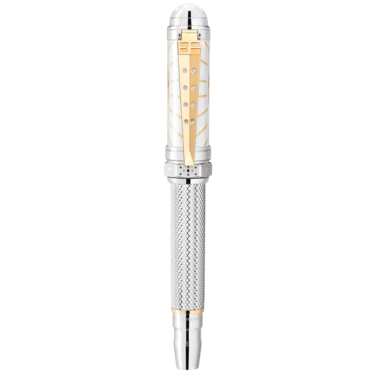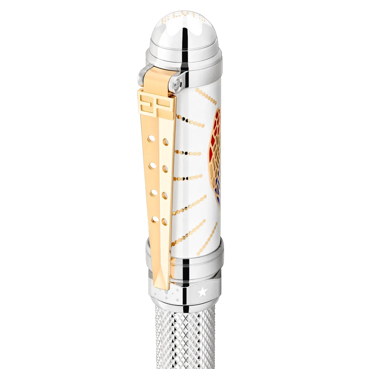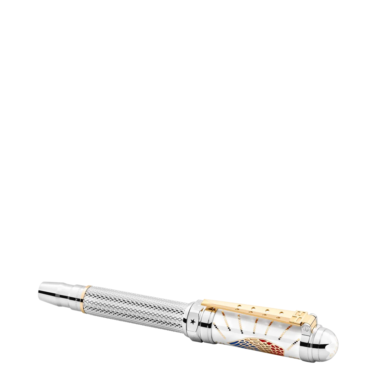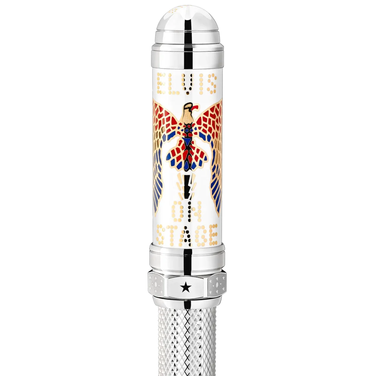 Elvis Presley sigue siendo considerado uno de los iconos culturales más importantes del siglo XX, el «Rey del Rock and Roll» que marcó a toda una generación. Nacido en 1935 en Tupelo, Misisipi, y trasladado a Memphis, Tennessee, Elvis Presley se convirtió en uno de los músicos más famosos. La forma general del instrumento de escritura es la de una bujía de motor de coche, inspirada en la pasión de Elvis por los motores V8, así como la forma del clip recubierto de oro. El patrón de la tapa y el cuerpo proviene del acabado del anillo de oro que llevó durante el concierto «Aloha from Hawaii». El clip tiene forma de V, inspirada en la pasión de Elvis por los Cadillac y su motor V8, y las letras «EP» provienen de sus gafas de sol características.