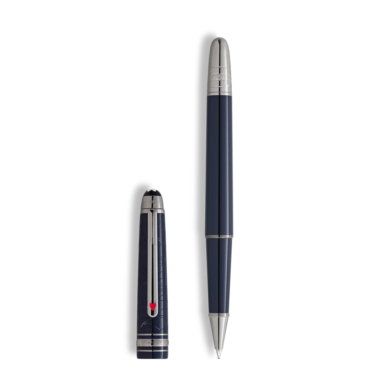 La colección Meisterstück Around the World in 80 Days se inspira en la famosa novela de aventuras de Julio Verne. El rollerball Classique, adornado con resina preciosa de color azul oscuro, narra el épico viaje del Sr. Fogg y Passepartout. Embarcándose en la última etapa desde Yokohama de vuelta a Londres pasando por Estados Unidos, el dúo atraviesa el vasto continente americano en tren. Sumérjase en los intrincados detalles: un tren elegantemente grabado con láser en el capuchón, un patrón de cadena de seguridad en el cono, que refleja un momento crucial en el que Passepartout separa el tren de la locomotora para salvar a la tripulación que fue atacada por los sioux.El diseño de la gorra captura las válvulas de presión y el humo que sale de la locomotora, mientras que el clip luce un naipe de corazones lacado en rojo, que simboliza la unión entre Phileas Fogg y la princesa Aouda. Además, los naipes representan la atrevida apuesta de Fogg de completar el viaje en solo 80 días. La parte superior de la gorra lleva grabada la cronología del viaje: 36 días desde Yokohama a Londres, culminando en un total de 80 días alrededor del mundo.