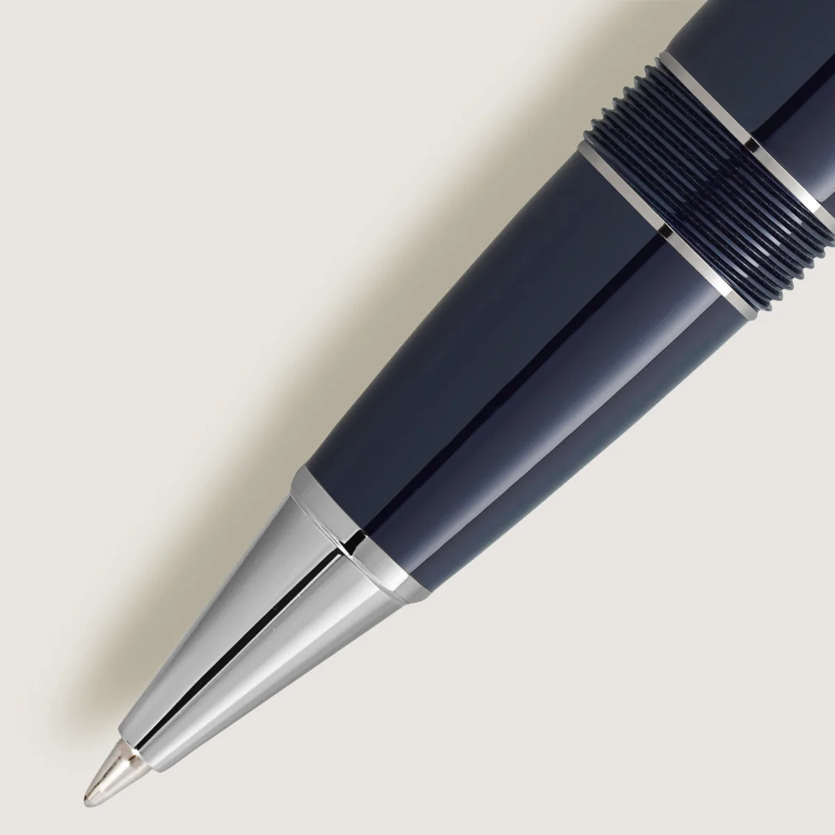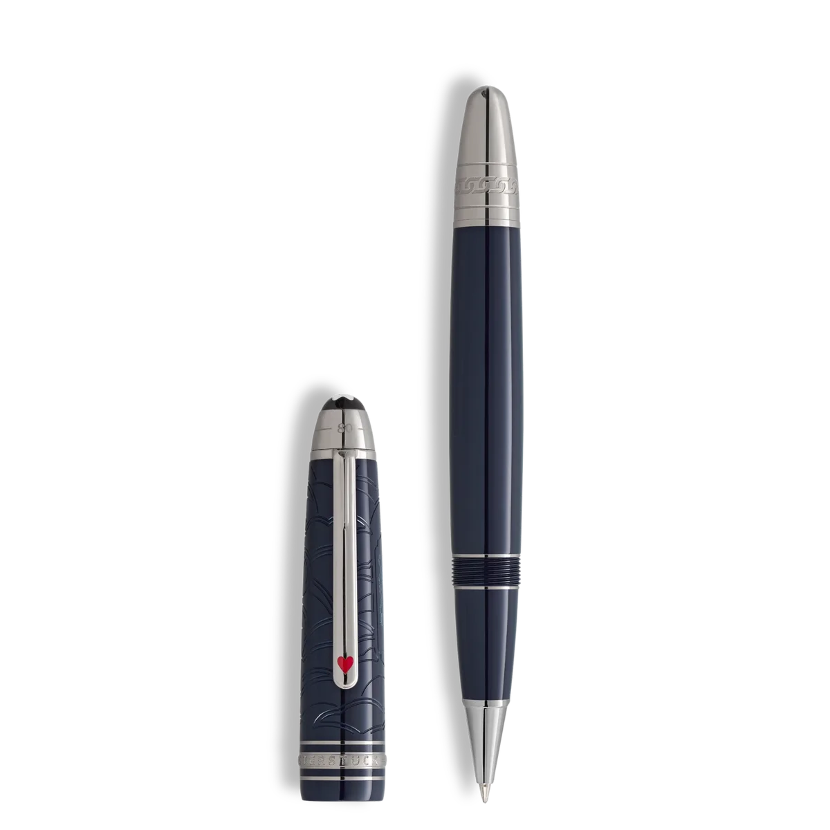 La colección Meisterstück Around the World in 80 Days se inspira en la famosa novela de aventuras de Julio Verne. El bolígrafo LeGrand Rollerball, adornado con resina preciosa de color azul oscuro, narra el épico viaje del Sr. Fogg y Passepartout. Embarcándose en la última etapa desde Yokohama de vuelta a Londres pasando por Estados Unidos, el dúo atraviesa el vasto continente americano en tren. Sumérjase en los intrincados detalles: un tren elegantemente grabado con láser en el capuchón, un patrón de cadena de seguridad en el cono, que refleja un momento crucial en el que Passepartout separa el tren de la locomotora para salvar a la tripulación que fue atacada por los sioux.El diseño de la gorra captura las válvulas de presión y el humo que sale de la locomotora, mientras que el clip luce un naipe de corazones lacado en rojo, que simboliza la unión entre Phileas Fogg y la princesa Aouda. Además, los naipes representan la atrevida apuesta de Fogg de completar el viaje en solo 80 días. La parte superior de la gorra lleva grabada la cronología del viaje: 36 días desde Yokohama a Londres, culminando en un total de 80 días alrededor del mundo.