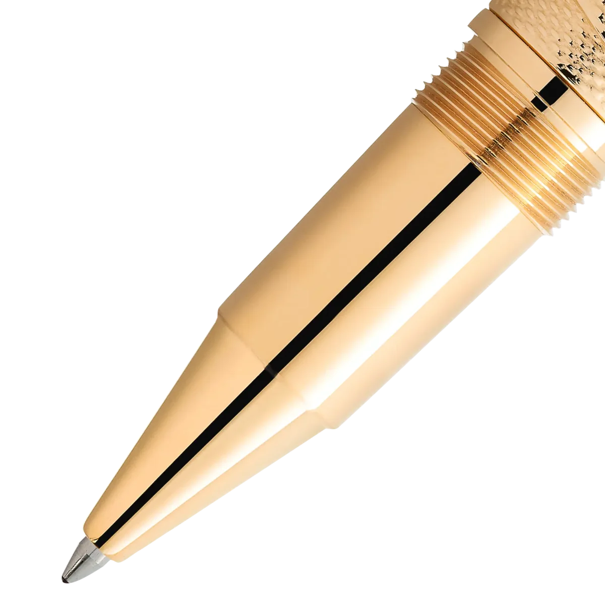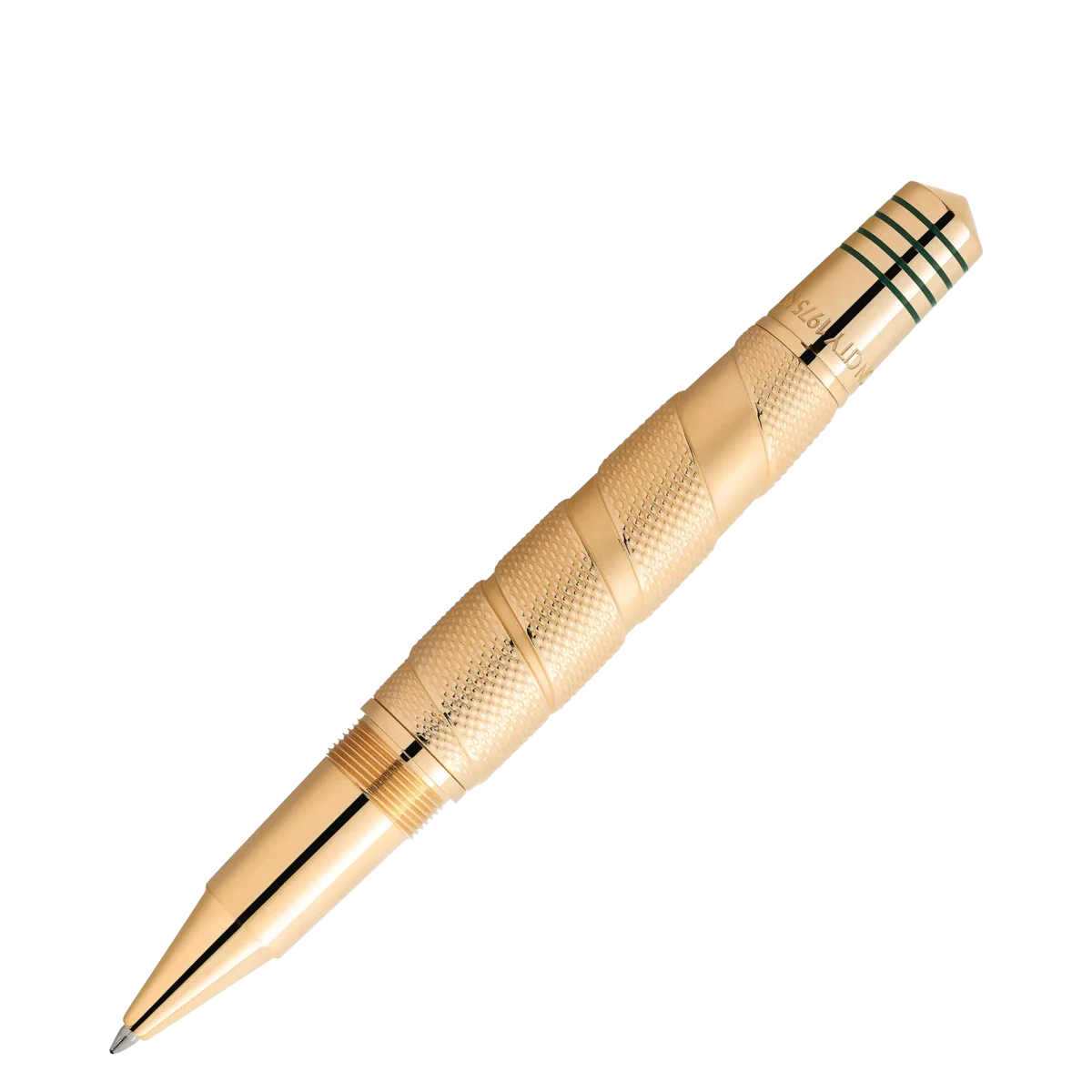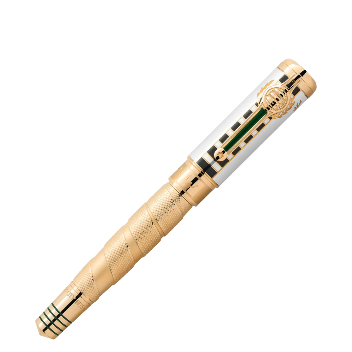 Pocos atletas son tan celebrados y honrados como el tres veces campeón del mundo de peso pesado Muhammad Ali, cuyos momentos legendarios en el deporte y el activismo por los derechos civiles lo convirtieron en uno de los atletas y humanitarios más influyentes del siglo XX. Como atleta, Ali conmocionó al mundo con su fuerza, habilidad y personalidad, convirtiéndose en campeón del mundo de peso pesado con solo 22 años. Sin embargo, su mayor triunfo fue el resultado de sus esfuerzos humanitarios. Inspirada en la bata que Ali llevó cuando entró en el legendario combate de Kinshasa, Zaire, en 1974, la preciosa laca del capuchón representa este distintivo patrón, mientras que el patrón del cuerpo recubierto de oro se asemeja a las vendas de boxeo que los atletas utilizan para vendarse las manos. La mariposa recubierta de oro de la gorra se inspira en su característico estilo de lucha: «Flota como una mariposa, pica como una abeja». El cono puntiagudo retoma esa idea y las cuatro líneas lacadas se asemejan a las cuerdas de un ring de boxeo. Las inscripciones del cono hacen referencia a la victoria de Ali en el combate de 1974 apodado «Rumble in the Jungle», en el que Ali ganó su segundo campeonato mundial de peso pesado. Los detalles de su victoria, concretamente que ganó en el octavo asalto por nocaut técnico, se pueden encontrar en el anillo del capuchón. El cono también hace referencia a una famosa pelea de Ali en 1975, apodada «Thrilla in Manila». Para celebrar su segundo título, el emblema de Montblanc en resina preciosa blanca está adornado con un «2». Para subrayar este éxito, el clip tiene la forma de un cinturón de campeón de boxeo y lleva su nombre.