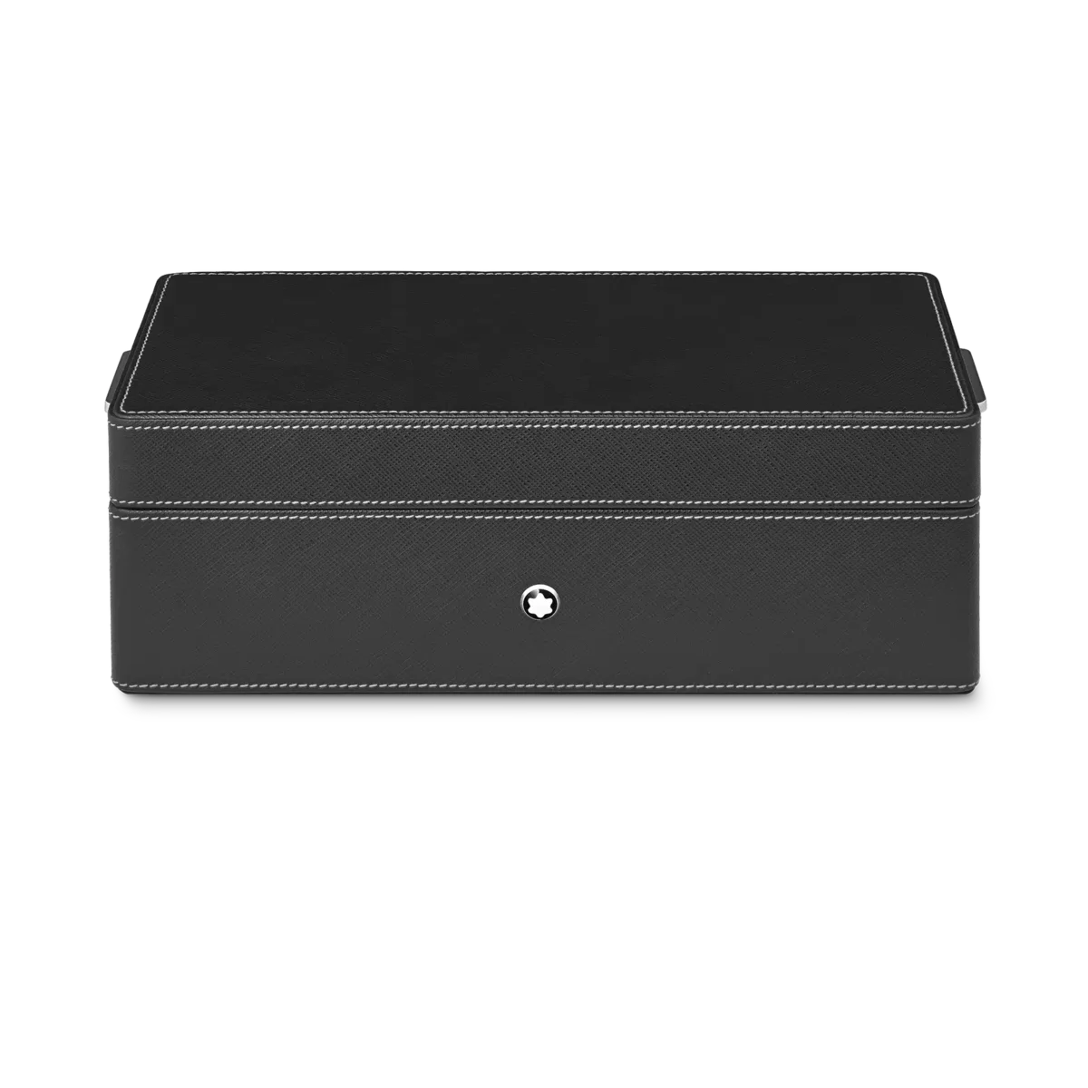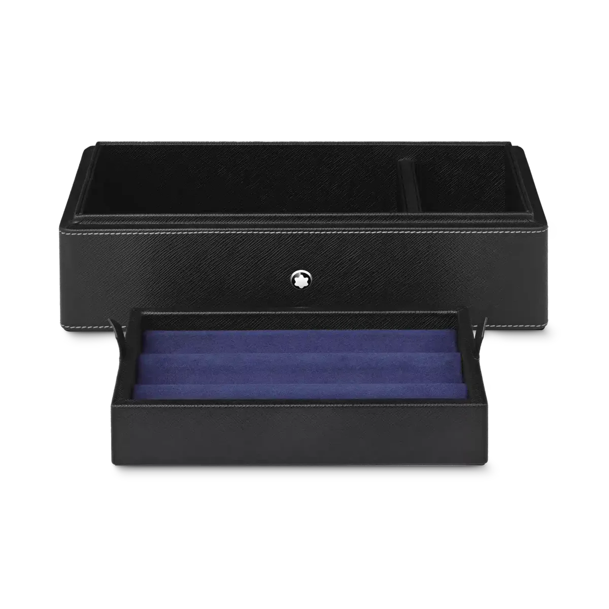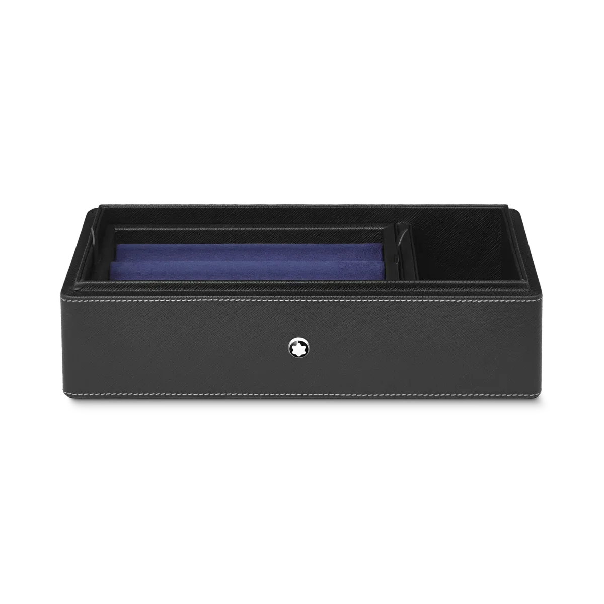 Caja de escritorio Montblanc de piel negra. Tiene capacidad para 3 instrumentos de escritura y un tintero. La tapa funciona como bandeja adicional.