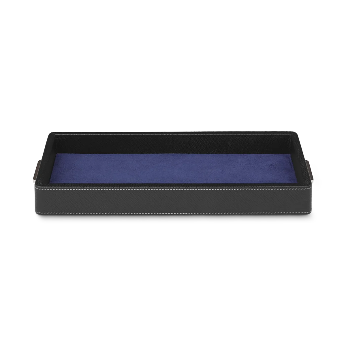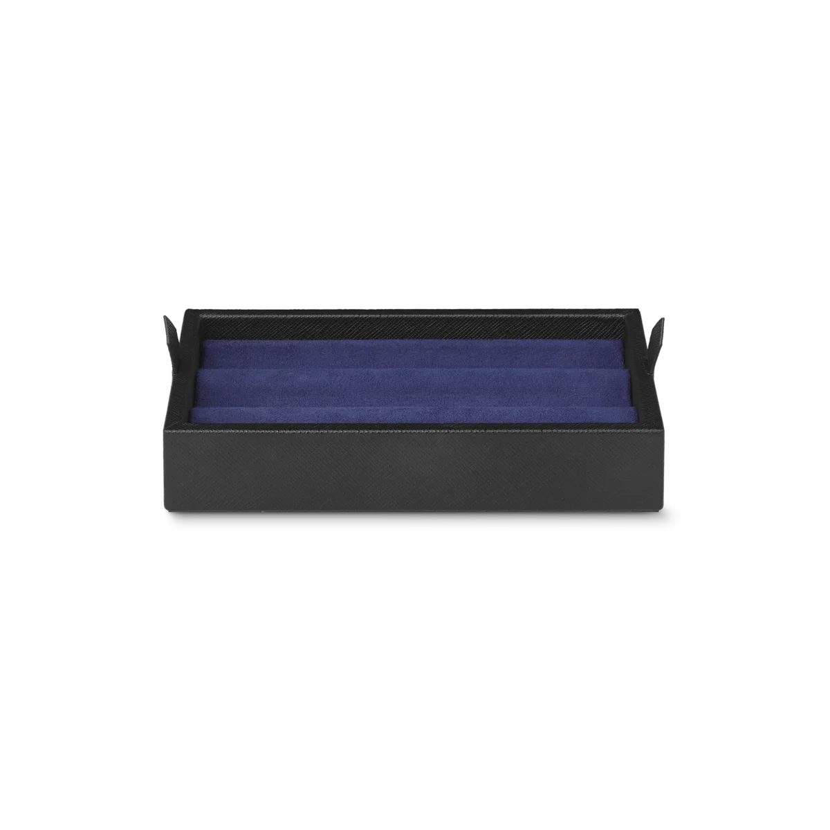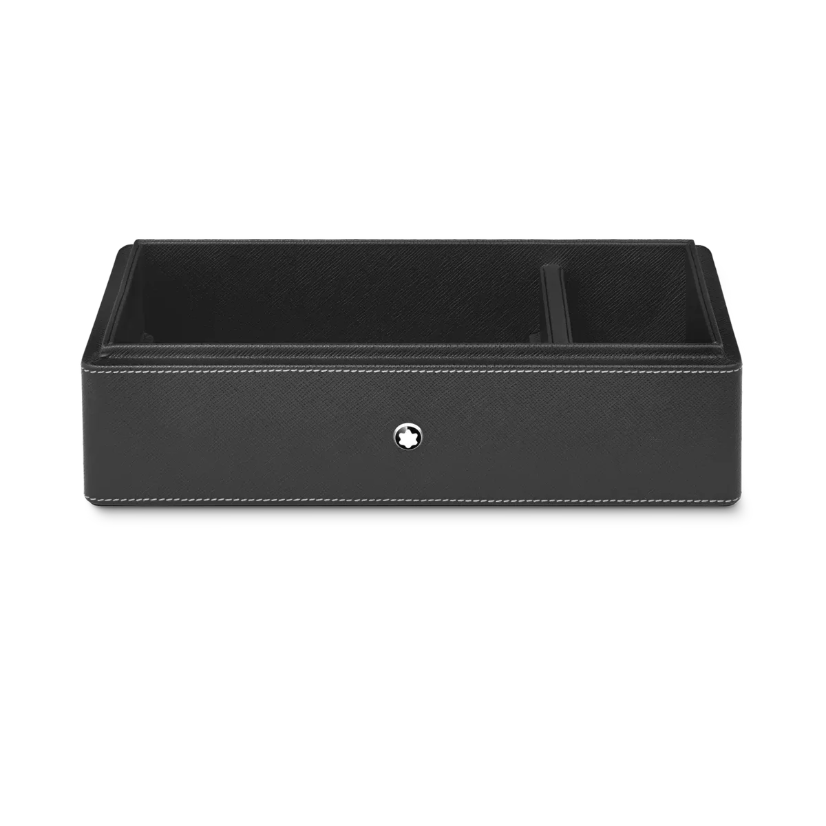 Caja de escritorio Montblanc de piel negra. Tiene capacidad para 3 instrumentos de escritura y un tintero. La tapa funciona como bandeja adicional.