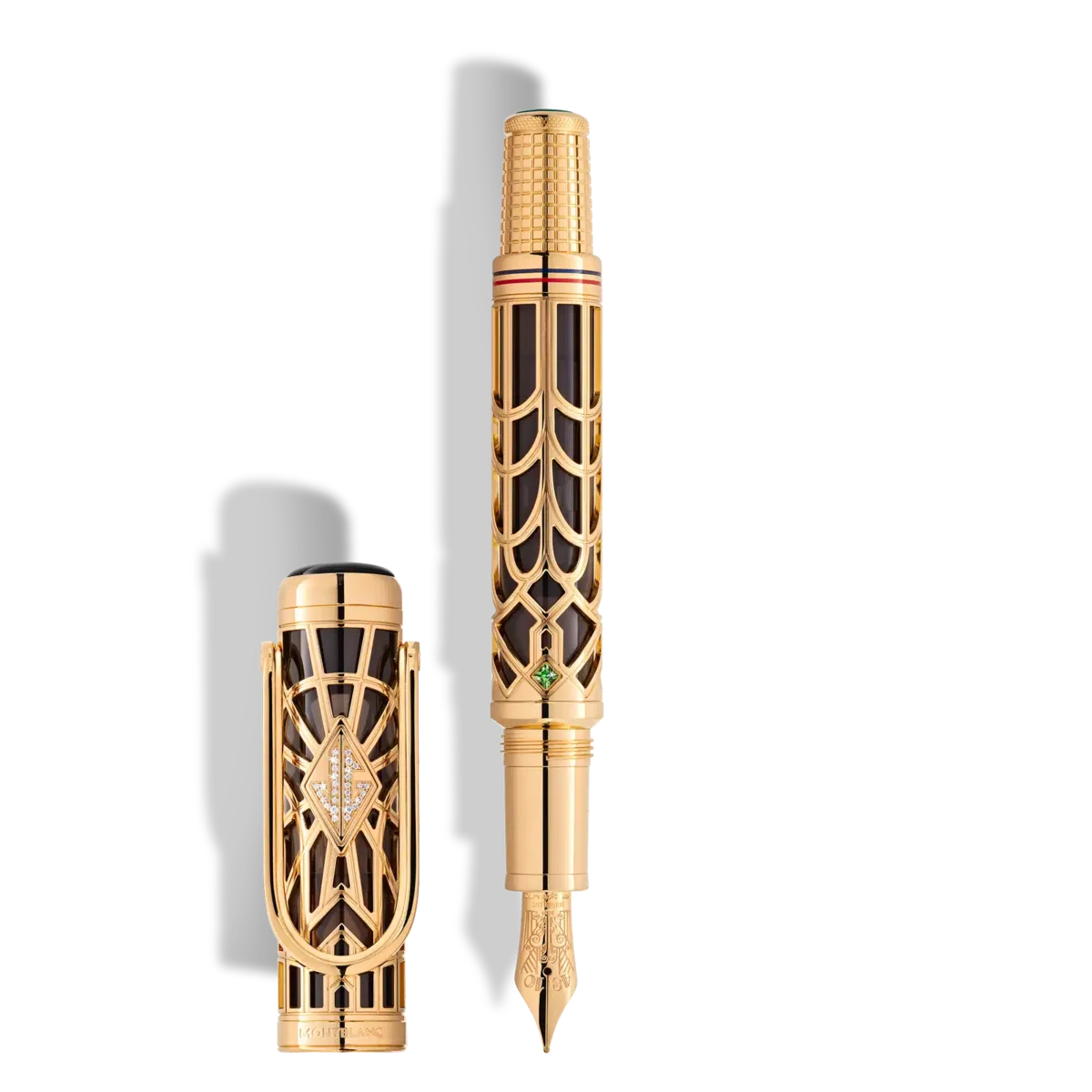 Hay novelas que pasan a la historia de la literatura y, al mismo tiempo, se convierten en símbolo de toda una época. La gran Gatsby, de F. Scott Fitzgerald, es una de esas joyas de la literatura estadounidense moderna. Publicada en 1925, la novela pinta un fascinante retrato de la era del jazz y los locos años veinte, una época de riqueza y autoindulgencia sin precedentes. La vibrante ciudad de Nueva York, las opulentas mansiones de Long Island y las deslumbrantes fiestas de la alta sociedad son el telón de fondo de la historia de Jay Gatsby, un misterioso millonario que no se detendrá ante nada para recuperar el amor perdido de su juventud, Daisy Buchanan. Montblanc rinde homenaje a esta obra maestra literaria, tan filmada y sinónimo del glamuroso mundo del Art Déco, con la edición limitada Great Characters Homage to The Great Gatsby 100. El Art Déco confería un brillo glamuroso a todo. La arquitectura literalmente irrumpió en el plano bidimensional y se elevó hacia el cielo, simbolizando el progreso y la emancipación. Sus arcos decorativos, escalones, ángulos y líneas irregulares dotaron a los edificios de una dinámica y una estética inconfundibles, y claramente también inspiraron esta edición limitada. Los arcos y líneas simétricos esqueletizados, elaborados en oro amarillo macizo Au 750, revelan la superficie negra y translúcida que hay debajo. Las brillantes tsavoritas verdes de la tapa y el barril hacen referencia a la luz verde del muelle de la casa de Daisy, símbolo de esperanza para el millonario enamorado Jay Gatsby, más conocido como El gran Gatsby. Las imágenes del producto pueden diferir del producto real. Jay Gatsby es la encarnación de un ideal universal, el hombre hecho a sí mismo estadounidense. Sin embargo, detrás de la fachada de riqueza de Gatsby, el sueño comienza a desmoronarse. Su riqueza proviene del comercio de alcohol durante la época de la Ley Seca, cuando la bebida prohibida se envasaba a menudo en pequeñas botellas con tapón de rosca que eran fáciles de ocultar. Cada gota era preciosa. En consecuencia, no solo se veneraba el contenido, sino también el diseño de los petacas. Para la edición limitada Great Characters Homage to The Great Gatsby 100, el cono imita el tapón de rosca grabado de una petaca Art Déco. El mito del sueño americano se evoca en los finos anillos con los colores de la bandera estadounidense que adornan el cono. Al igual que la capa esquelética, los accesorios de la edición están hechos de oro amarillo macizo de 750 milésimas, ya que el oro es el símbolo de la riqueza, el poder y el estatus, y el color amarillo es el que más se menciona en la novela. Por el contrario, el tapón y el cuerpo, de color negro intenso y translúcido, representan la corrupción y la decadencia moral que se esconde tras la brillante fachada de la sociedad acomodada. La radiante luz verde que brilla cada noche en el muelle de la casa de Daisy es el único rayo de esperanza y se representa aquí, junto con la tsavorita del tapón y el cuerpo esqueletizados, mediante una incrustación de malaquita verde en el cono. Representa el anhelo de un futuro mejor y el deseo de Gatsby de recuperar a Daisy. Sin embargo, su amor sigue sin ser correspondido, inalcanzable a pesar de toda su riqueza. El poder embriagador, pero aparentemente ilusorio, del dinero está simbolizado por el clip recubierto de oro en forma de pinza para billetes. Su abertura redondeada está decorada con las iniciales de Jay Gatsby, engastadas en diamantes, en forma de monograma romboidal Art Déco. El emblema de Montblanc que corona la pieza está hecho de nácar rodeado de ónix negro, una combinación de materiales que inspiró algunas de las creaciones más elegantes de los diseñadores de joyas del periodo Art Déco. La elegancia de sus líneas es el motivo clave del Art Déco, llamativo y sofisticado al mismo tiempo.Un grabado puramente lineal también adorna el plumín de oro macizo Au 750 hecho a mano. La cifra 100 es significativa en más de un sentido. Indica el número limitado de piezas de la edición limitada Great Characters Homage to The Great Gatsby 100, en alusión al centenario del personaje de ficción, es decir, el centenario de la publicación de la novela. Además, hace referencia al mundo del dinero y al billete de dólar de mayor denominación en circulación en ese momento.