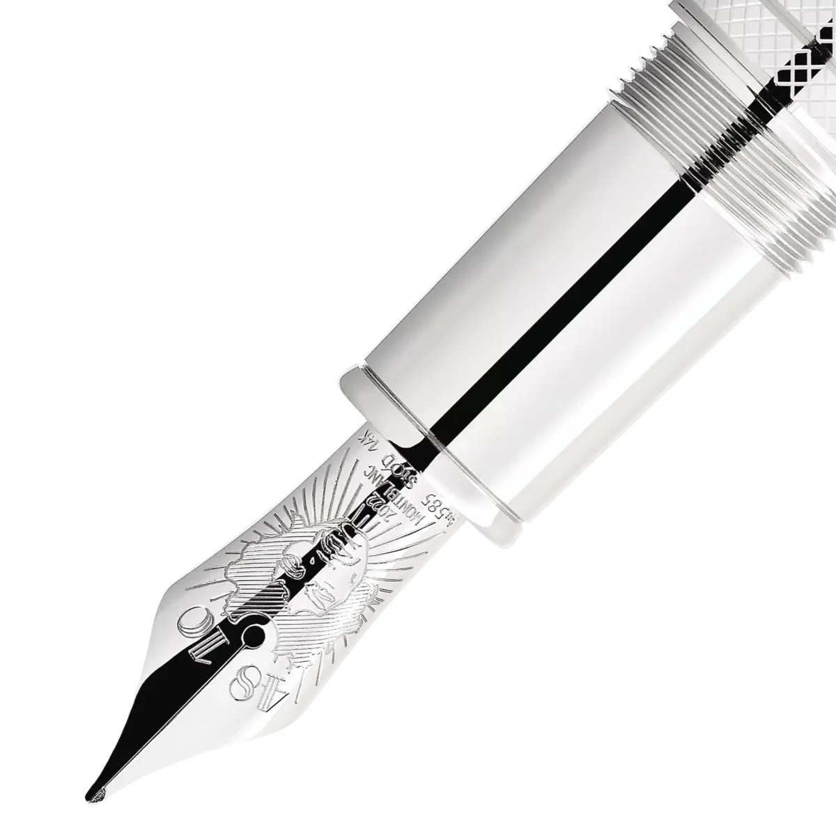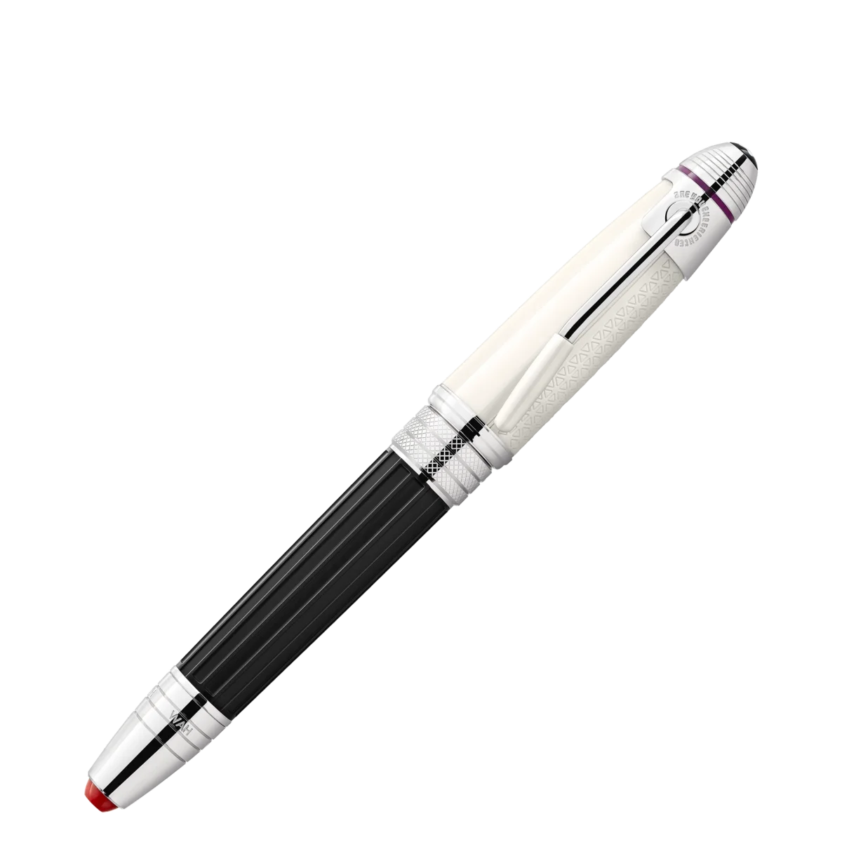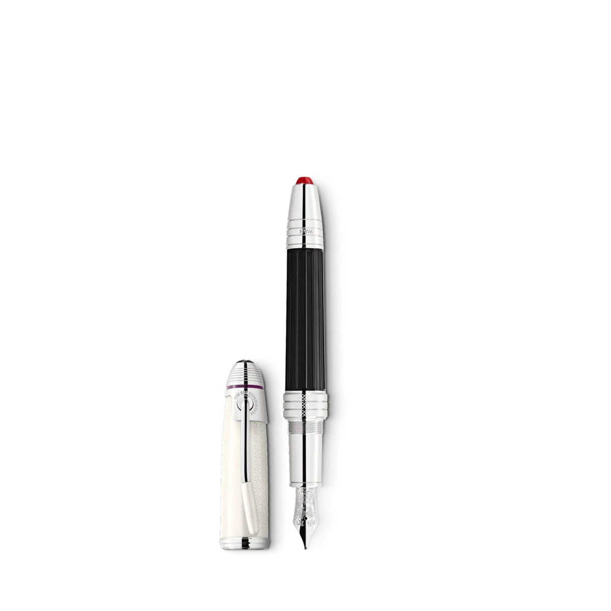 En 2022, Montblanc rinde homenaje a uno de los músicos más célebres del siglo XX, considerado por muchos como uno de los guitarristas eléctricos más influyentes de la historia de la música popular: Jimi Hendrix. Fabricada en resina preciosa, el color blanco roto del capuchón y su patrón grabado se inspiran en una de las correas de guitarra que llevaba Hendrix, mientras que el cuerpo negro presenta un elegante patrón que recuerda a un pedal WAH. El clip recubierto de platino está angulado para parecerse a la barra de vibrato de una guitarra eléctrica. El emblema de Montblanc en la parte superior del capuchón está fabricado en resina preciosa. Otro detalle llamativo es el anillo del cuerpo recubierto de platino, inspirado en un cable de guitarra de los años 60, en el que está grabada la fecha de un famoso concierto de Jimi Hendrix. El plumín de oro macizo Au 585 con recubrimiento de rodio, fabricado a mano, lleva un retrato de Jimi Hendrix.