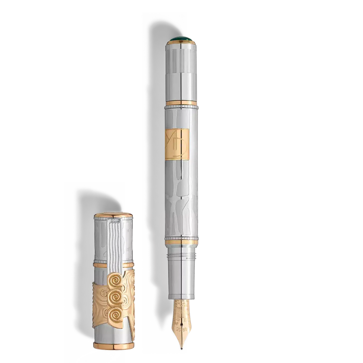 A lo largo de la historia, los grandes artistas han expresado la experiencia humana en un lenguaje universal de forma y belleza. La colección Montblanc Masters of Art rinde homenaje a su eterna contribución a la búsqueda de la perfección en el arte, una búsqueda que Montblanc celebra y en la que participa. Un artista cuya visión ayudó a dar forma al Art Nouveau vienés y a la Edad de Oro es Gustav Klimt. La edición limitada Montblanc Masters of Art Homage to Gustav Klimt 888 celebra su activo compromiso con la Secesión de Viena y presenta elementos destacados del diseño de su friso de Beethoven, la obra maestra a gran escala de su «fase dorada» que creó para el edificio de la Secesión. La capa de oro amarillo macizo Au 750 en relieve sobre el capuchón recubierto de platino, con sus espirales y líneas verticales que simbolizan las cuerdas de una lira, es una referencia a la ornamentación dorada del friso de Beethoven, así como a su figura poética tocando la lira, cuyos sonidos, según se dice, sacian el anhelo de felicidad de la humanidad. Las líneas bidimensionales inspiradas en los relieves de la fachada del edificio de la Secesión brillan sobre el fondo mate del capuchón y el cuerpo recubiertos de platino. La combinación de oro amarillo macizo Au 750 y elementos recubiertos de platino en el capuchón y el cuerpo evoca los materiales experimentales y lujosos típicos de Gustav Klimt. La interacción se ve enriquecida por un cabujón de malaquita en el cono. El color verde de la malaquita evoca la primavera, la estación de los nuevos comienzos. En reconocimiento a los logros de Klimt para la Secesión de Viena, la incrustación de oro macizo Au 750 en el cuerpo lleva su monograma de la Secesión con las iniciales GK. El clip de la edición limitada Homage to Gustav Klimt 888 está especialmente diseñado con referencia a la Pallas Athene de Gustav Klimt. Dado que Atenea es la diosa tanto de la guerra como de las artes, se la representa iniciando la lucha por la libertad artística. Las líneas ligeramente curvadas que terminan en tres espirales en el clip de la Limited Edition 888, recubierto en parte de platino y en parte de oro amarillo, se corresponden con la decoración del marco de metal forjado. El plumín de oro amarillo macizo Au 750 hecho a mano de la Homage to Gustav Klimt Limited Edition 888 está adornado con elementos gráficos finamente grabados que forman los típicos patrones geométricos que se ven en muchas de las obras de Gustav Klimt.