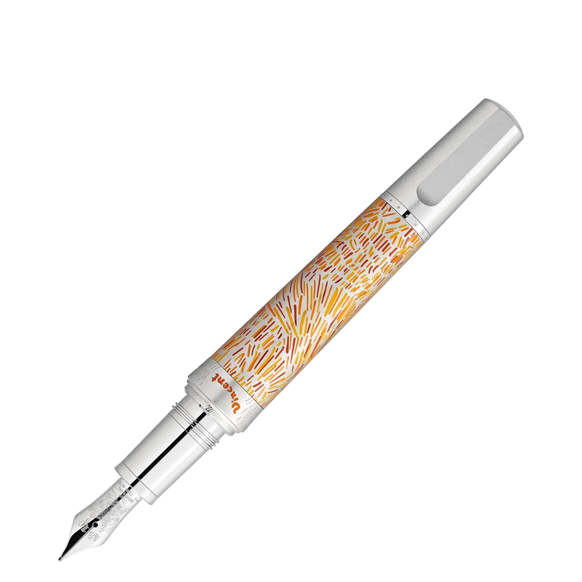 Con la edición limitada Montblanc Masters of Art Homage to Vincent van Gogh 4810, Montblanc rinde homenaje a Vincent van Gogh, uno de los pintores más populares de finales del siglo XIX. Esta edición hace especial hincapié en su estancia en Arlés con detalles de diseño que reflejan los campos de trigo provenzales y uno de sus cuadros más famosos, «Los girasoles».El año 1888 grabado en el anillo del cuerpo, junto a la firma de Vincent en naranja brillante, conmemora el año en que se trasladó a Arlés. Mientras que el cuerpo está decorado en tonos amarillos y naranjas que reflejan los paisajes bañados por el sol del sur de Francia, la famosa serie de cinco cuadros de girasoles inspiró la interpretación grabada en el plumín artesanal de oro macizo Au 750 recubierto de rodio. Van Gogh desarrolló un estilo más suelto y libre, y se volvió igualmente competente con el pincel y la espátula, que utilizaba para crear obras gruesas e impetuosas con la técnica del «impasto». Su espátula inspiró el clip recubierto de platino, mientras que su amplia pincelada queda inmortalizada en la laca amarilla de la parte superior del capuchón. Además, su afición por fumar en pipa, a la que alude en muchos de sus autorretratos, queda plasmada en un sutil detalle del clip: la parte superior tiene la forma de la cazoleta de una pipa y está rellena de resina preciosa amarilla. Como homenaje a la fascinación de Vincent por los grabados tradicionales japoneses en madera, la forma general se inspira en un cuchillo japonés para tallar madera, mientras que el capuchón está fabricado en madera.La edición está coronada por un emblema de Montblanc fabricado en resina preciosa amarilla. N.º de identificación: MB129154. Peso físico: 104,6 g. Dimensiones: 147,9 mm * 18,1 mm.