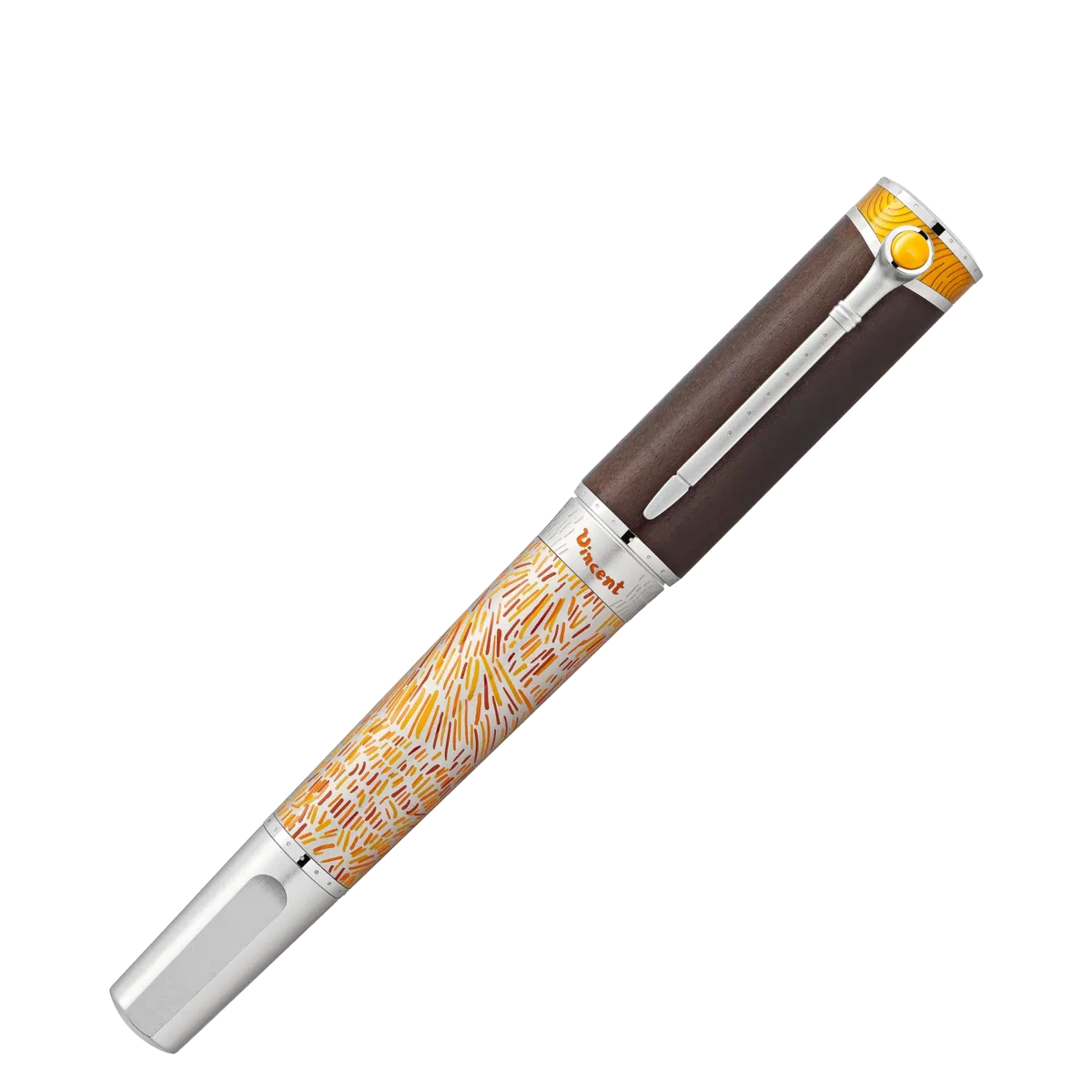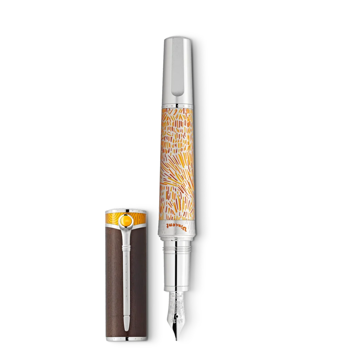 Con la edición limitada 4810 Masters of Art Homage to Vincent van Gogh, Montblanc rinde homenaje a Vincent van Gogh, uno de los pintores más populares de finales del siglo XIX. Esta edición hace especial hincapié en su estancia en Arlés con detalles de diseño que reflejan los campos de trigo provenzales y uno de sus cuadros más famosos, «Los girasoles». El año 1888 grabado en el anillo del cuerpo, junto a la firma de Vincent en naranja brillante, conmemora el año en que se trasladó a Arlés. Mientras que el cuerpo está decorado en tonos amarillos y naranjas que reflejan los paisajes bañados por el sol del sur de Francia, la famosa serie de cinco cuadros de girasoles inspiró la interpretación grabada en el plumín artesanal de oro macizo Au 750 recubierto de rodio. Van Gogh desarrolló un estilo más suelto y libre, y se volvió igualmente competente con el pincel y la espátula, que utilizaba para crear obras gruesas e impetuosas con la técnica del «impasto». Su espátula inspiró el clip recubierto de platino, mientras que su amplia pincelada queda inmortalizada en la laca amarilla de la parte superior del capuchón. Además, su afición por fumar en pipa, a la que alude en muchos de sus autorretratos, queda plasmada en un sutil detalle del clip: la parte superior tiene la forma de la cazoleta de una pipa y está rellena de resina preciosa amarilla. Como homenaje a la fascinación de Vincent por los grabados tradicionales japoneses en madera, la forma general se inspira en un cuchillo japonés para tallar madera, mientras que el capuchón está fabricado en madera. La edición está coronada por un emblema Montblanc de resina preciosa amarilla.