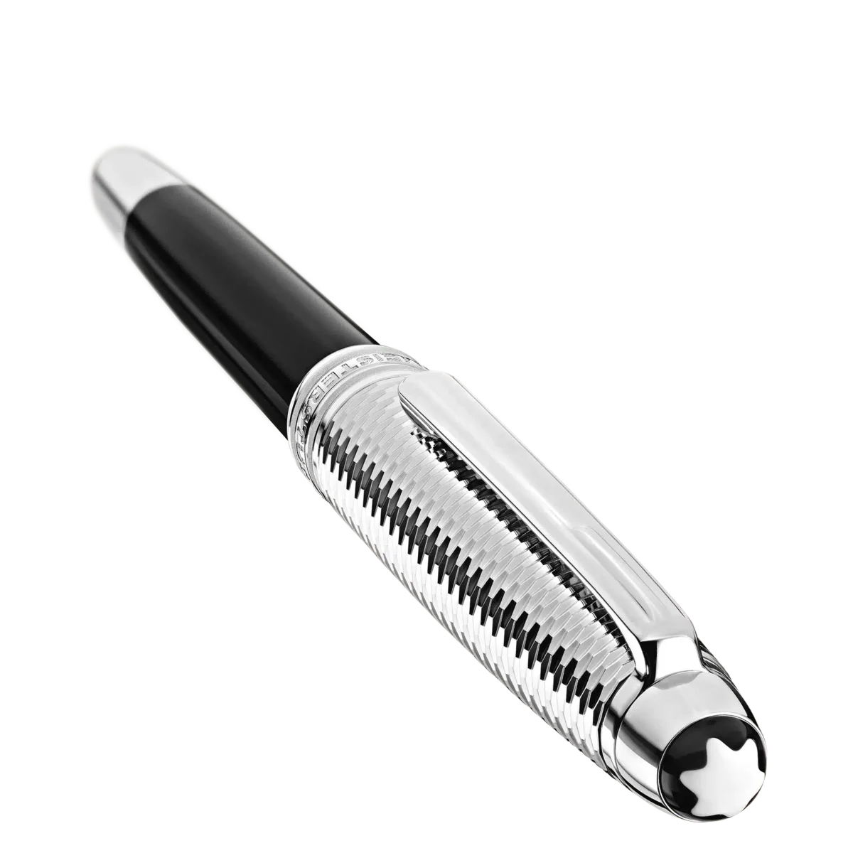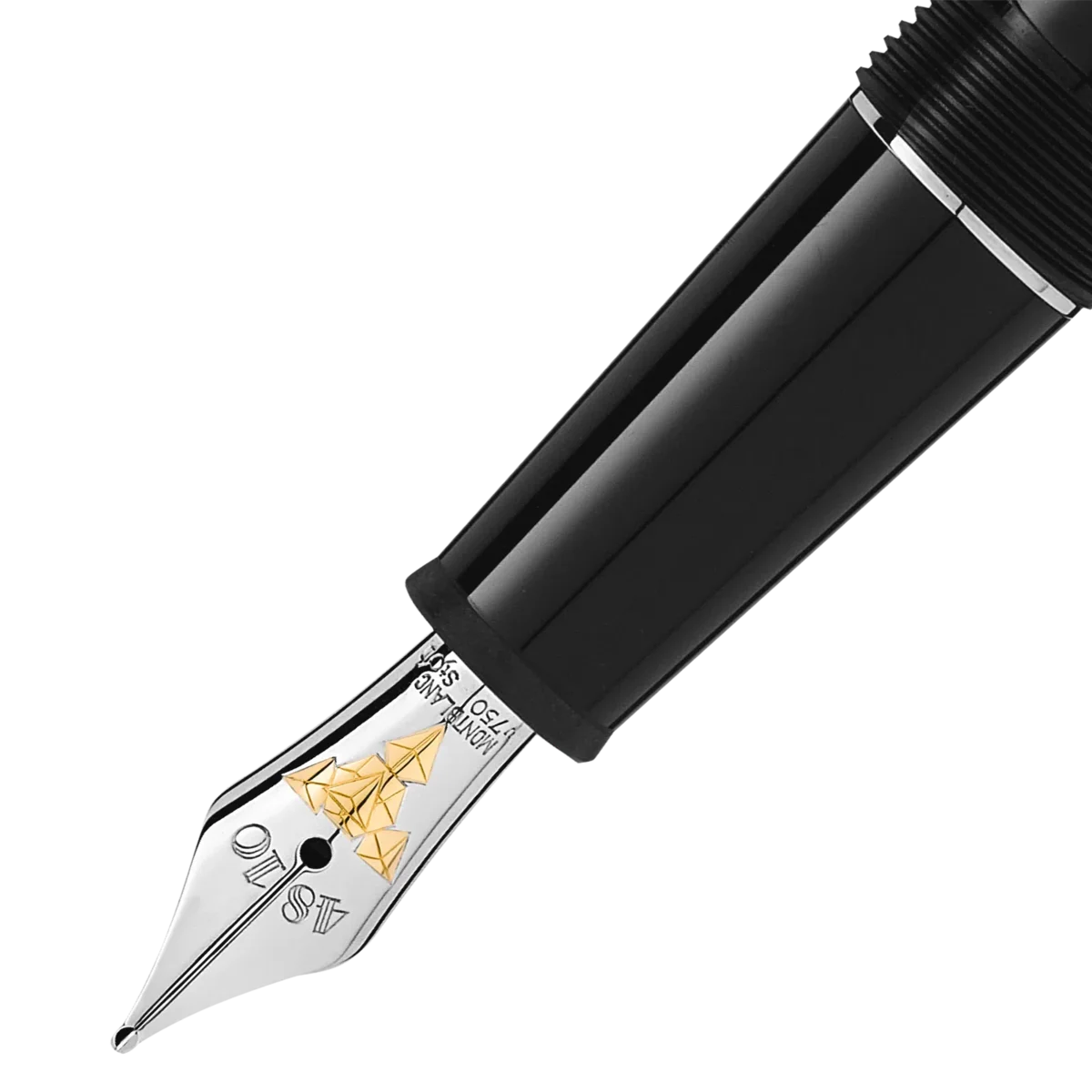 La Meisterstück Solitaire Geometric Dimension nació del deseo de unir el diseño clásico de Montblanc con materiales únicos. Este instrumento de escritura, fabricado en resina preciosa negra, con un grabado tridimensional de motivos geométricos en el capuchón con efecto óptico en un sofisticado tono platino, cuenta con un plumín bicolor Au750 con un diseño especial, un clip recubierto de platino y tres anillos recubiertos de platino con el nombre de la marca Montblanc grabado en relieve. Acabado con un emblema Montblanc de nácar, apela a la individualidad de cada persona.