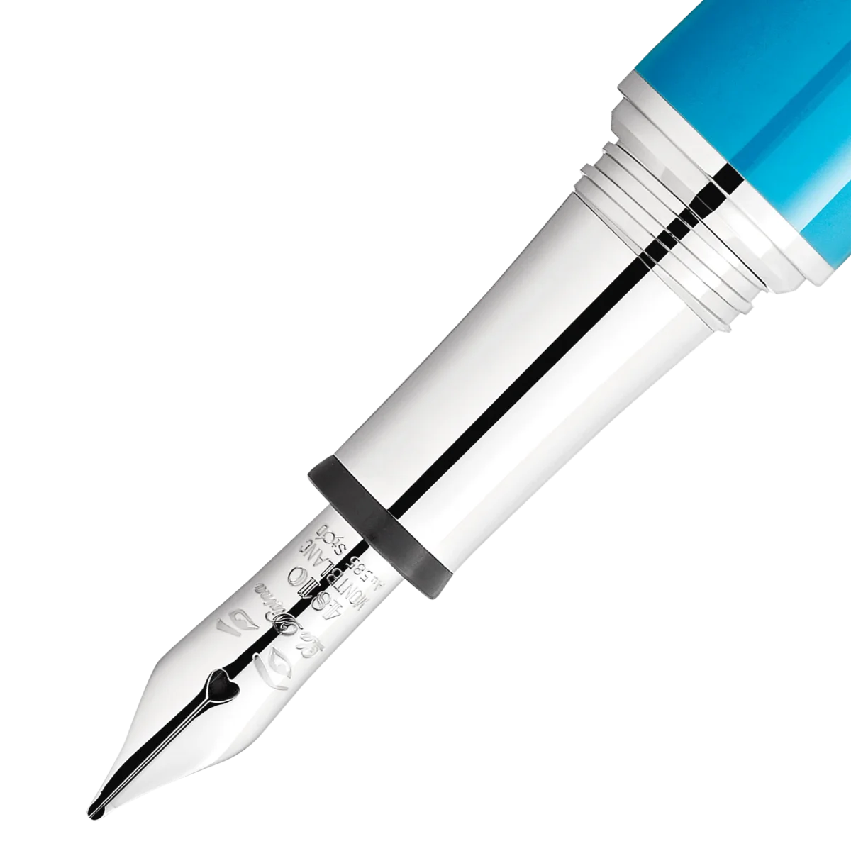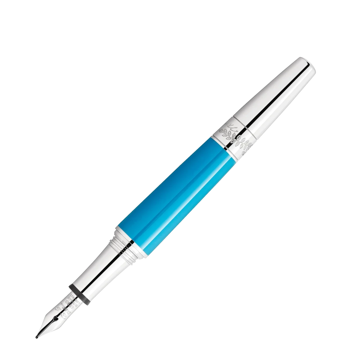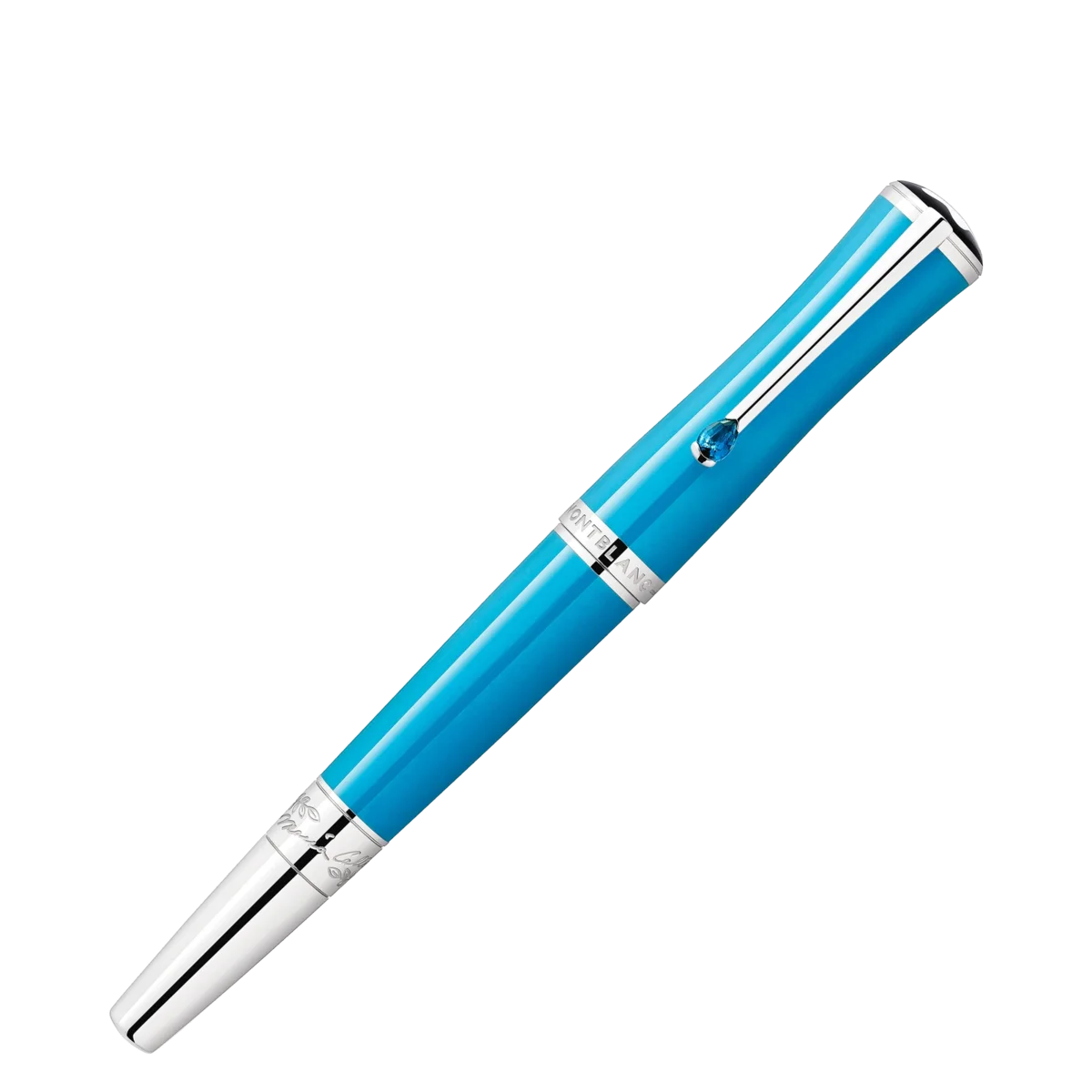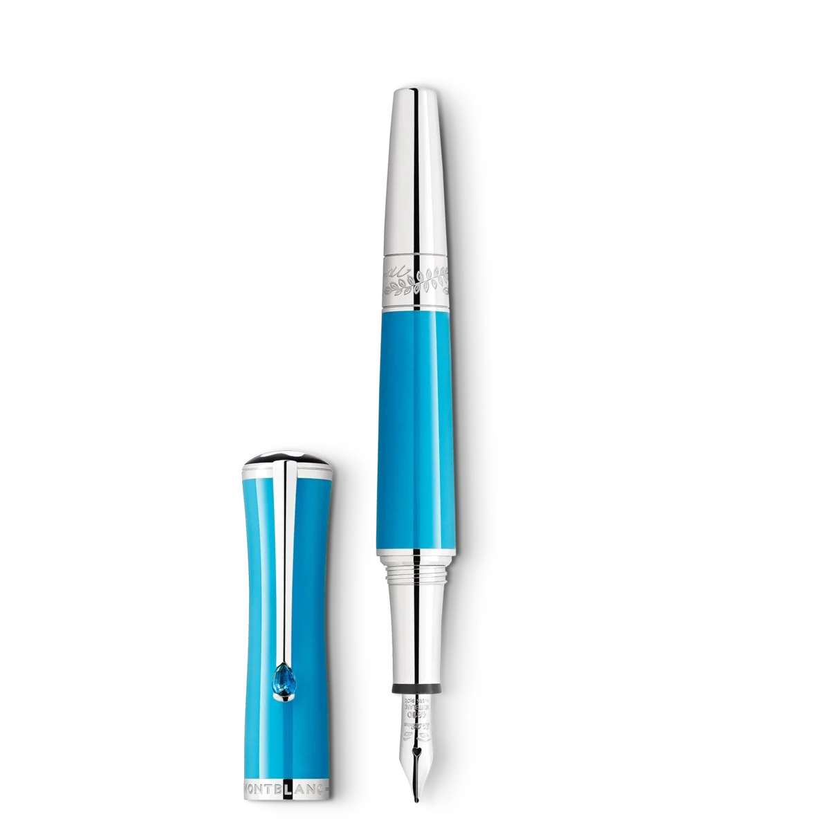 La edición especial Montblanc Maria Callas en color turquesa está dedicada a una de las sopranos más carismáticas del siglo XX y a un apreciado icono de estilo. Con su talento, pasión y personalidad, encarnó un cierto ideal de diva de la ópera. En algunos de los teatros de ópera más importantes del mundo, desde La Scala de Milán hasta la Ópera de París y la Ópera Metropolitana de Nueva York, se la conocía como «La Divina». La edición destaca uno de sus colores favoritos, el turquesa, en la preciosa resina del capuchón y el cuerpo, al tiempo que refleja la elegante belleza de Maria Callas en su silueta esbelta y elegante. En memoria de su patria griega rodeada por el mar, el clip recubierto de platino está decorado con una piedra cuyo color recuerda el radiante azul turquesa del mar Egeo. Un detalle del vestuario de uno de sus papeles más reconocibles del bel canto, «Norma» de Bellini, se refleja en un patrón de hojas de laurel que rodean el cono recubierto de platino de la edición, junto con la firma en relieve de la célebre soprano. La punta de oro macizo Au 585 recubierta de rodio, hecha a mano, está grabada con los ojos de gato delineados con kohl tan típicos de su imagen, así como con el nombre inseparable de Maria Callas: «La Divina».