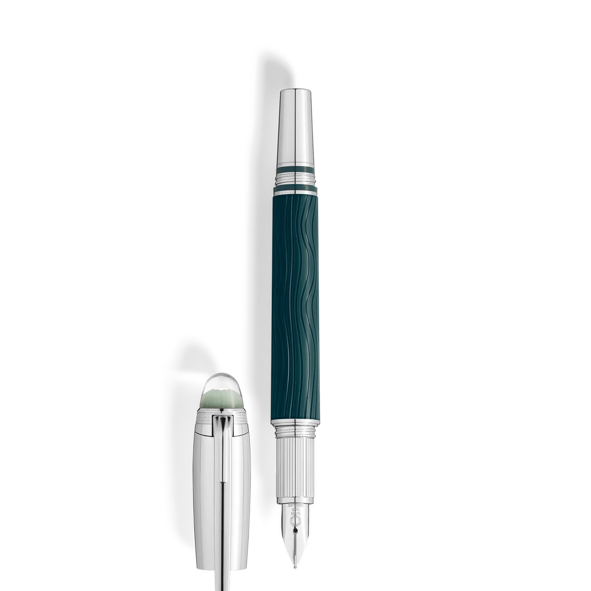 La colección StarWalker PolarGreen da vida a la belleza de la aurora boreal. En la Tierra, los seres humanos pueden contemplar el cielo y transportarse a reinos maravillosos mientras presencian su grandioso espectáculo. La cúpula de la parte superior del capuchón está hecha de resina transparente y brilla con poca luz, recordando las encantadoras auroras danzantes del cielo nocturno. El capuchón y los accesorios están recubiertos de platino. El patrón ondulado de la preciosa resina verde oscuro del cuerpo captura admirablemente el brillo espectral de las luces, y el acabado mate acentúa los reflejos. El plumín de oro Au585/14k, meticulosamente elaborado a mano, presenta un elegante revestimiento de rodio.